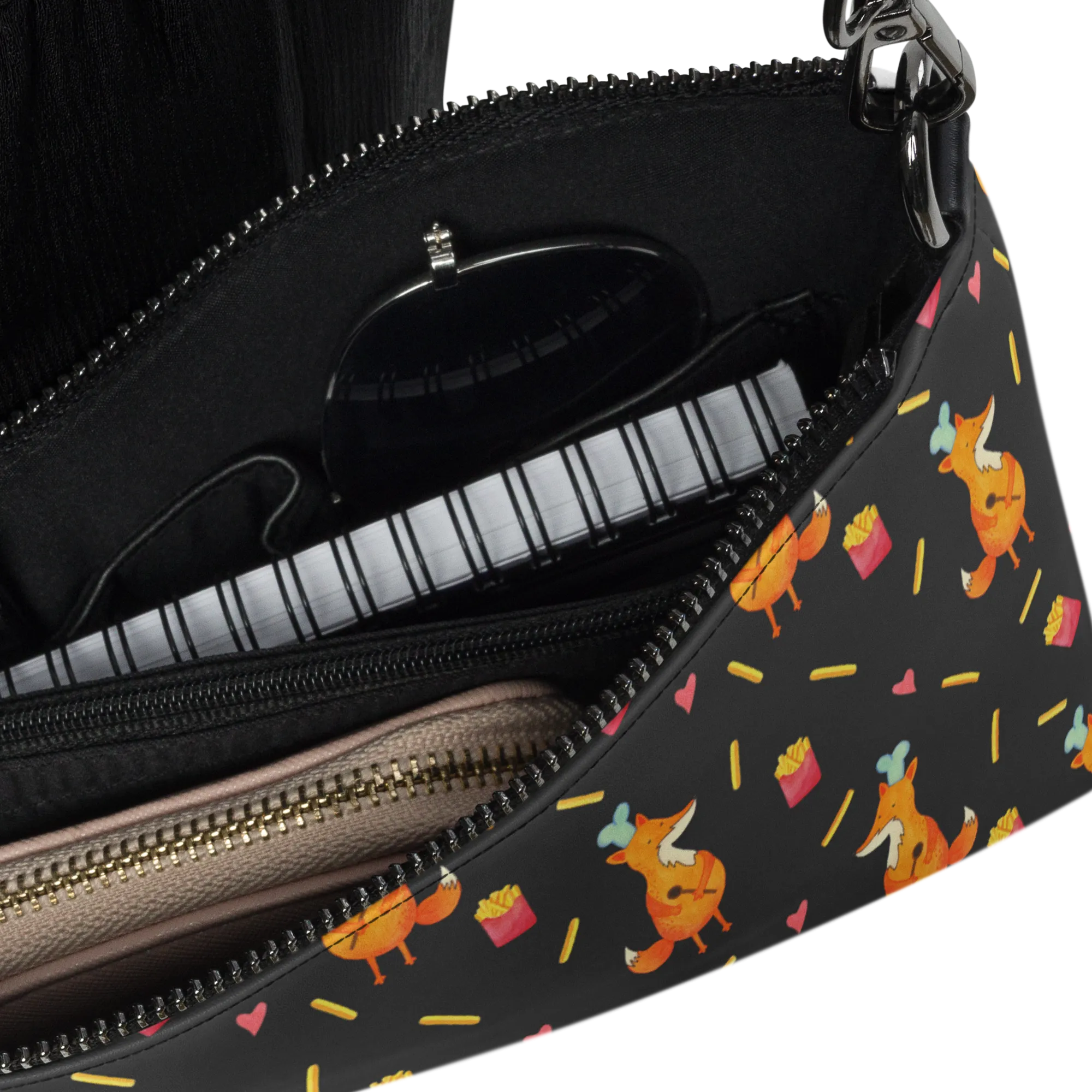 Die Henkeltasche besticht durch ein detailreiches Motiv: ein schelmischer Fuchs und knusprige Pommes im Allover-Druck. Dunkelgraue Beschläge und saubere Nähte geben der Tasche einen hochwertigen Look. Durch ihre kompakte Form eignet sie sich wunderbar als kleine Umhängetasche oder Abendtasche.