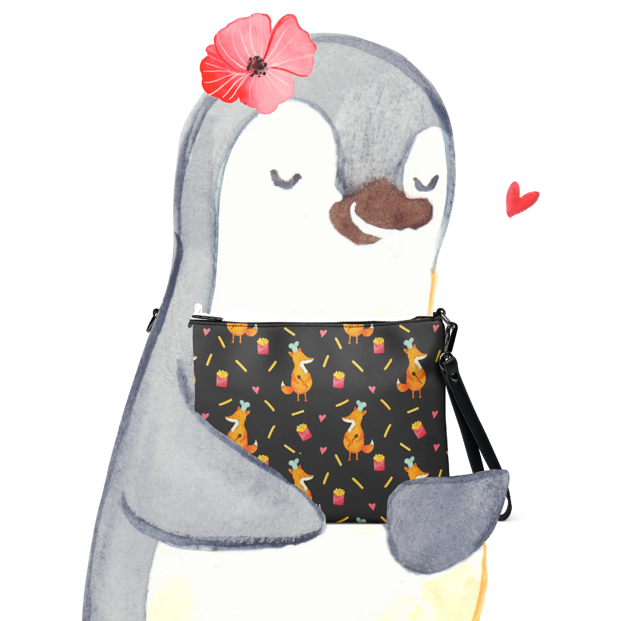 Suchst du eine Umhängetasche Damen, die auffällt und gleichzeitig praktisch ist? Unsere kleine Handtasche aus der Mrs. Panda Kollektion vereint verspieltes Design mit cleverer Funktionalität. Das fröhliche Fuchs Muster kombiniert mit Pommes Frites sorgt für gute Laune und macht die Tasche zum perfekten Begleiter für Alltag, Freizeit und besondere Anlässe.