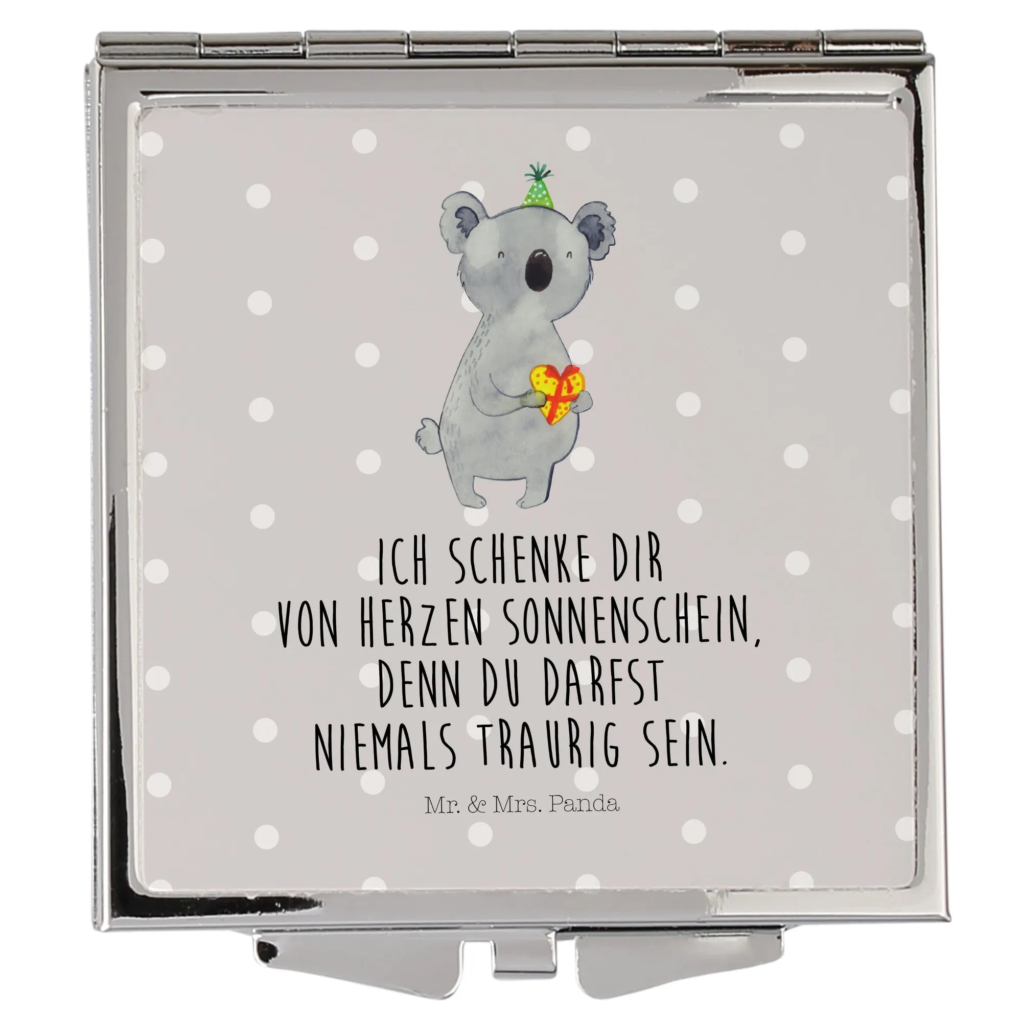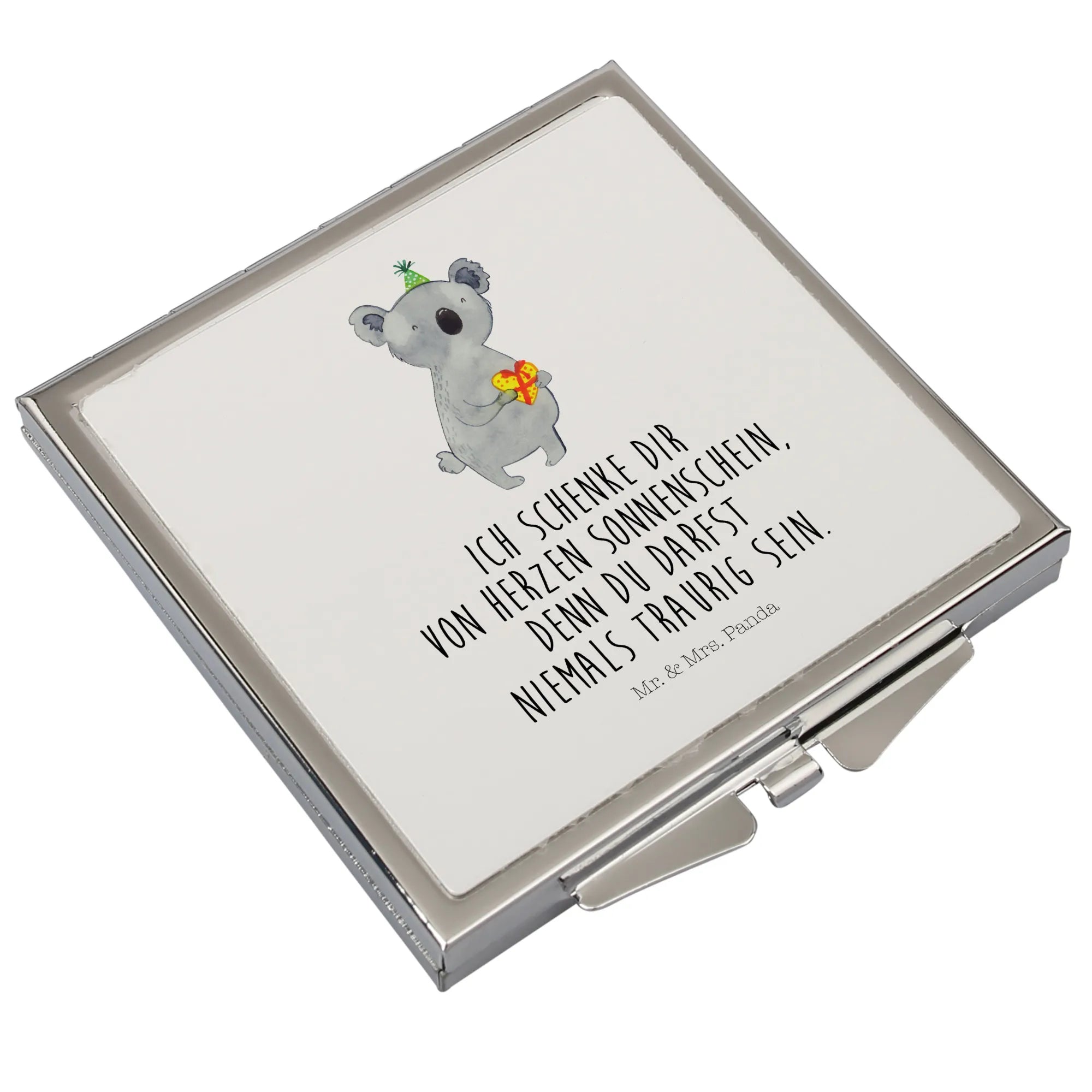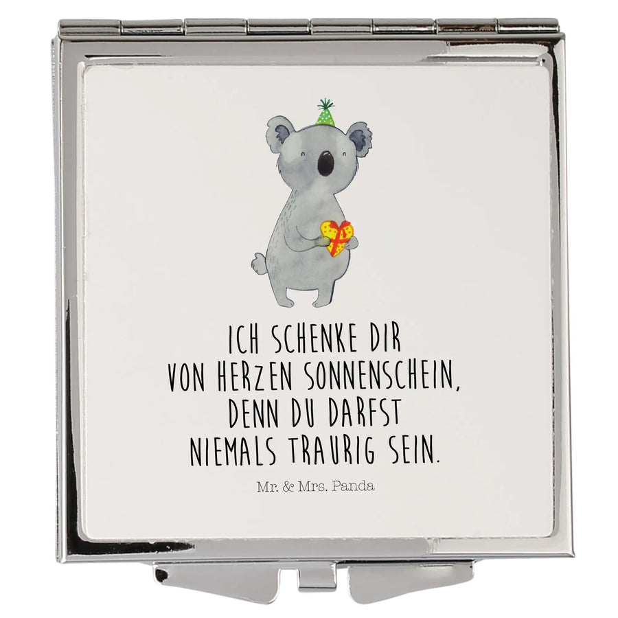 Ein kleiner Spiegel voller Charme: Unser quadratischer Handtaschenspiegel mit dem süßen Koala-Motiv aus der Koala-Kollektion von Mr. & Mrs. Panda zaubert sofort gute Laune. Der niedliche Koala mit Partyhut und Geschenk in Herzform macht den Kompaktspiegel zur perfekten Geschenkidee für Geburtstage, Partys oder als liebevolles Mitbringsel.