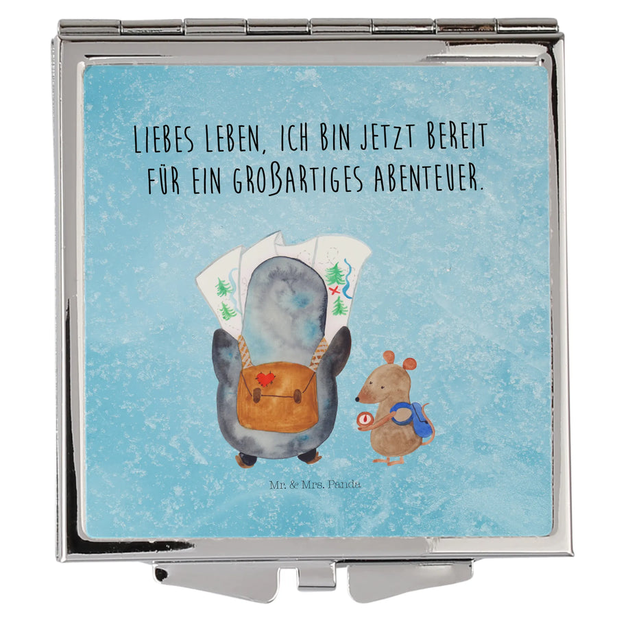 Handtaschenspiegel quadratisch Pinguin & Maus Wanderer - mit Spruch - Eisblau
