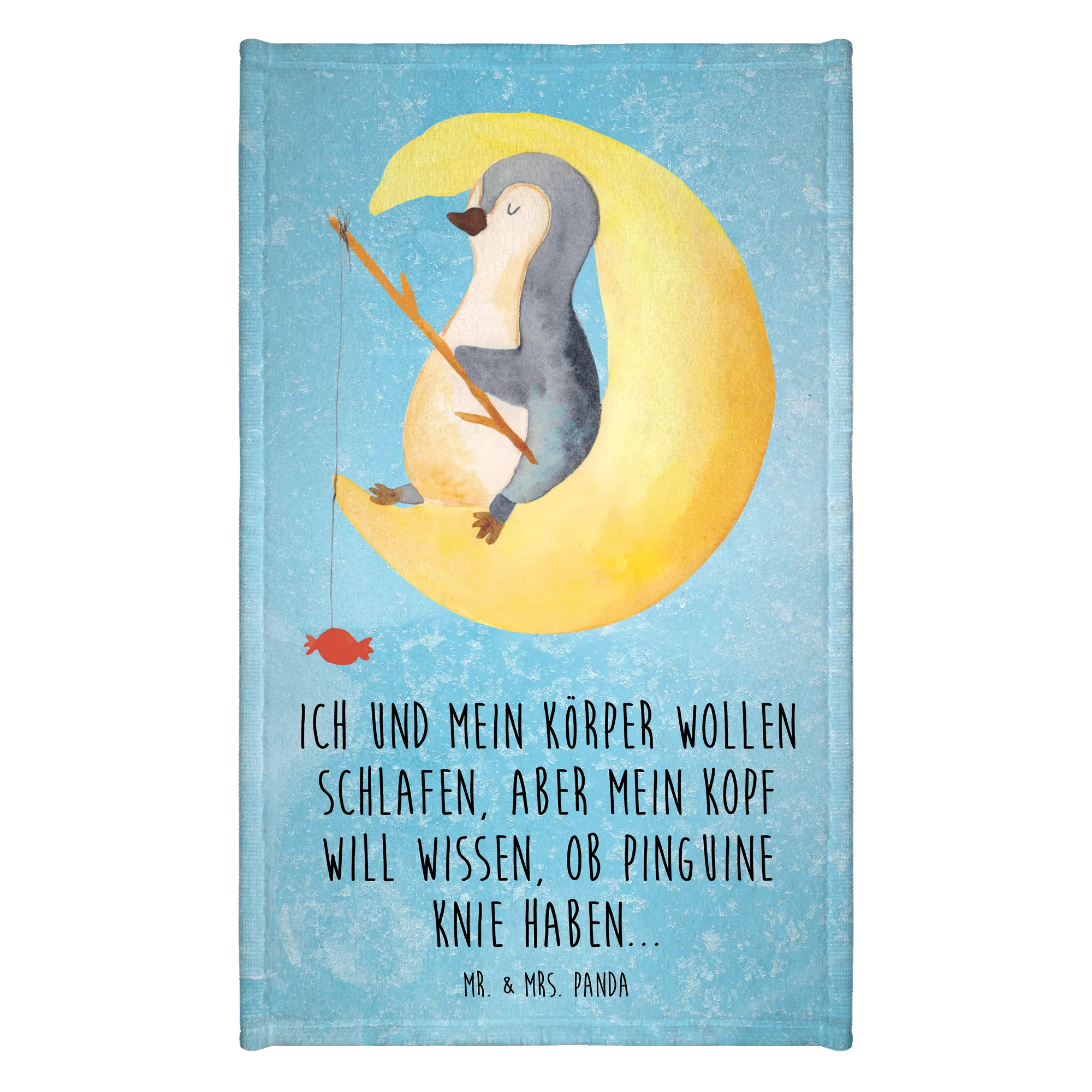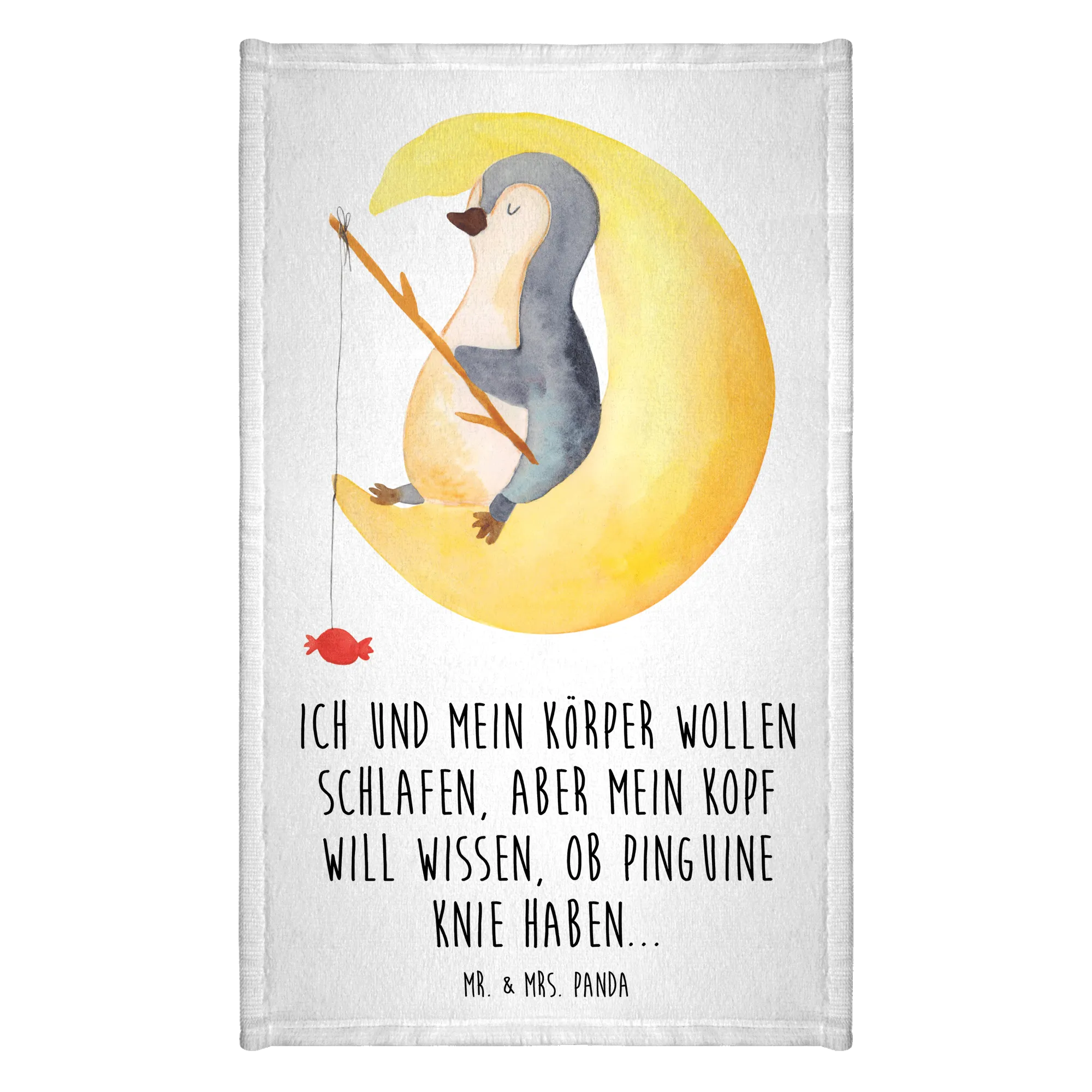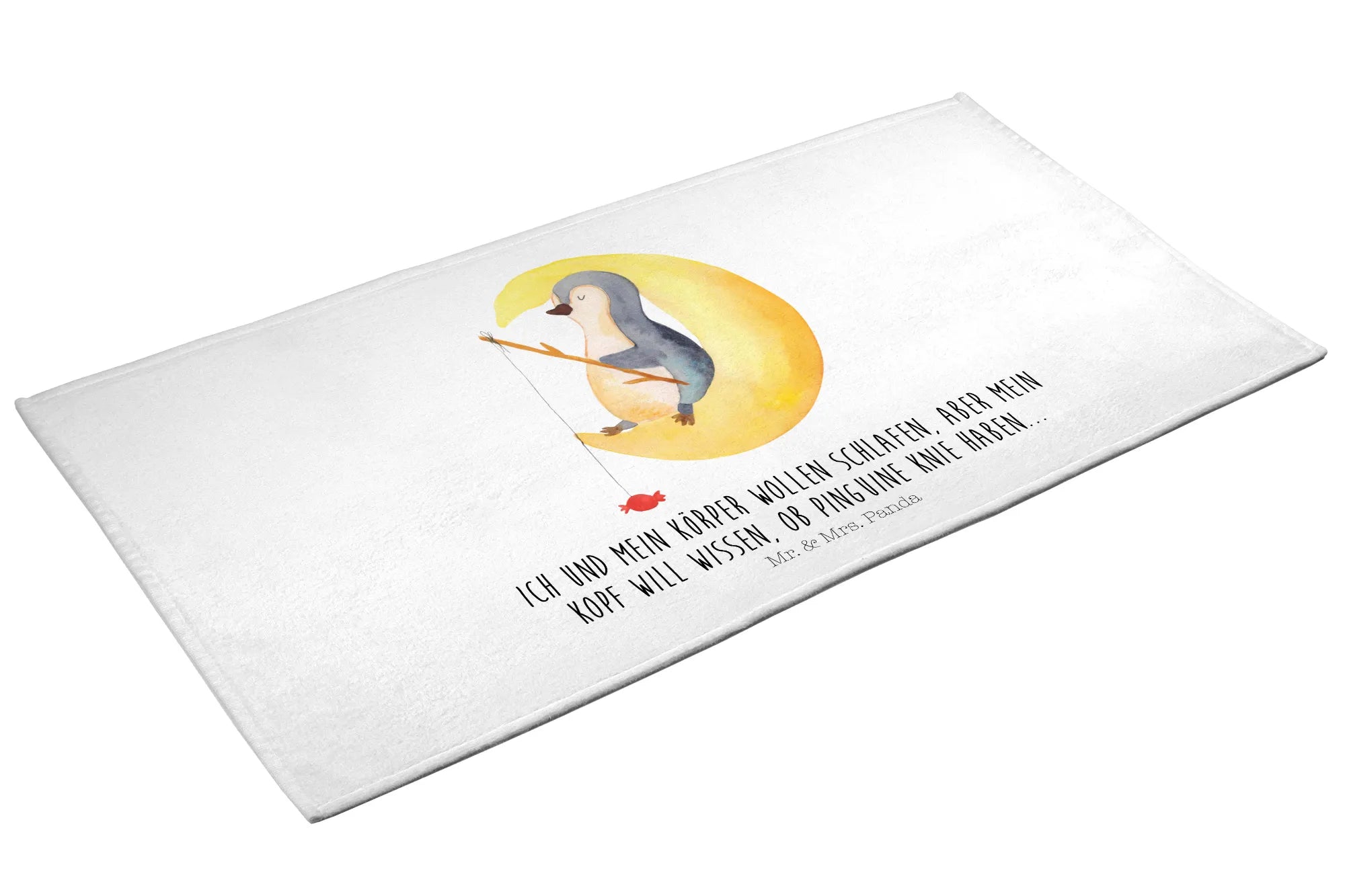 Dieses Handtuch ist die perfekte Geschenkidee für frischgebackene Eltern oder für Kinder, die die Welt der Pinguine lieben. Es ist ebenfalls ein tolles Mitbringsel für Gäste, die sich in deinem Badezimmer wohlfühlen sollen. Warum also nicht ein wenig Pinguin-Magie verschenken? Unsere Pinguin-Kollektion bietet viele weitere Produkte, die das Herz höher schlagen lassen. Mit liebevollen Sprüchen und liebevoll handgezeichneten Motiven, wie "Ich und mein Körper wollen schlafen, aber mein Kopf will wissen, ob Pinguine Knie haben...", sorgt das Handtuch dafür, dass die Nachtruhe gleich viel schöner wird.