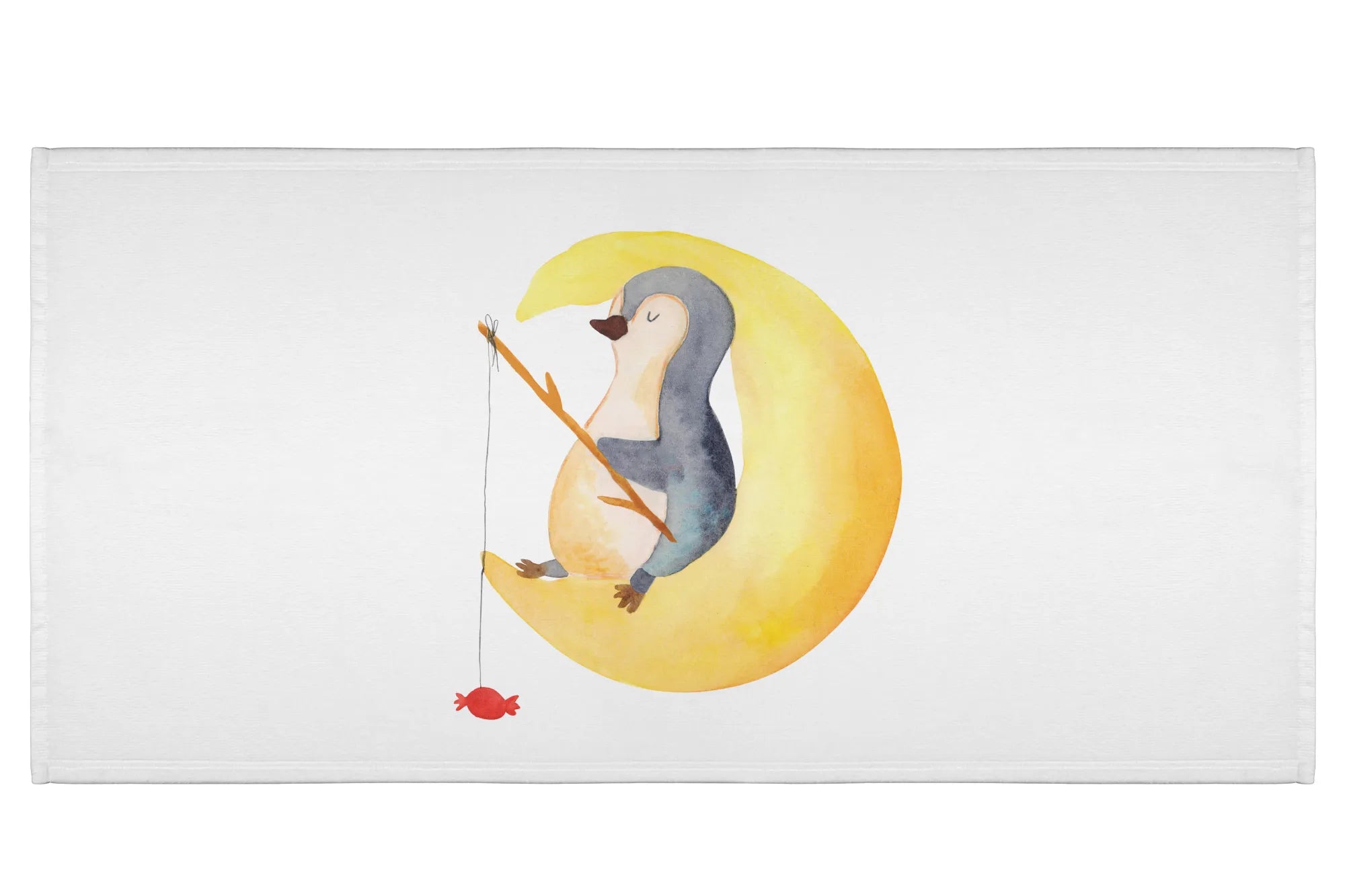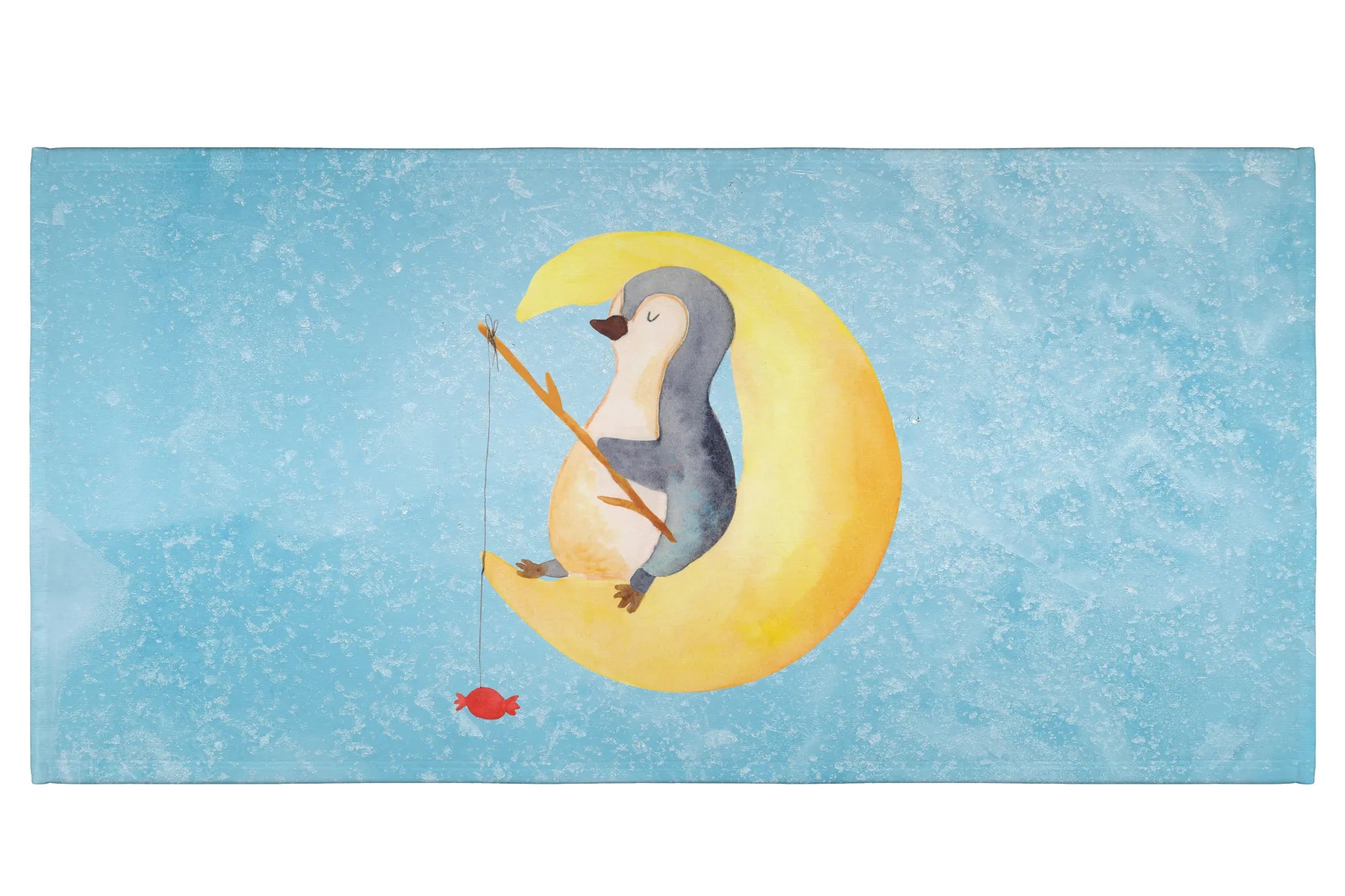 Der Pinguin, der es sich entspannt auf einer Mondsichel gemütlich gemacht hat und mit einer Angel nach Sternen angelt – an der Angel hängt ein Bonbon – ist nicht nur ein echter Hingucker, sondern vermittelt sofort ein Gefühl von Geborgenheit und Traumwelt. Dieses großartige Handtuch ist ideal für Kinder, die beim Schlafen dazu neigen, viel zu träumen und sicher auch manchmal auf kreative Weise über Pinguine nachdenken.