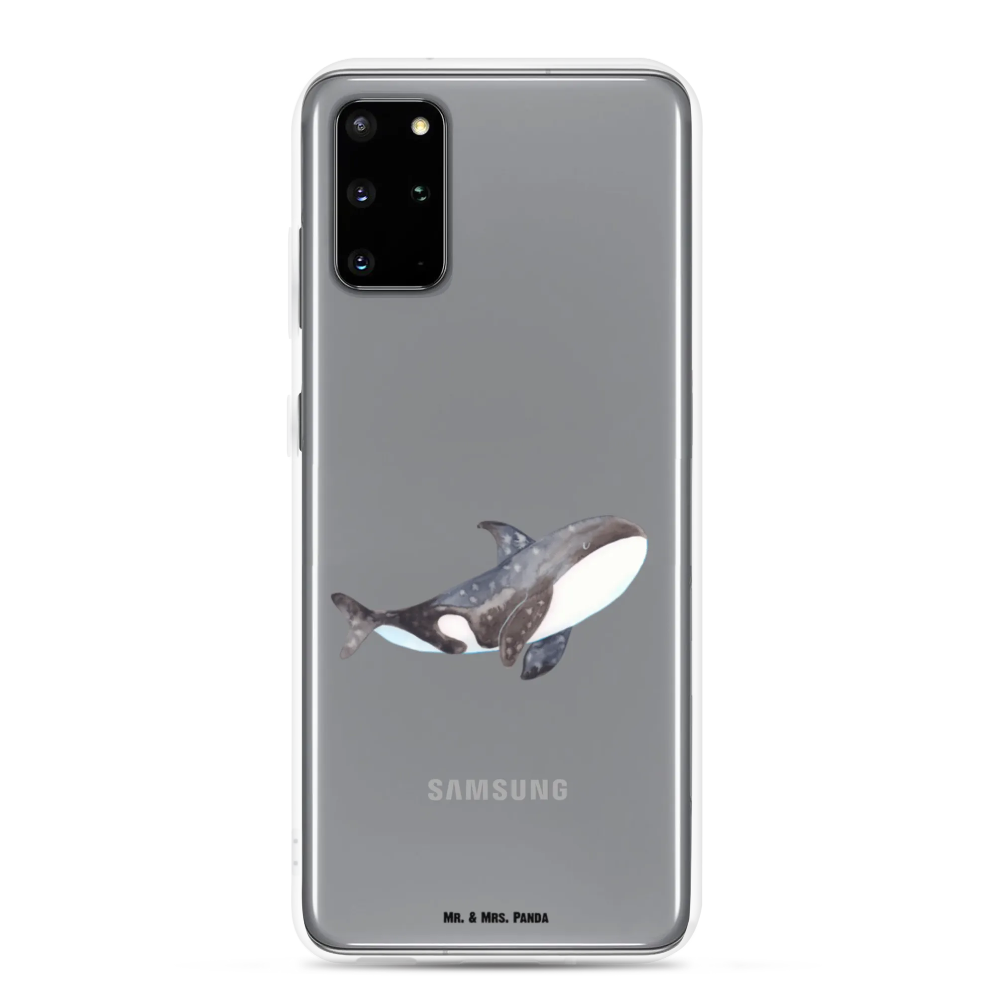 Mr. & Mrs. Panda präsentiert: Die transparente Handyhülle mit bezauberndem Orca aus der Meerestiere-Kollektion. Der Orca wurde liebevoll in Aquarell-Optik gezeichnet und strahlt in beruhigenden Grau- und Blautönen. Sein sanftes Lächeln macht diese Schutzhülle zu einem Begleiter voller Ruhe, Motivation und Selbstliebe.