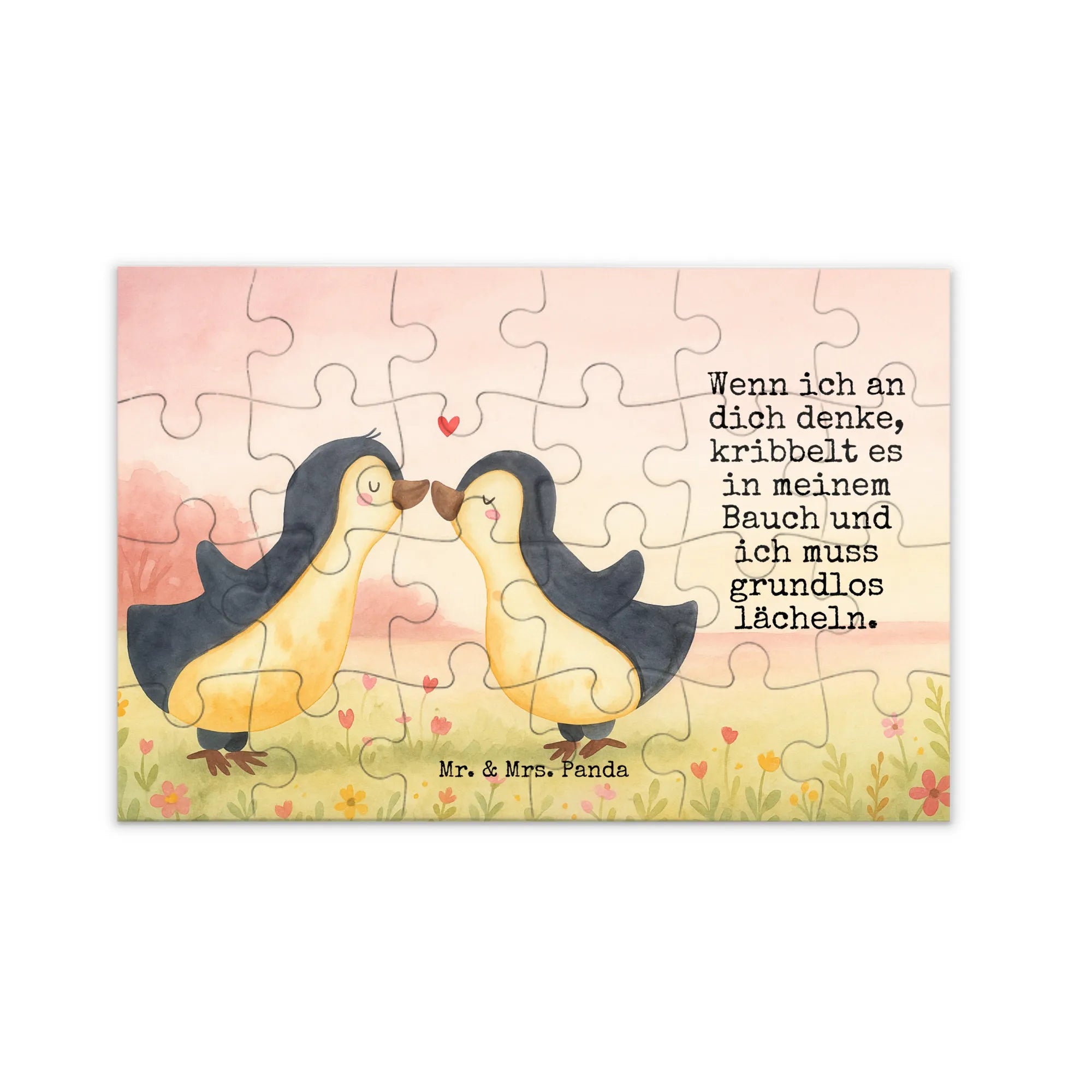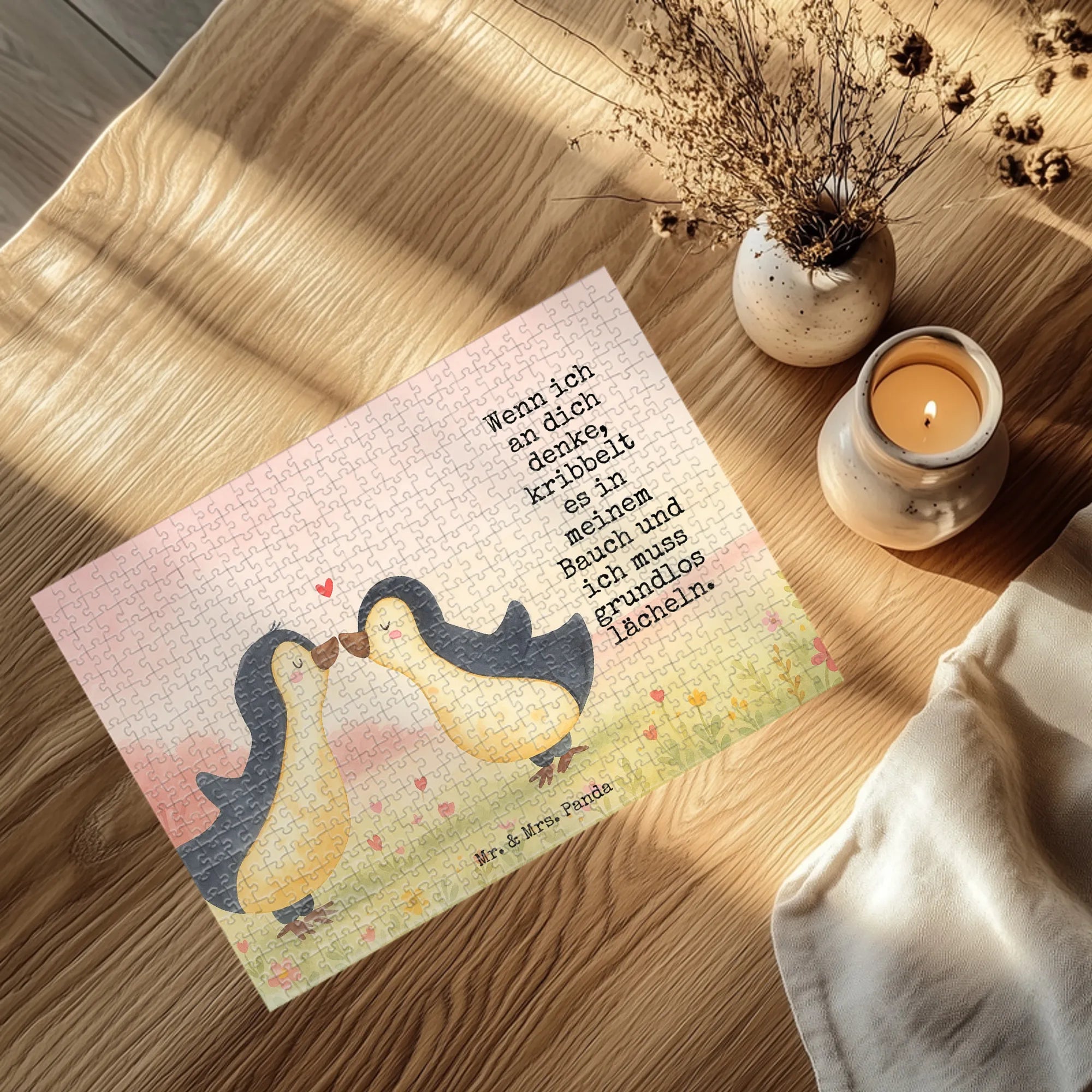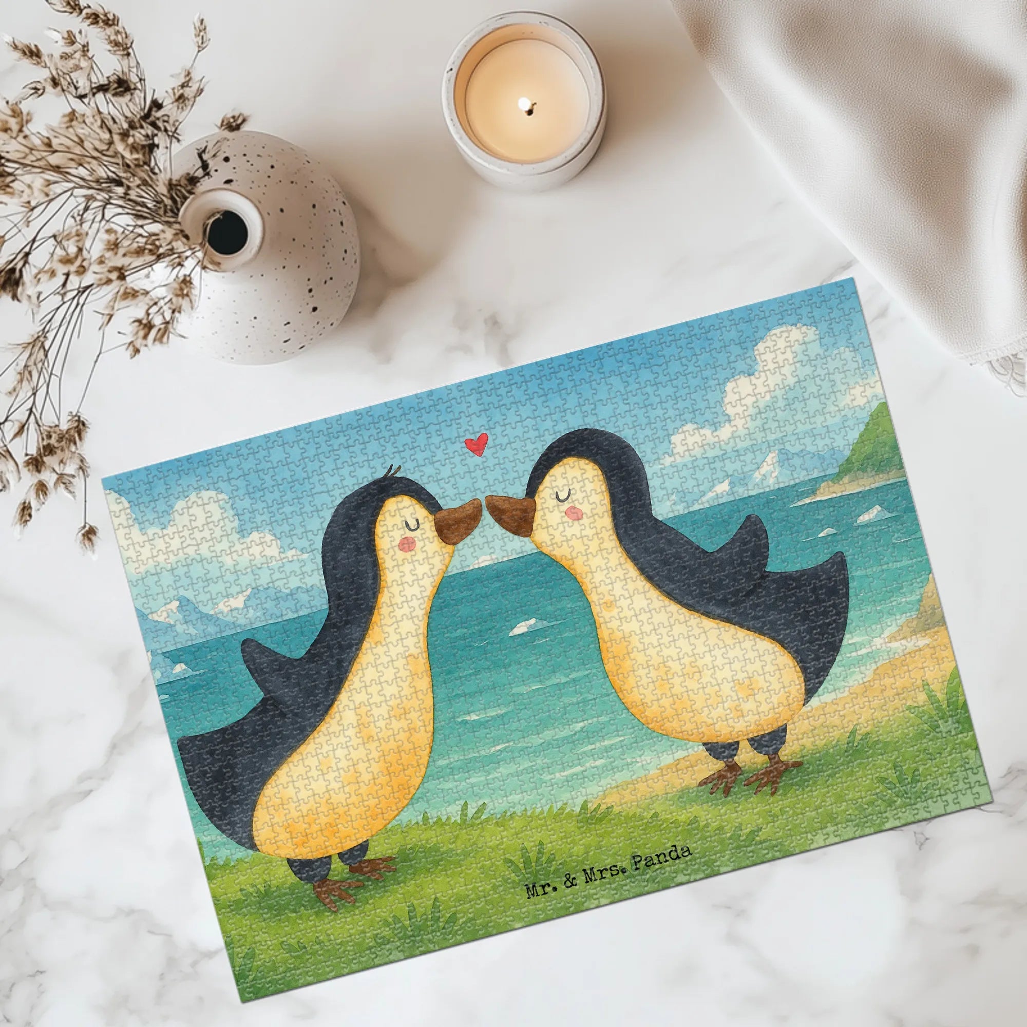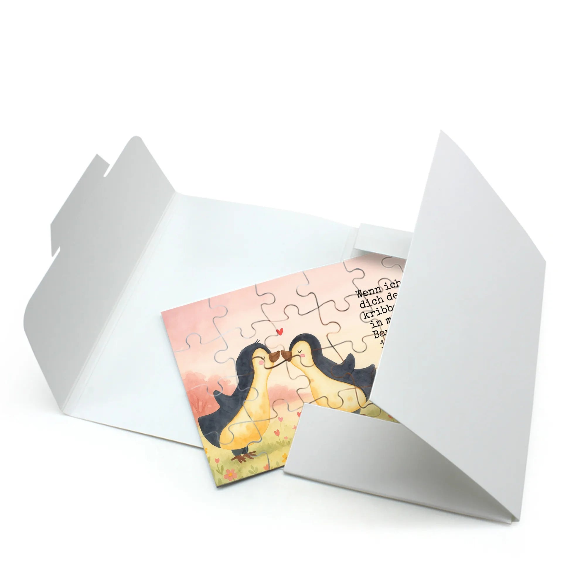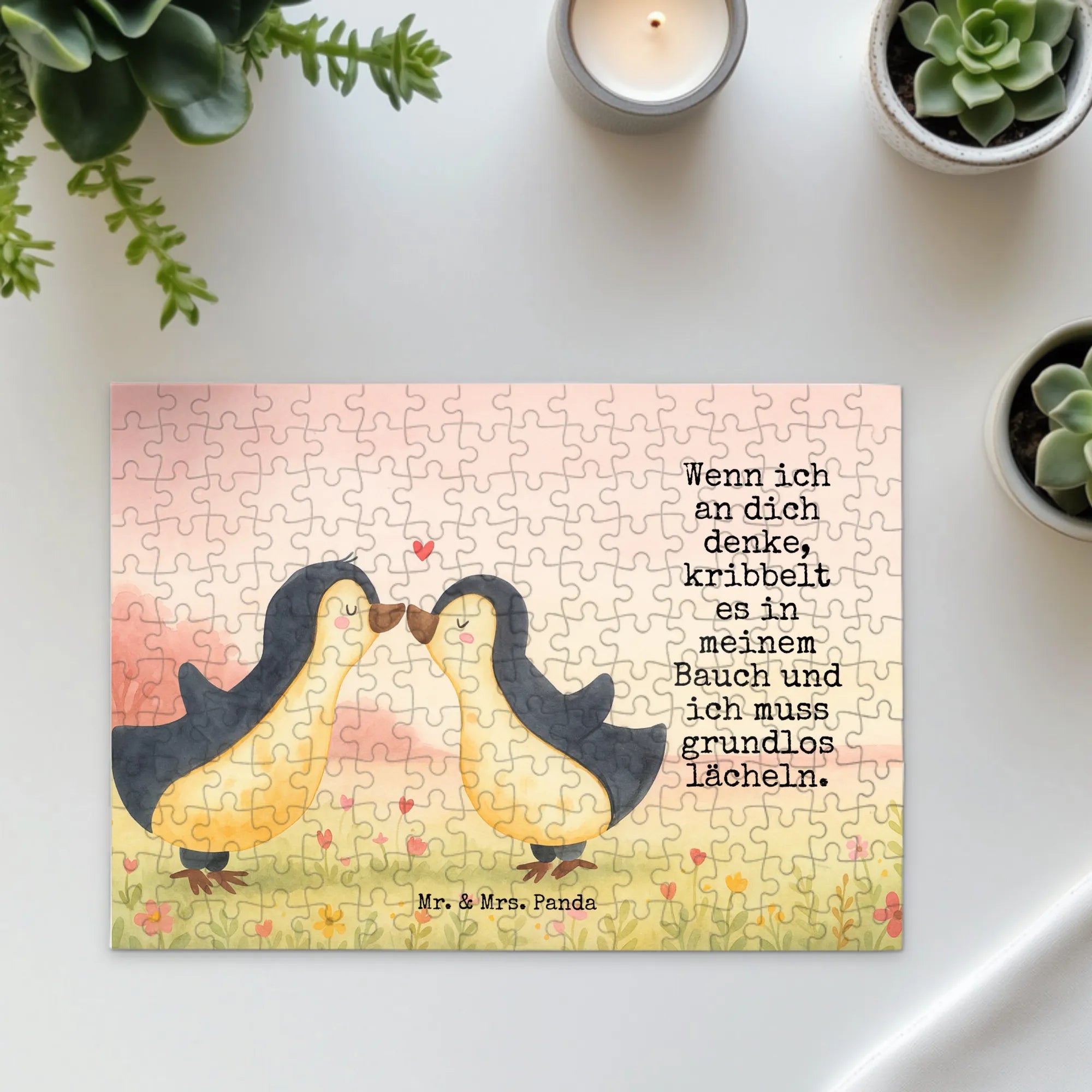 Pinguine Kuss – das perfekte Liebespuzzle von Mr. & Mrs. Panda. Zwei Pinguine, die sich aneinanderschmiegen und einen zarten Kuss austauschen. Ihre geschlossenen Augen, die warmen Gelb- und Grautöne und das kleine Herz zwischen ihnen versprühen Nähe, Zärtlichkeit und Geborgenheit. Dieses Motiv aus der Kollektion „Liebe“ ist wie gemacht für romantische Momente zu zweit.