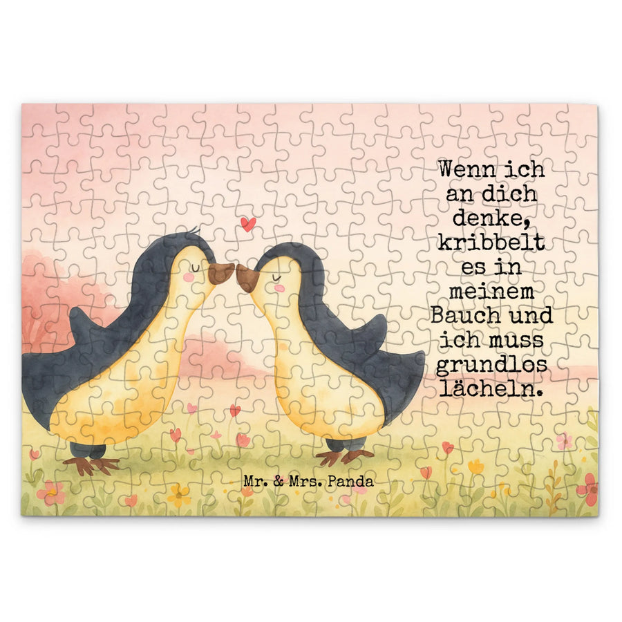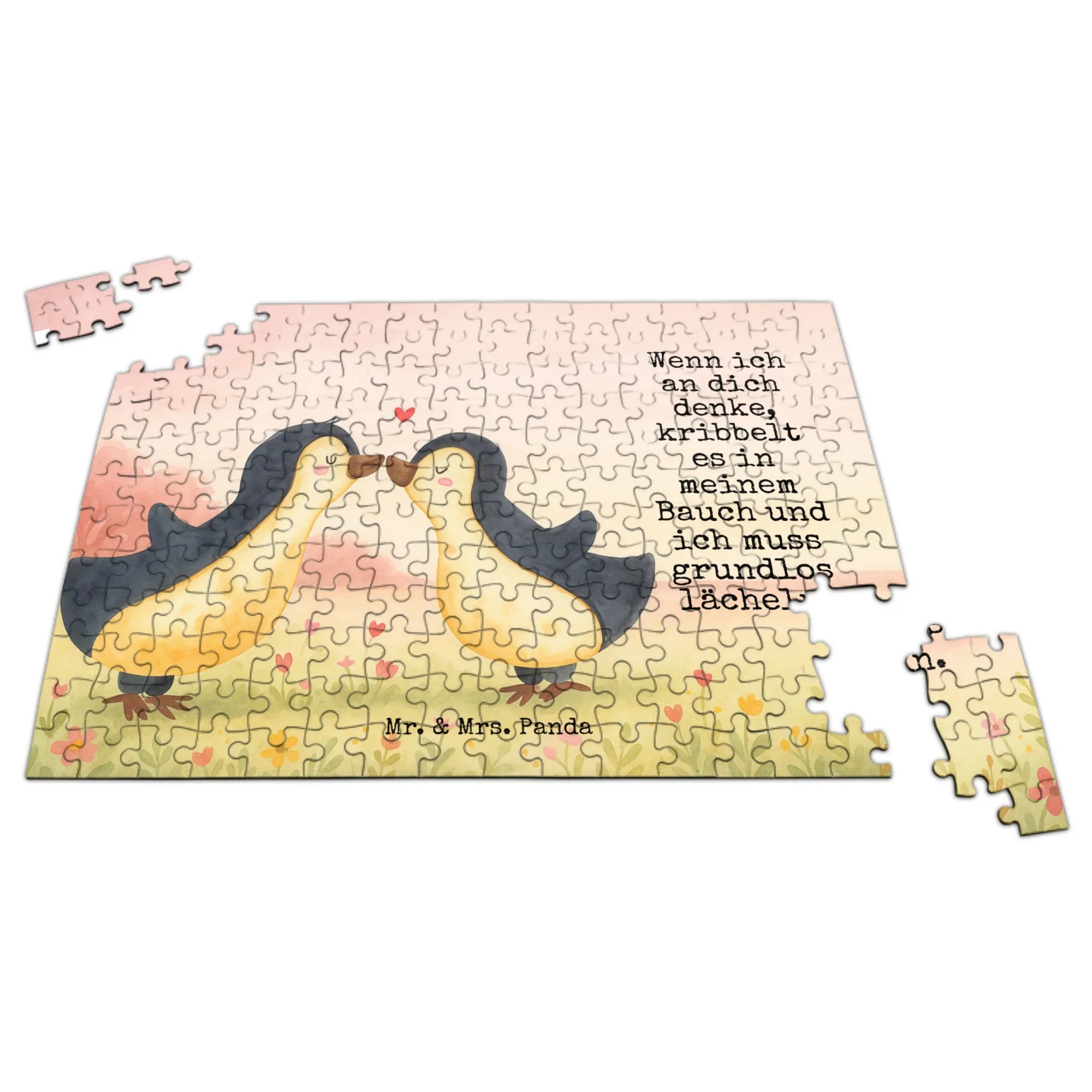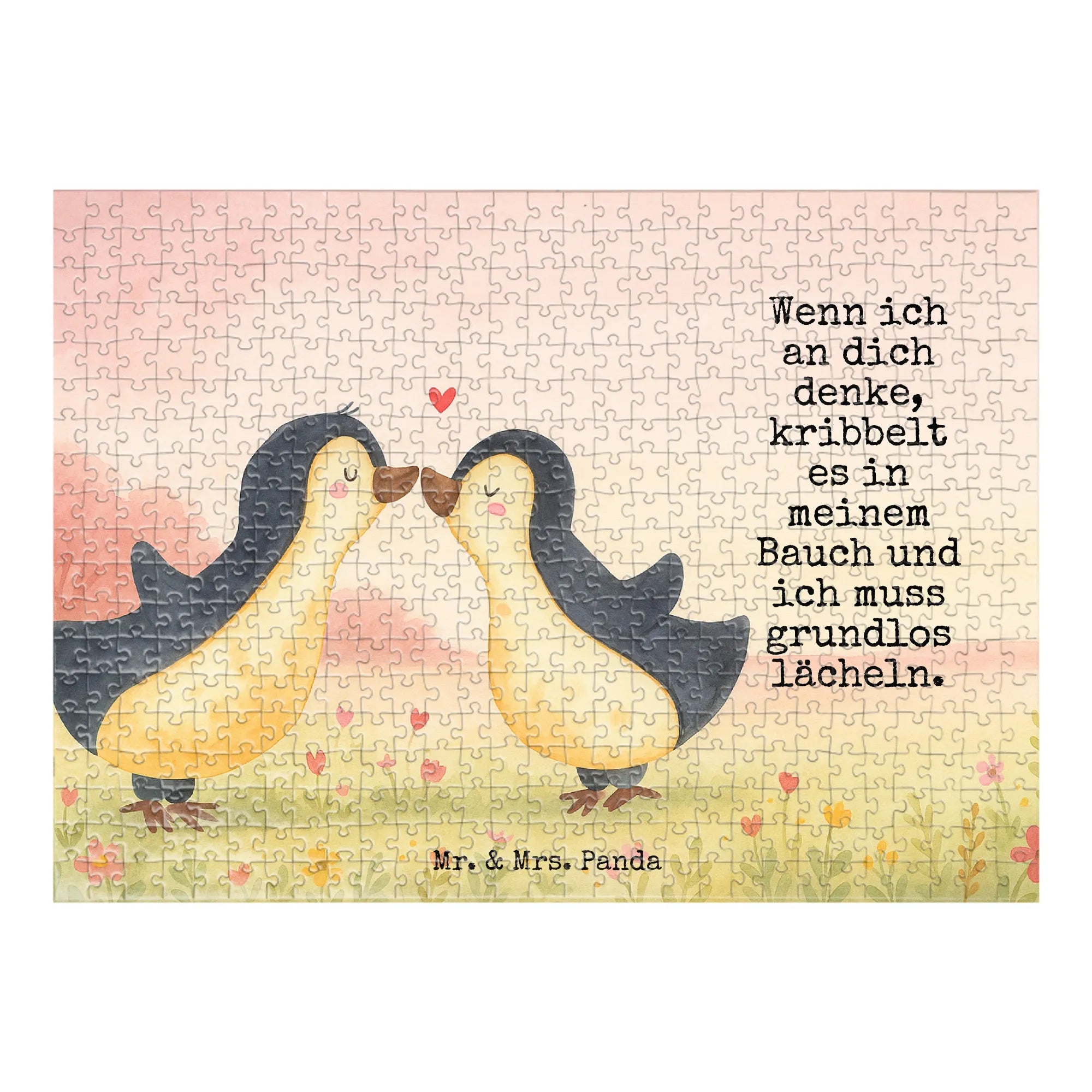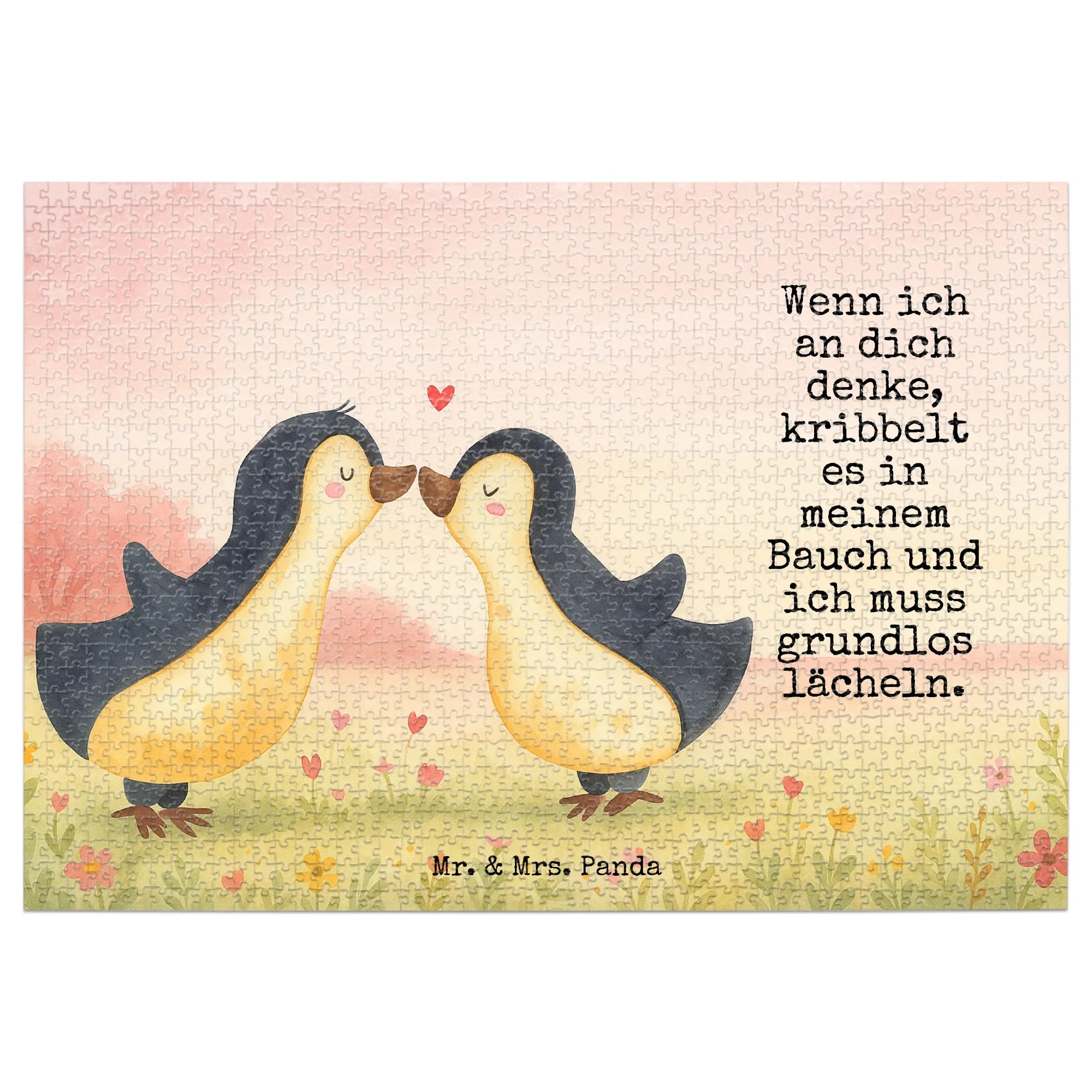 Pinguine Kuss – das perfekte Liebespuzzle von Mr. & Mrs. Panda. Zwei Pinguine, die sich aneinanderschmiegen und einen zarten Kuss austauschen. Ihre geschlossenen Augen, die warmen Gelb- und Grautöne und das kleine Herz zwischen ihnen versprühen Nähe, Zärtlichkeit und Geborgenheit. Dieses Motiv aus der Kollektion „Liebe“ ist wie gemacht für romantische Momente zu zweit.