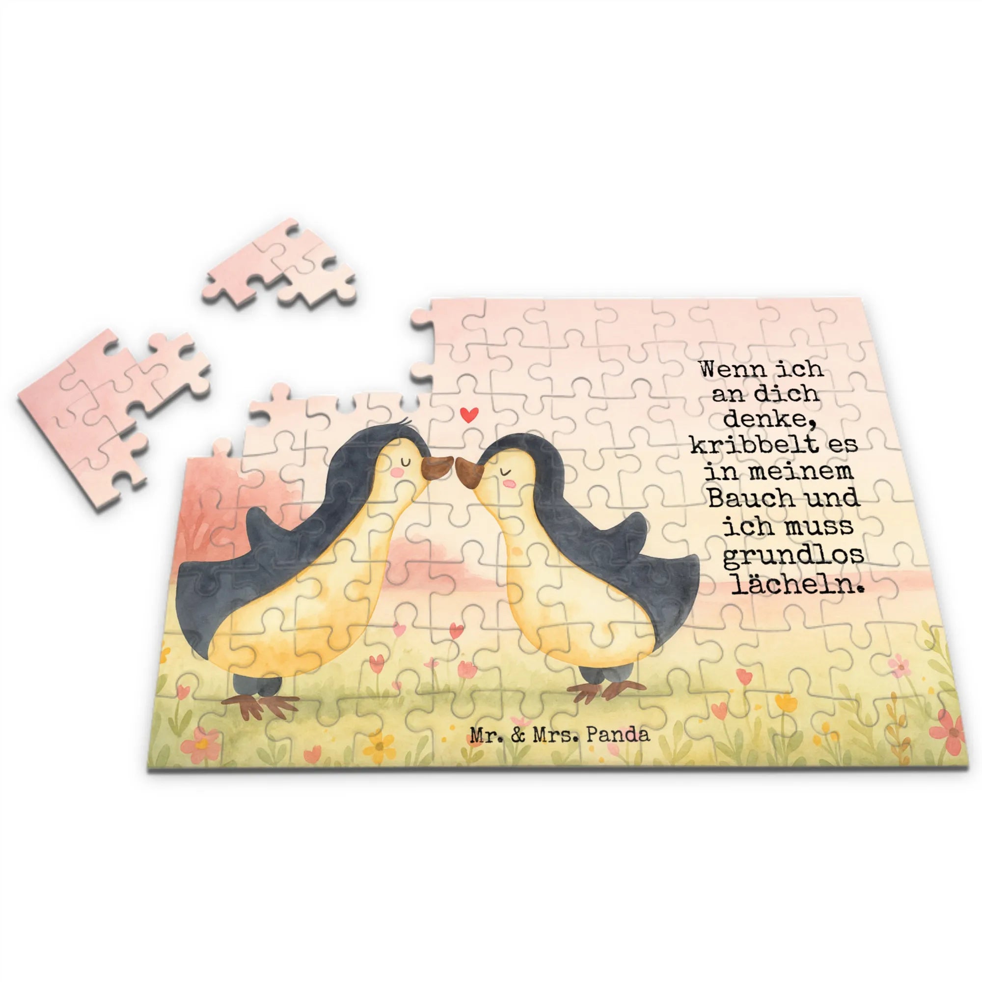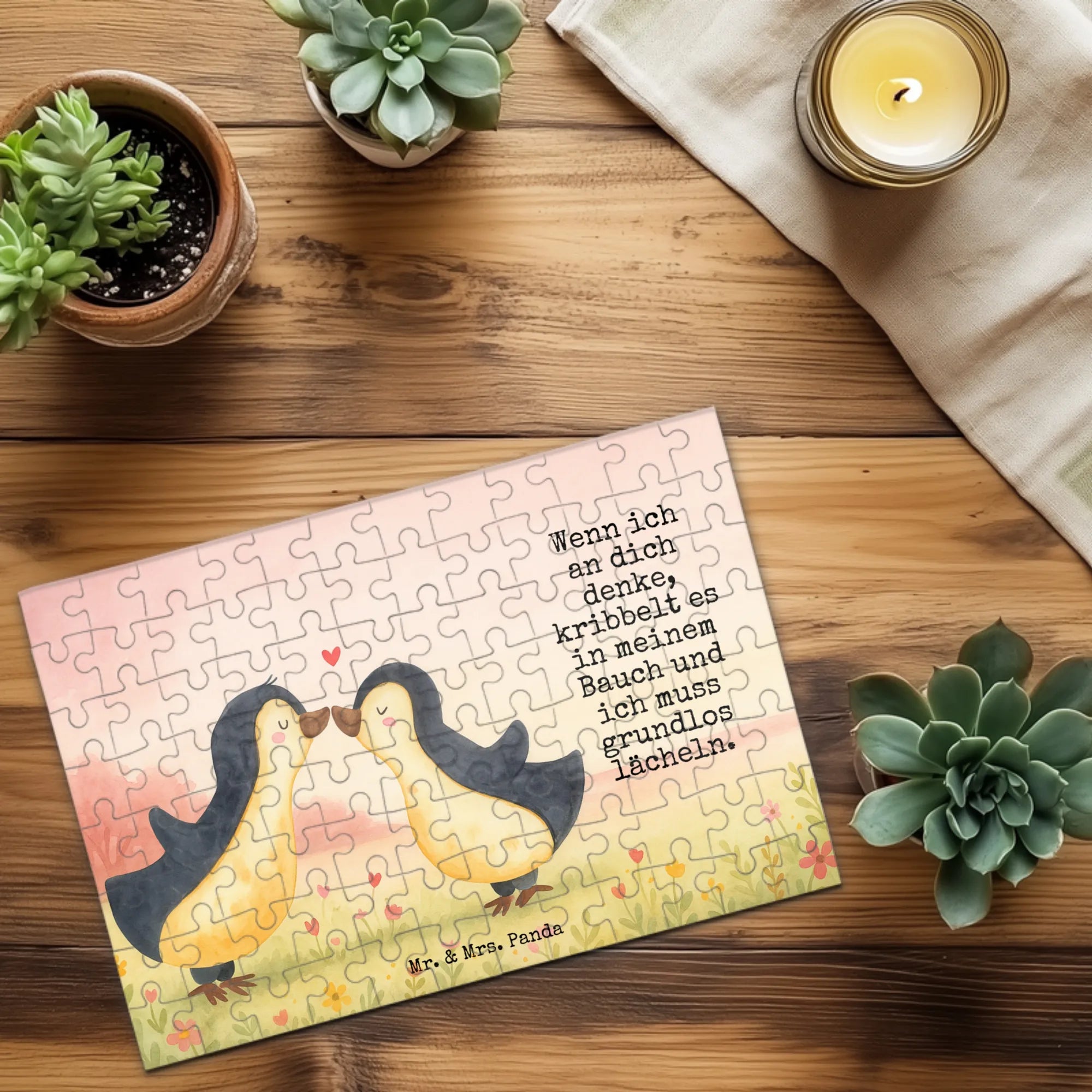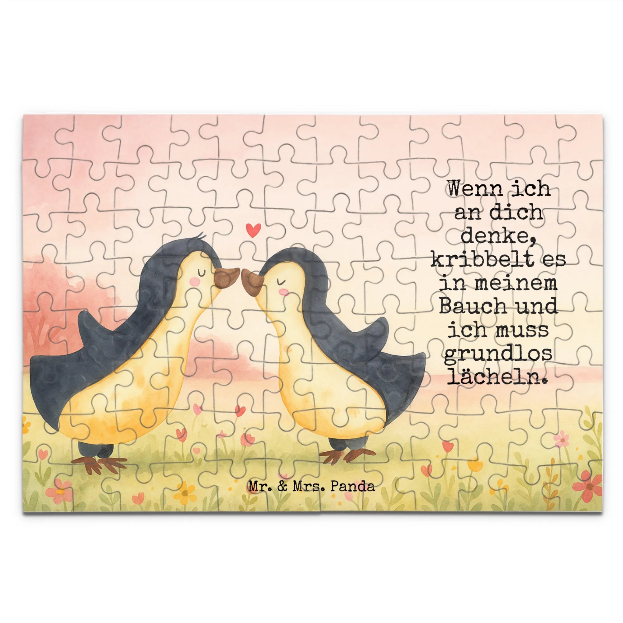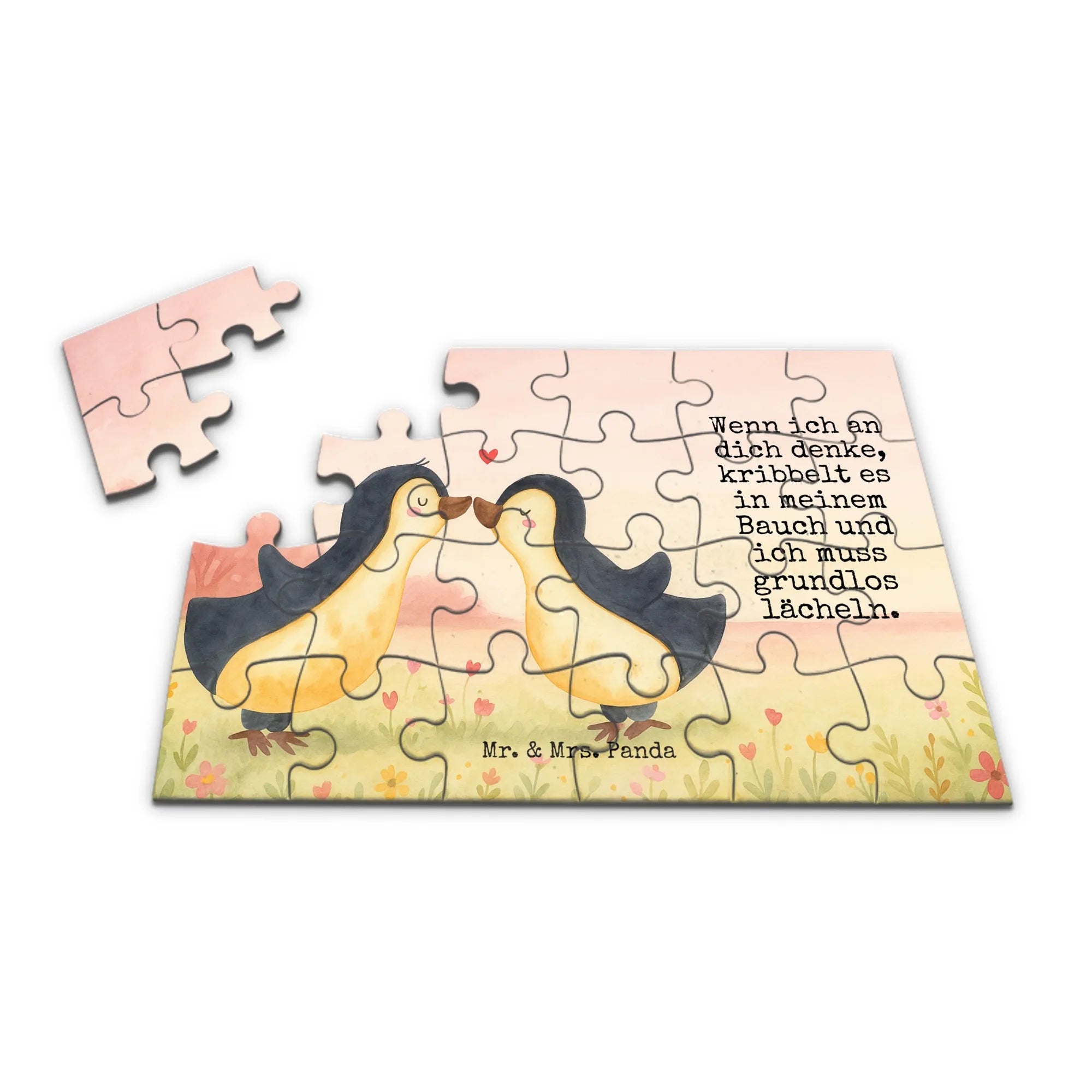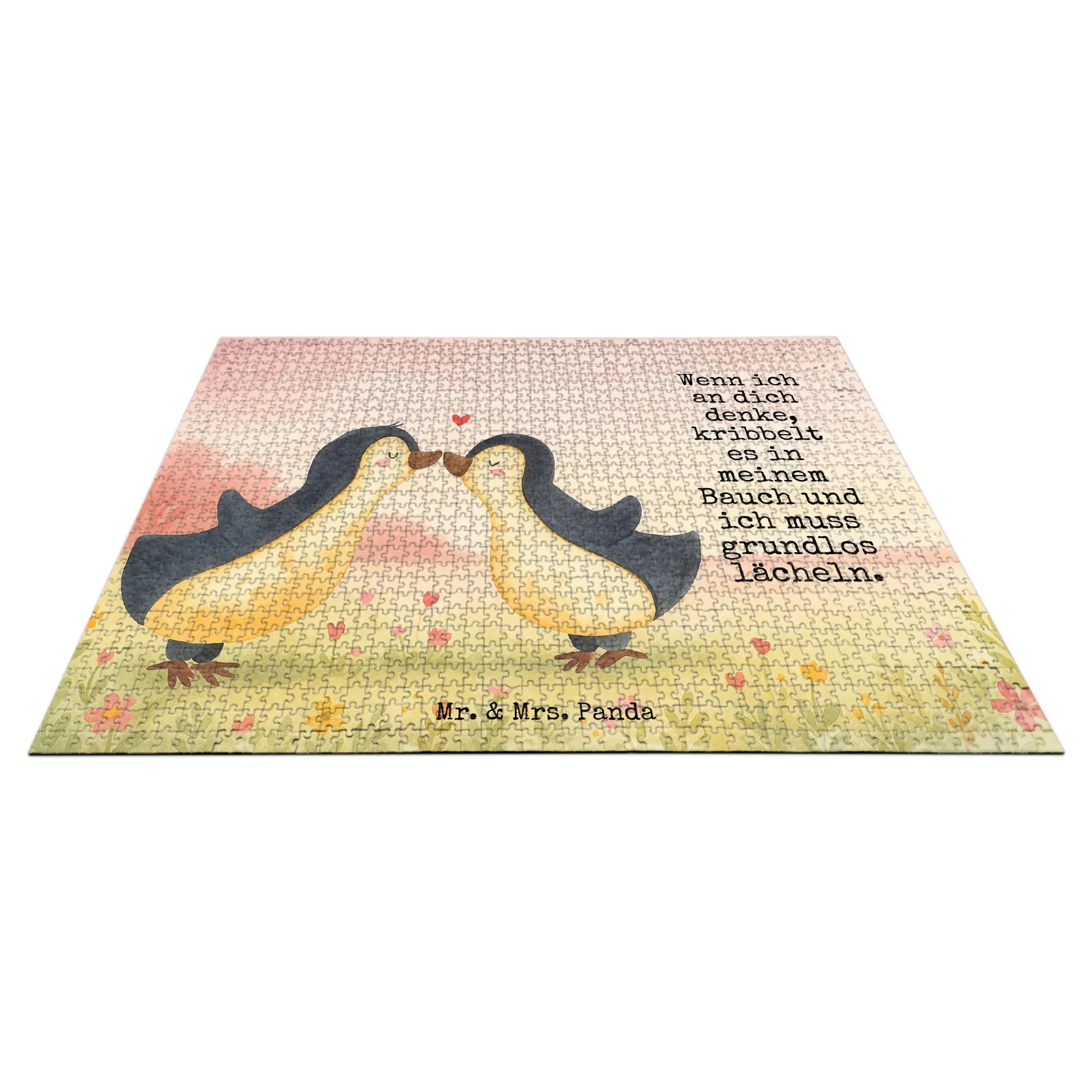 Pinguine Kuss – das perfekte Liebespuzzle von Mr. & Mrs. Panda. Zwei Pinguine, die sich aneinanderschmiegen und einen zarten Kuss austauschen. Ihre geschlossenen Augen, die warmen Gelb- und Grautöne und das kleine Herz zwischen ihnen versprühen Nähe, Zärtlichkeit und Geborgenheit. Dieses Motiv aus der Kollektion „Liebe“ ist wie gemacht für romantische Momente zu zweit.