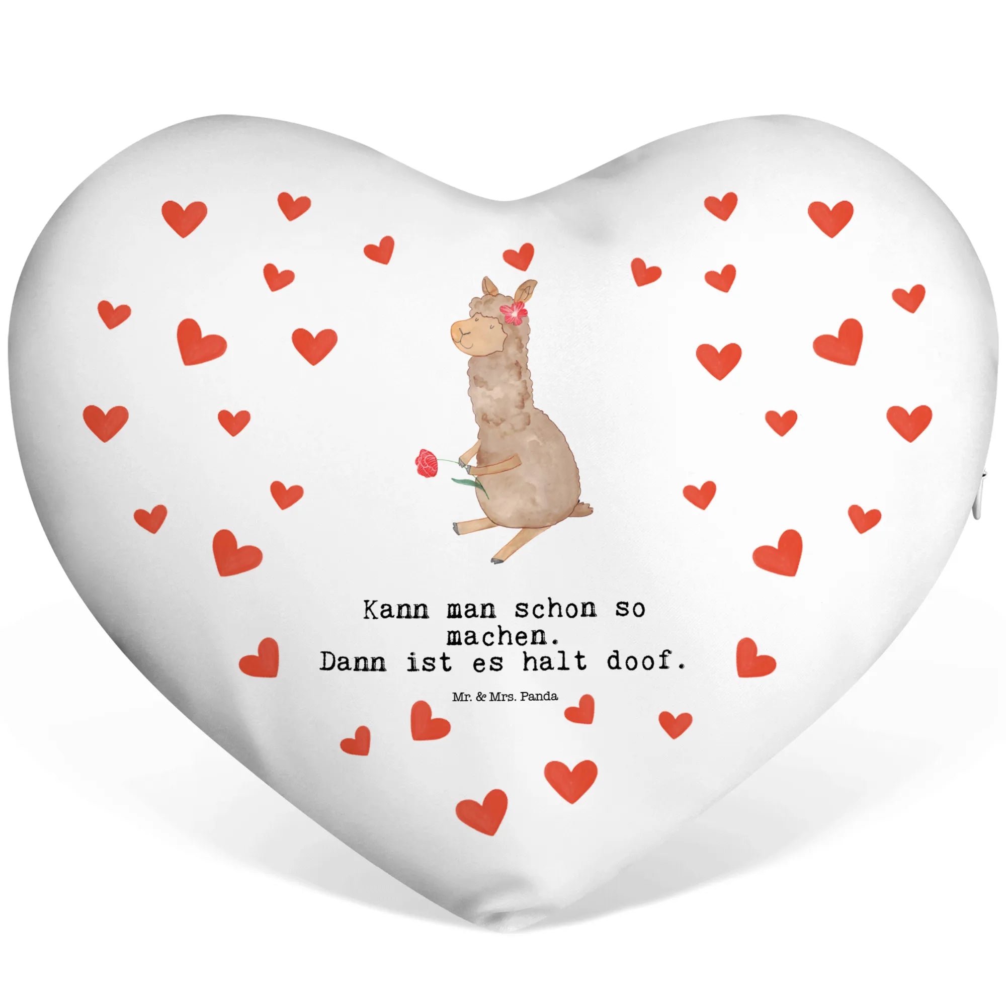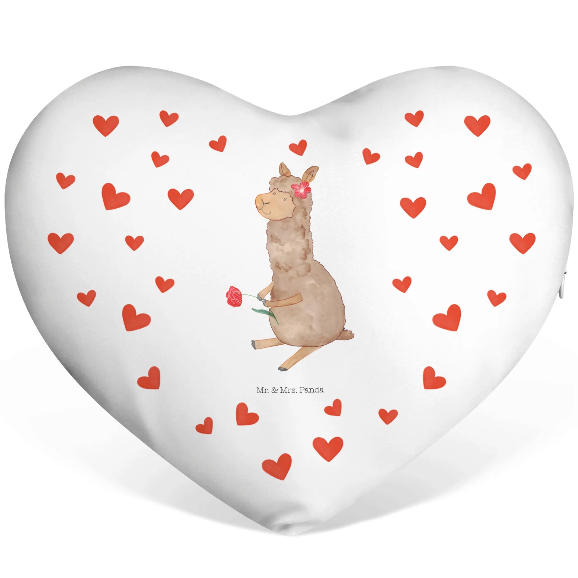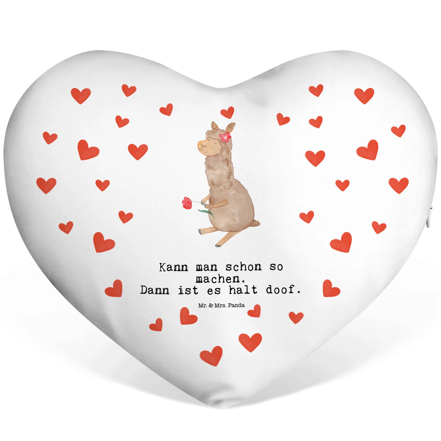 Das Herzkissen Alpaka Blume von Mr. & Mrs. Panda ist der perfekte Begleiter für jeden Anlass und ein zauberhaftes Geschenk für große und kleine Tierfreunde! Mit seinem einzigartigen Design, das ein süßes Alpaka mit einer hübschen Blume im Haar und einer weiteren Blume in der Hand zeigt, bringt es Freude und gute Laune in dein Zuhause.