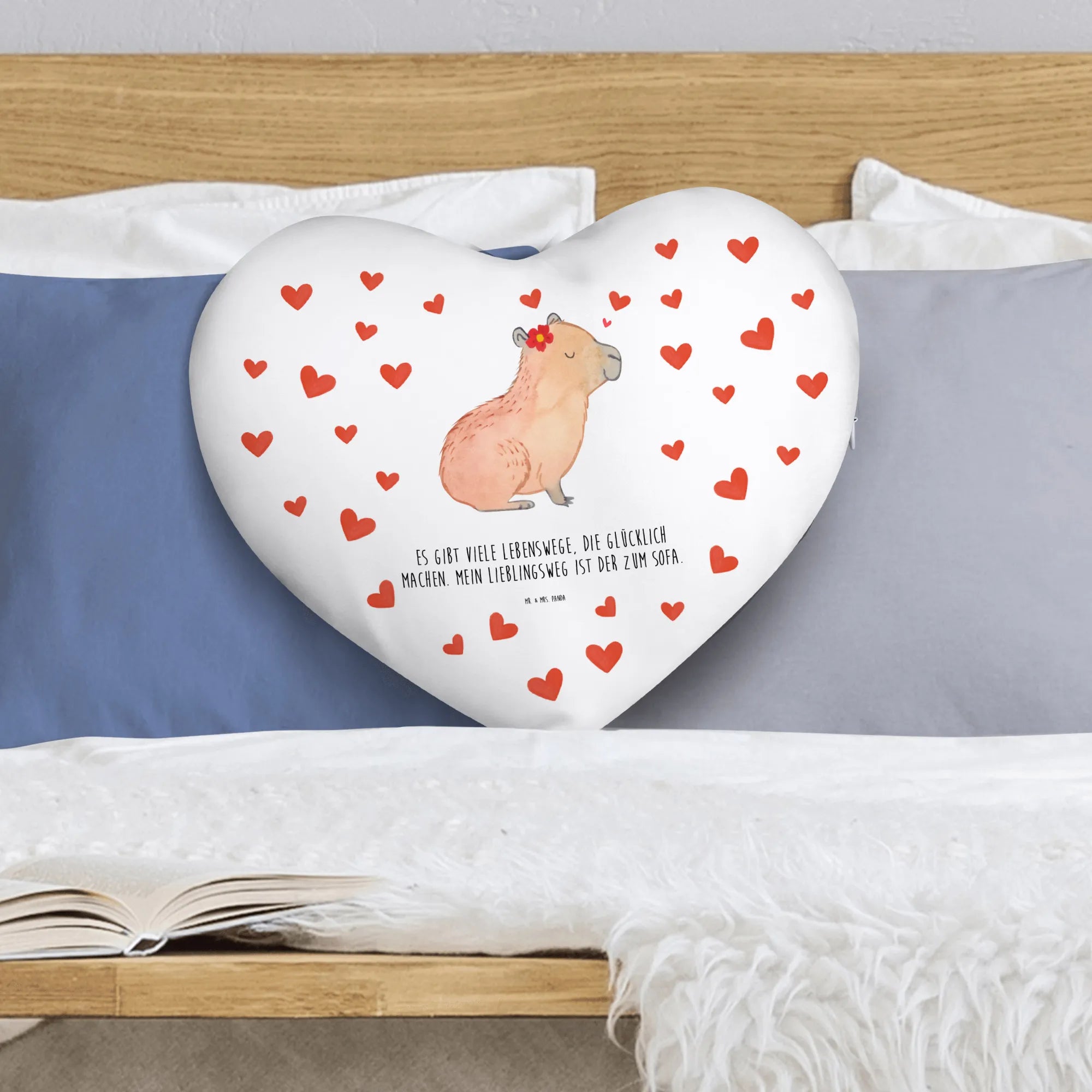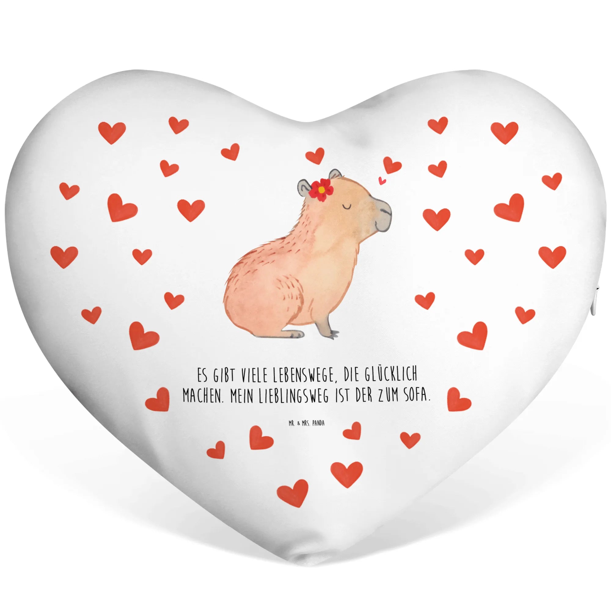 Das Herzkissen "Capybara Blume" aus der Small World Kollektion von Mr. & Mrs. Panda ist das perfekte Geschenk für Tierliebhaber und Freunde des guten Geschmacks. Mit seinem liebevollen Design bringt es nicht nur ein Lächeln auf die Gesichter, sondern sorgt auch für gute Laune in jedem Raum. Die zauberhafte Illustration eines niedlichen Capybaras, das mit einer blühenden roten Blume und einem kleinen Herzchen verziert ist, vermittelt ein Gefühl von Wärme und Geborgenheit.