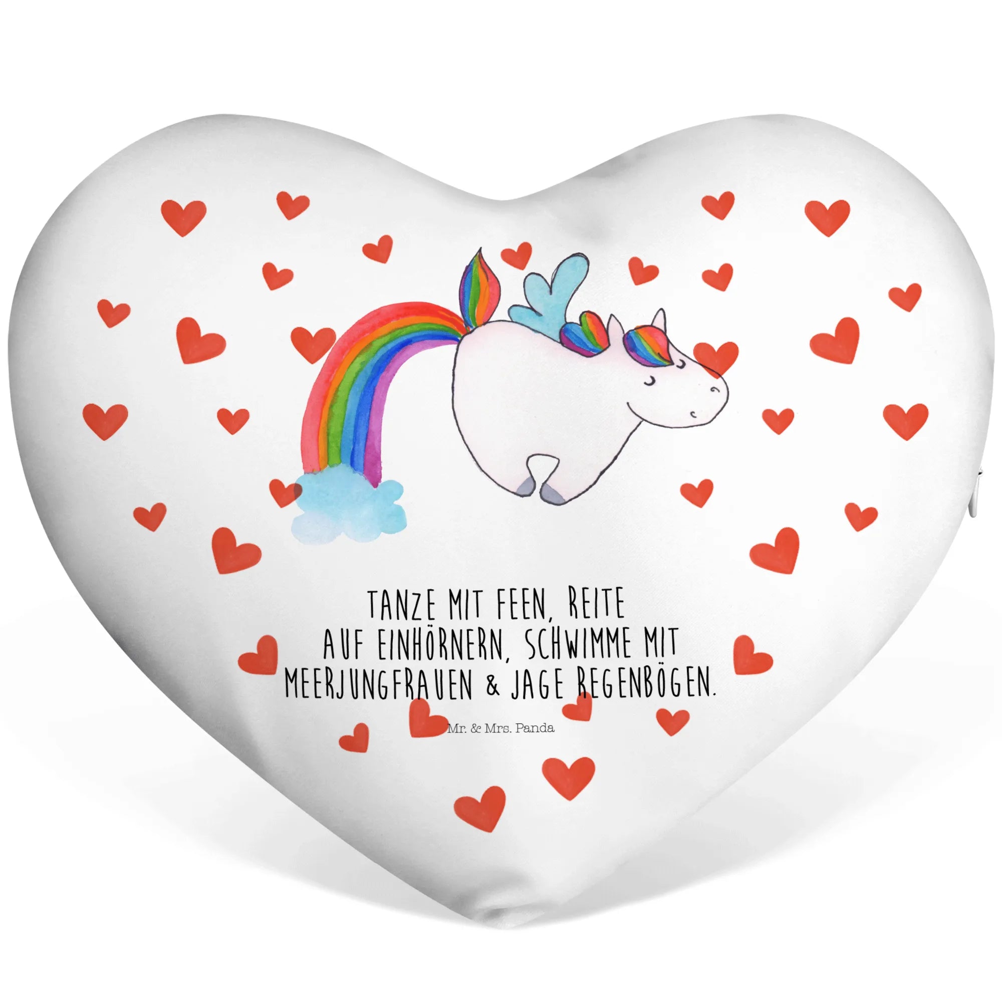 Das wunderschöne Herzkissen mit dem Motiv "Einhorn Fliegendes Pferd" aus der fantastischen Einhorn-Kollektion von Mr. & Mrs. Panda ist das perfekte Geschenk für alle, die die zauberhafte Welt der Einhörner lieben!