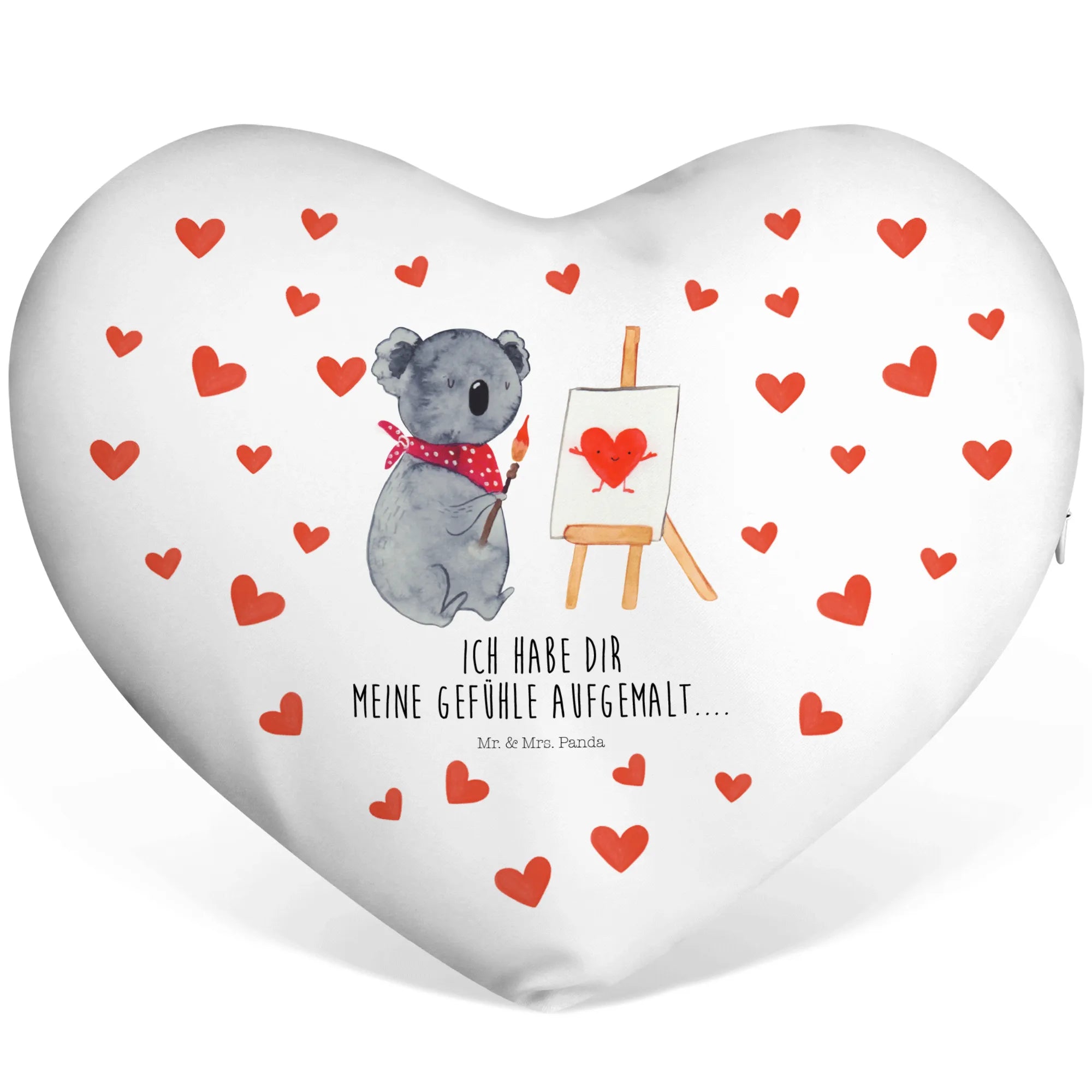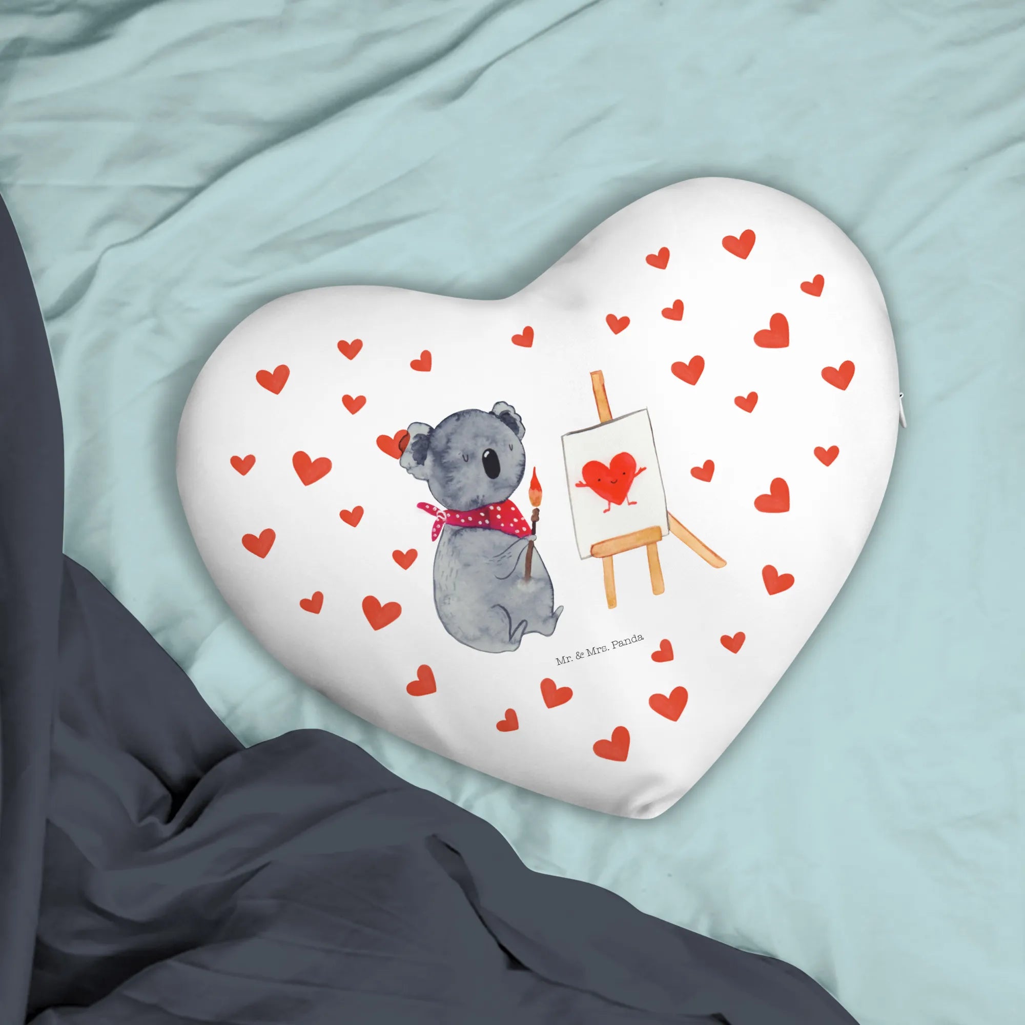 Das Herzkissen Koala Künstler von Mr. & Mrs. Panda ist der perfekte Liebesbeweis für alle, die ihren Liebsten eine Freude machen möchten. Mit einem liebevollen Design, das einen süßen Koala zeigt, der auf einer großen Leinwand malt, bringt dieses Kissen die sanfte und ruhige Seele des Koalas direkt zu dir nach Hause.