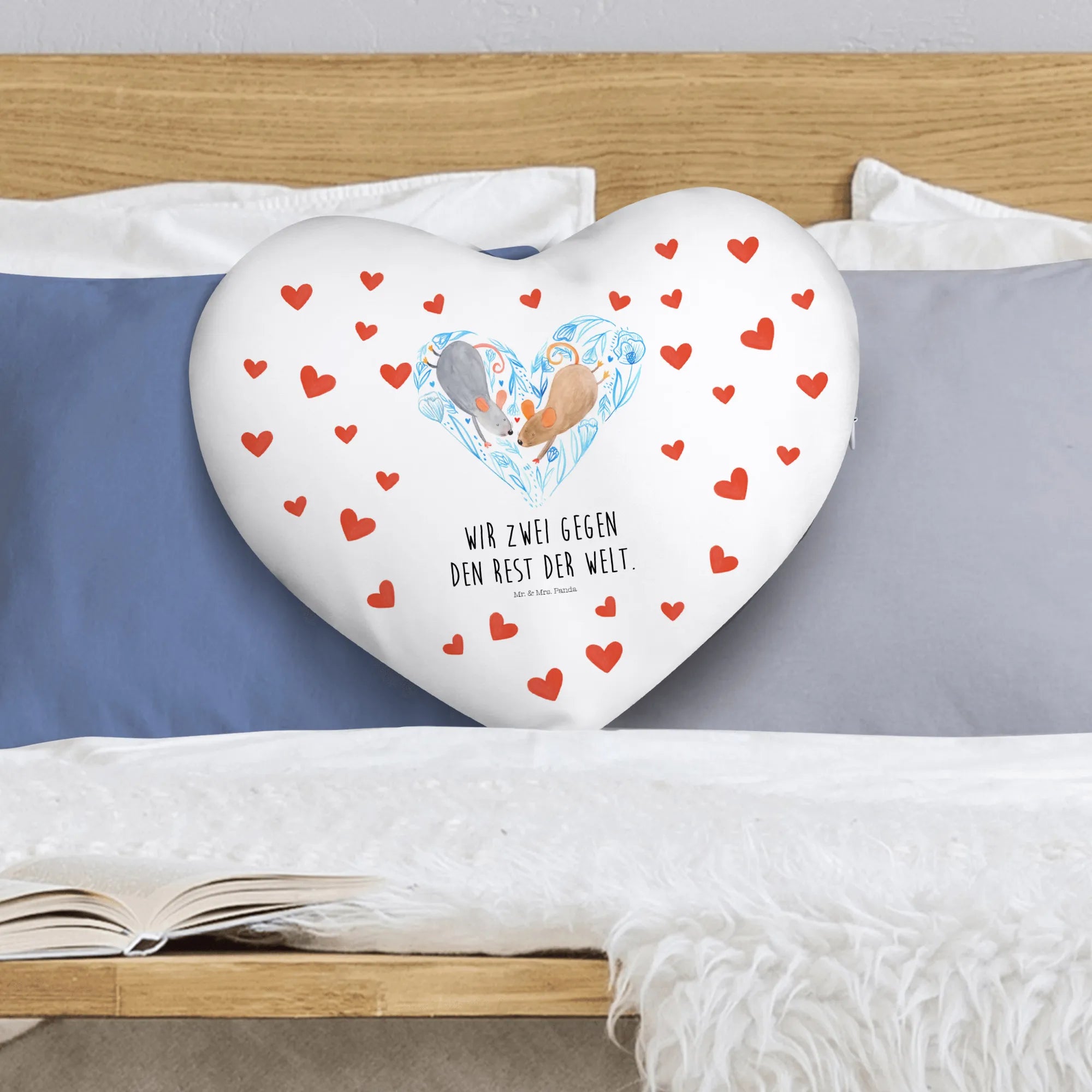 Das Herzkissen von Mr. & Mrs. Panda mit dem liebevollen Mäuse Herz Motiv ist der perfekte Begleiter für all deine romantischen Momente. Es strahlt nicht nur Wärme und Geborgenheit aus, sondern ist auch ein wunderschönes Dekokissen für dein Zuhause. Mit den sanften Aquarellfarben und dem zauberhaften Design der zwei niedlichen Mäuse, die zusammen ein Herz bilden, bringt es Liebe in jeden Raum. Der Slogan 'Wir zwei gegen den Rest der Welt' vermittelt auf eine süße Art und Weise, wie besonders deine Verbindung zu deinem Lieblingsmenschen ist.