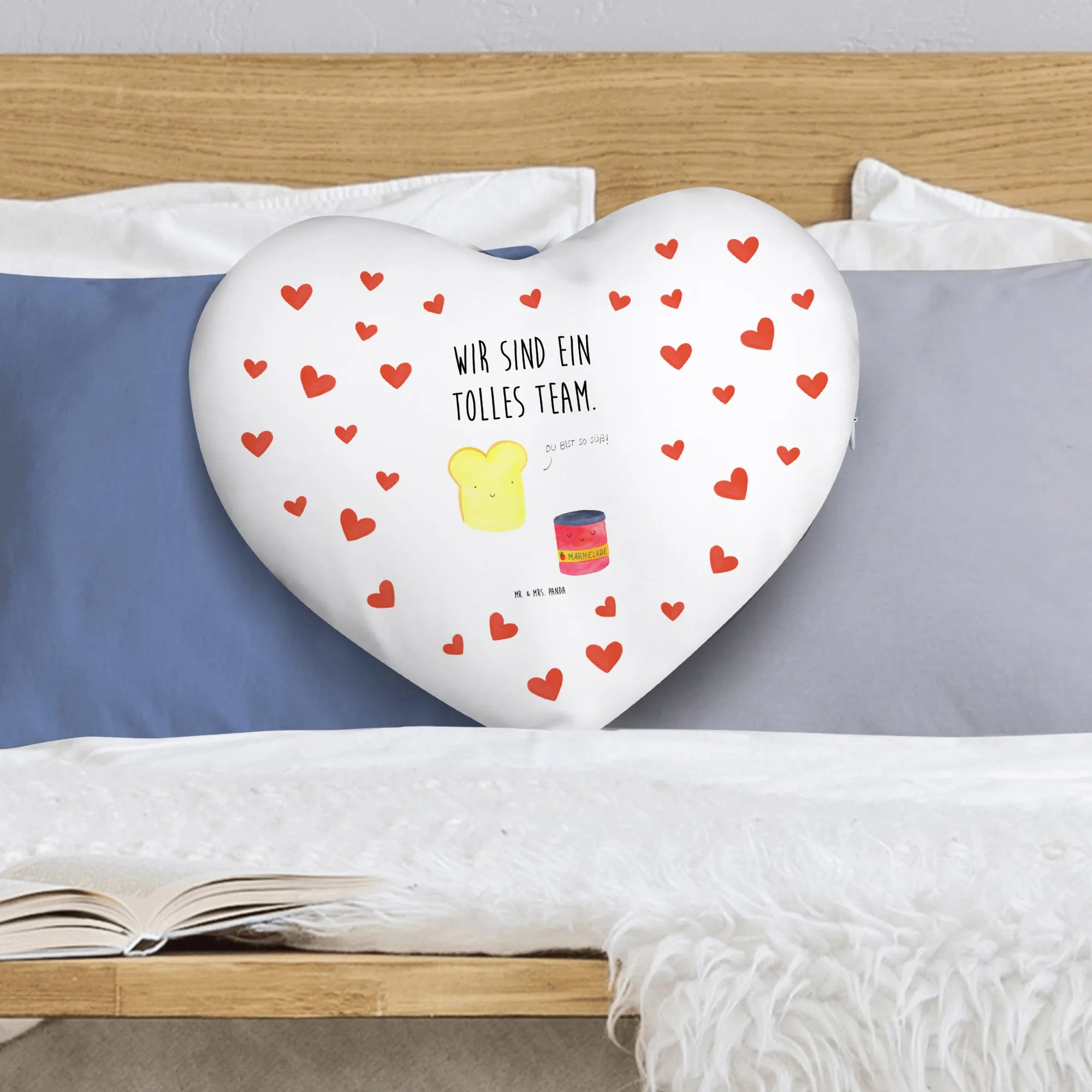 Das Herzkissen mit Toast & Marmelade aus der Small World Kollektion von Mr. & Mrs. Panda ist das perfekte Geschenk für alle, die das Leben mit einem Lächeln genießen. Mit seiner lieblichen Herzform und dem bunten, fröhlichen Design zaubert es richtig gute Laune. Jedes Kissen wurde mit viel Liebe zum Detail handgezeichnet und zeigt ein zuckersüßes Motiv von einem Toast und einer Marmelade, die ineinander verliebt sind.