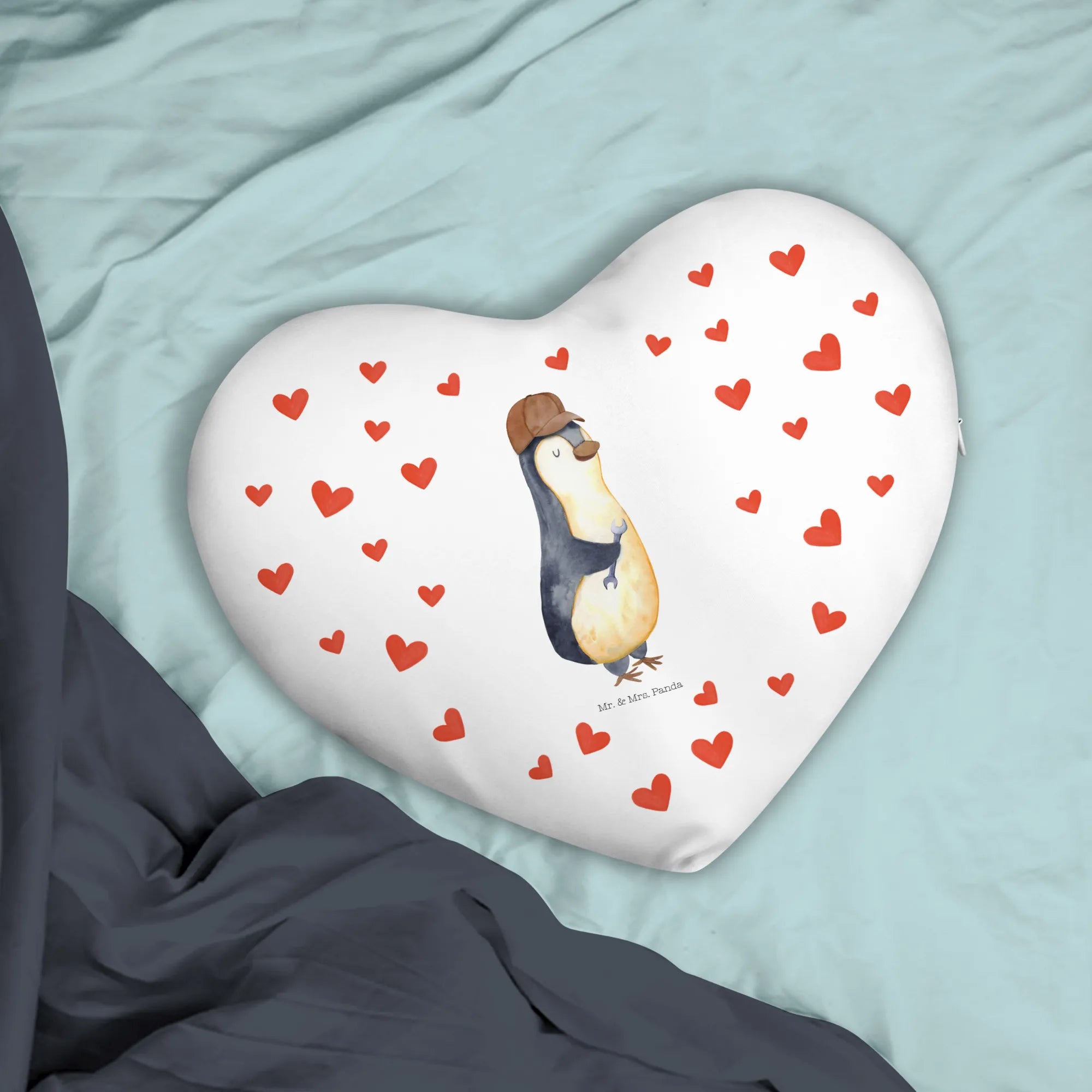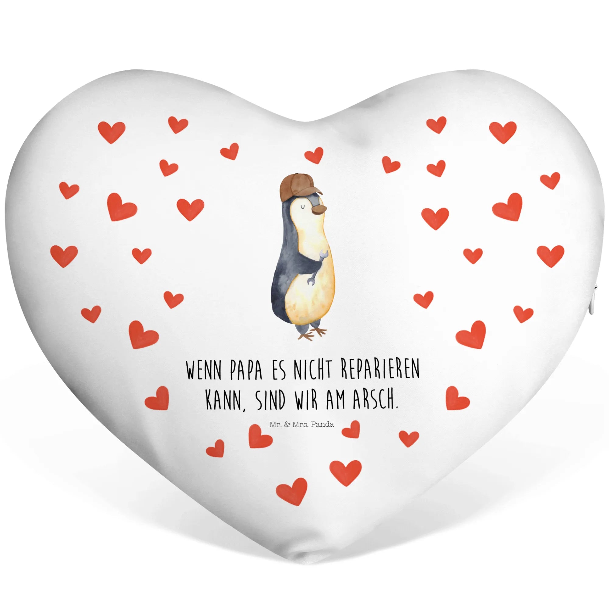 Verschenke das besondere Herzkissen "Wenn Papa es nicht reparieren kann, sind wir am Arsch" von Mr. & Mrs. Panda - das perfekte Geschenk für Väter, die handwerklich begabt sind, oder für die, die es gerne wären. Mit einem süßen Pinguin-Motiv, das ein lässiges Lächeln auf dein Gesicht zaubert, ist dieses Kissen ein echter Hingucker.