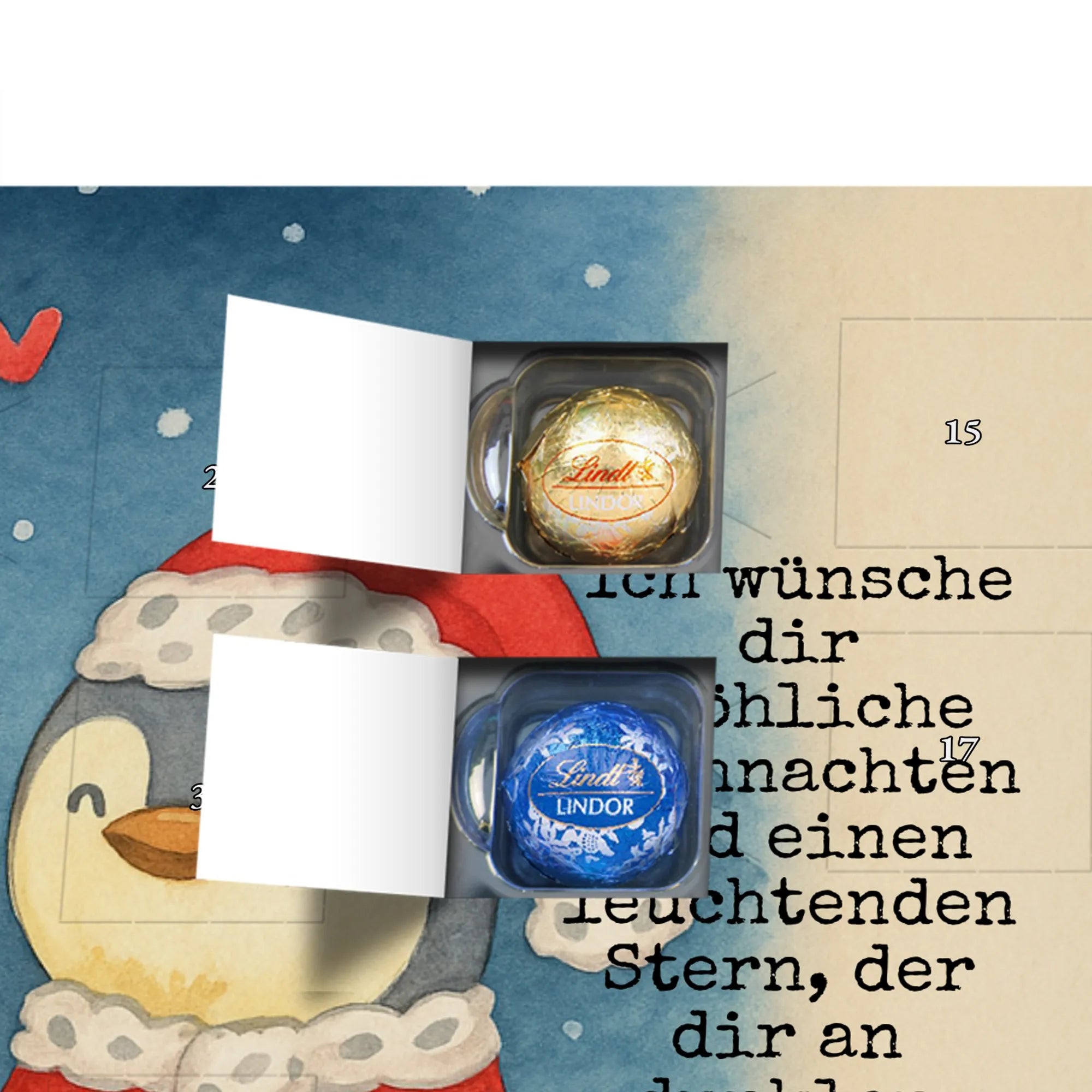 Unser Adventskalender Schokolade von Mr. & Mrs. Panda vereint niedliches Design mit leckerer Überraschung. Bedruckt mit wunderschönen Motiven & Sprüchen, nicht personalisierbar, ist er ein unkompliziertes Geschenk, das Freude macht. Die brillante Druckqualität mit seidenmatter Oberflächenveredelung verleiht dem Kalender einen hochwertigen Look, ergänzt durch bedruckte Seitenflächen für ein rundum stimmiges Design. Maße: 233 mm x 178 mm x 24 mm. Besonderheit: kann aufgehängt oder aufgestellt werden und passt so perfekt in jede Deko. Gefüllt mit Lindt Lindor: 24 einzeln verpackte Markenschokoladen Kugeln in Vollmilch, Feinherb und Weiße Schokolade sorgen für abwechslungsreichen Genuss. Zutaten: Zucker, pflanzliches Fett (Kokosnuss, Palmkern), Kakaobutter, Vollmilchpulver, Kakaomasse, Milchzucker, Magermilchpulver, Butterreinfett, Emulgator (Sojalecithin), Gerstenmalzextrakt, Aromen. Besondere Hinweise: Kann Haselnüsse und Mandeln enthalten. Hol dir diese süße Vorfreude oder verschenke sie – Mr. & Mrs. Panda wünschen dir eine gemütliche Adventszeit!