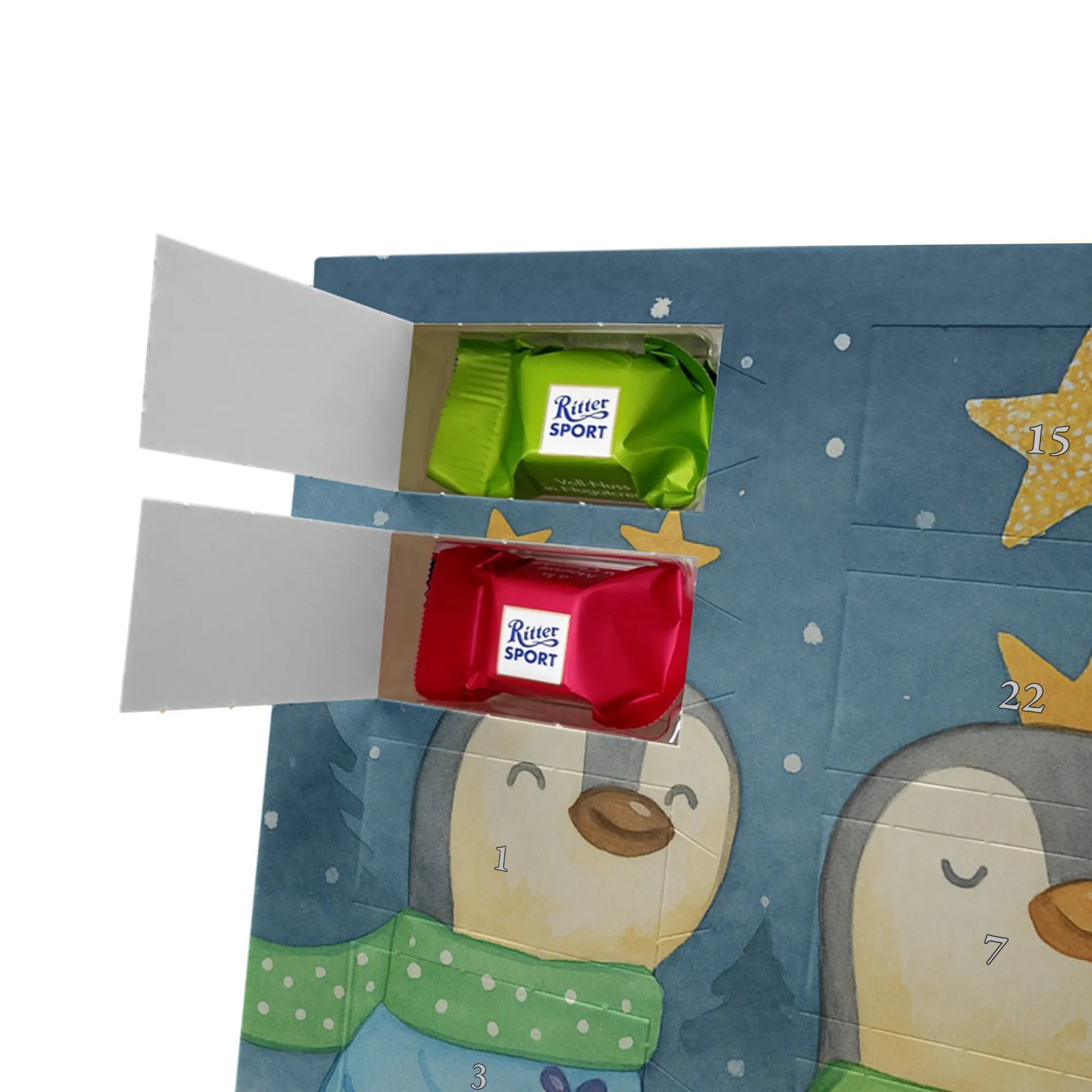 Adventskalender mit Schokolade – so schmeckt Vorfreude! Unser Mr. & Mrs. Panda Adventskalender ist liebevoll gestaltet und bedruckt mit wunderschönen Motiven & Sprüchen, die jeden Tag versüßen. Die brillante Druckqualität mit seidenmatter Oberflächenveredelung sorgt für ein edles Finish, und auch die Seitenflächen sind hübsch bedruckt. Der Kalender ist nicht personalisierbar, dafür aber vielseitig einsetzbar: Maße: 325 mm x 225 mm x 27 mm und die besondere Eigenschaft, dass du ihn aufgehängt oder aufgestellt verwenden kannst, geben dir Flexibilität bei der Dekoration. Gefüllt ist der Kalender mit Ritter Sport Schokowürfeln in beliebten Geschmacksrichtungen wie Mousse au Chocolat, Schoko Crisp, Voll-Nuss in Nougatcreme, Karamell Duo, Joghurt und Erdbeer-Joghurt. Wichtig: Es handelt sich um einen Kalender gefüllt mit Ritter Sport Schokolade, nicht um einen Kalender der Marke Ritter Sport. Ideal als Geschenk oder als Adventsdeko für dein Zuhause – kleine Schokofreuden warten hinter jedem Türchen.