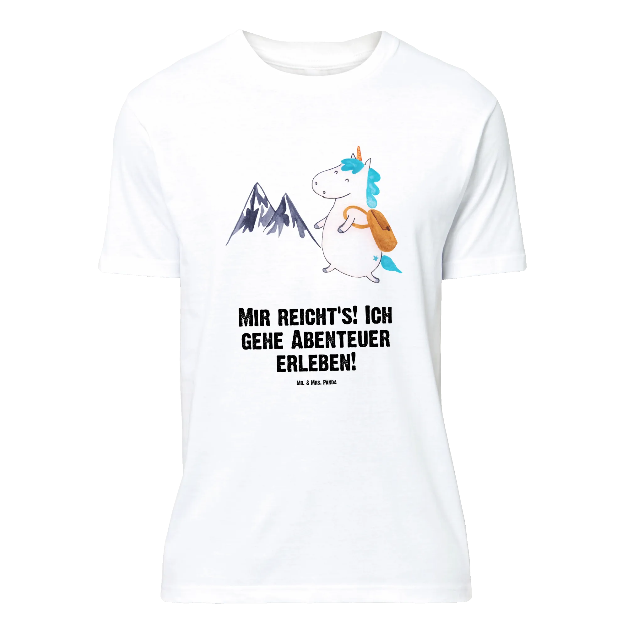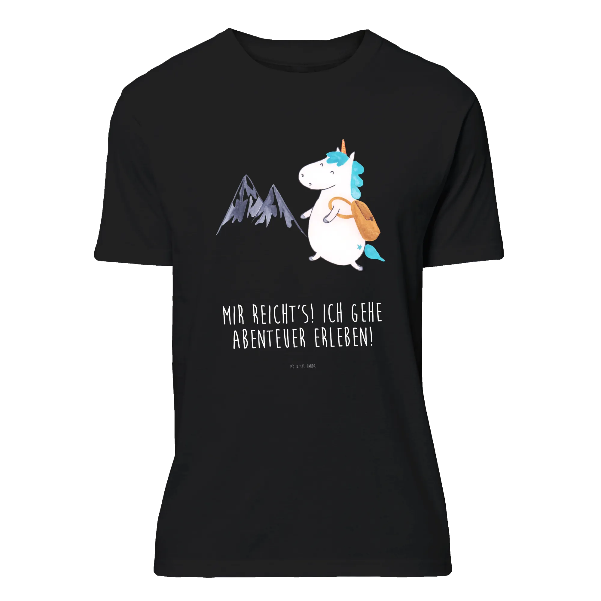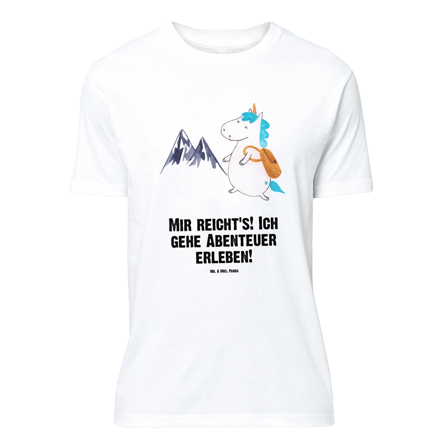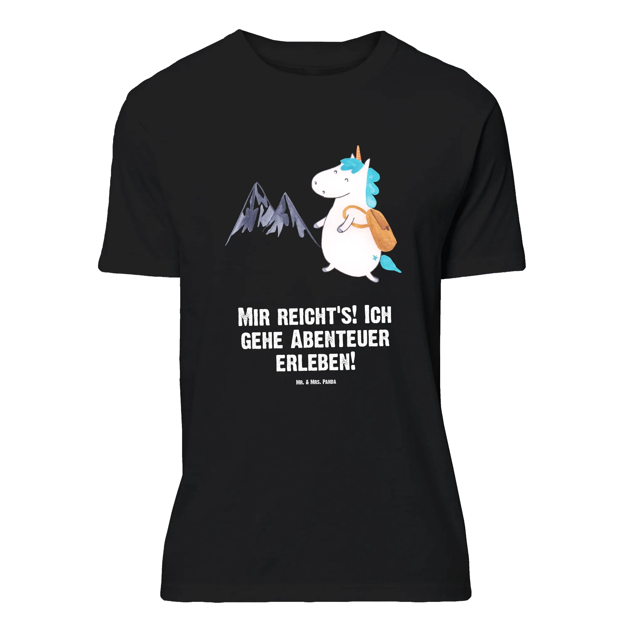 Es zeigt ein niedliches, handgezeichnetes Einhorn, das mit seinem Rucksack in die Berge aufbricht. "Mir reicht's! Ich gehe Abenteuer erleben!" steht stolz auf dem T-Shirt und inspiriert dazu, das Leben in vollen Zügen zu genießen und neue Entdeckungen zu machen.