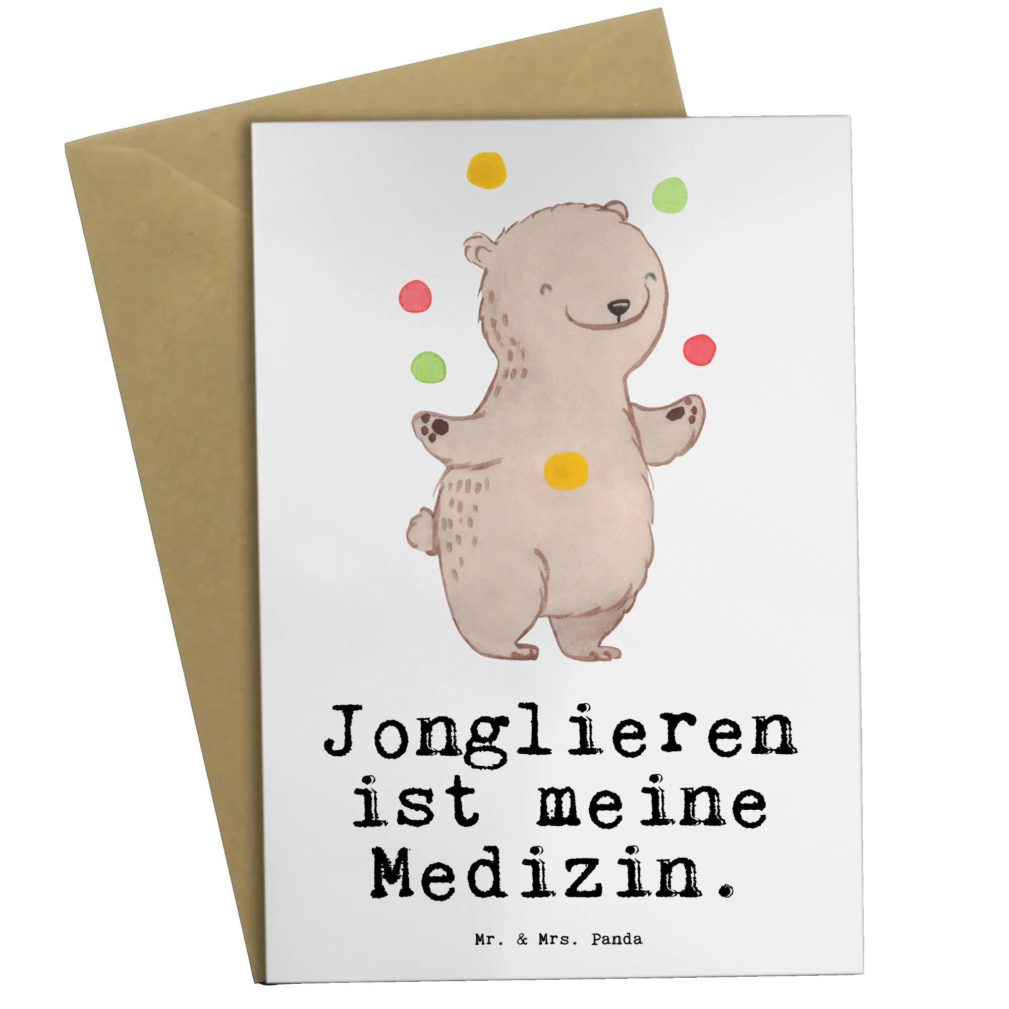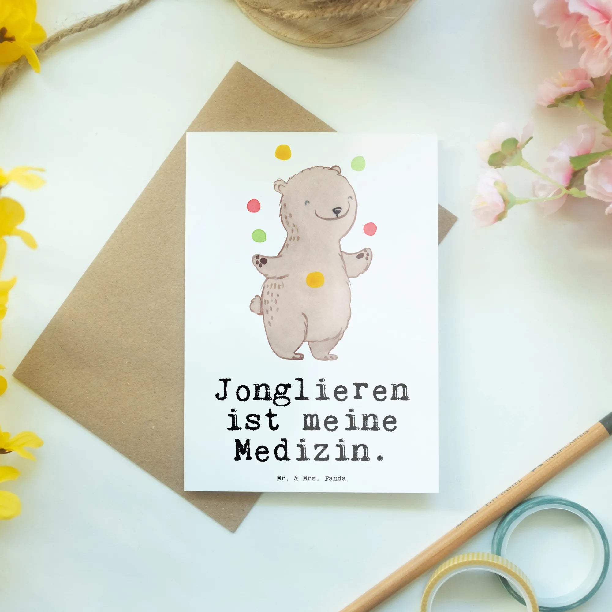 Suchst du nach der perfekten Grußkarte für einen Zirkusfan oder einen Hobby-Jongleur? Die liebevolle Grußkarte "Bär Jonglieren Medizin" aus der Kollektion Hobby & Sport von Mr. & Mrs. Panda ist genau das Richtige! Diese charmante Karte zeigt einen süßen Bären, der begeistert mit sechs bunten Bällen jongliert. Der passende Spruch "Jonglieren ist meine Medizin" bringt das Herz eines jeden Jongleurs zum Strahlen.