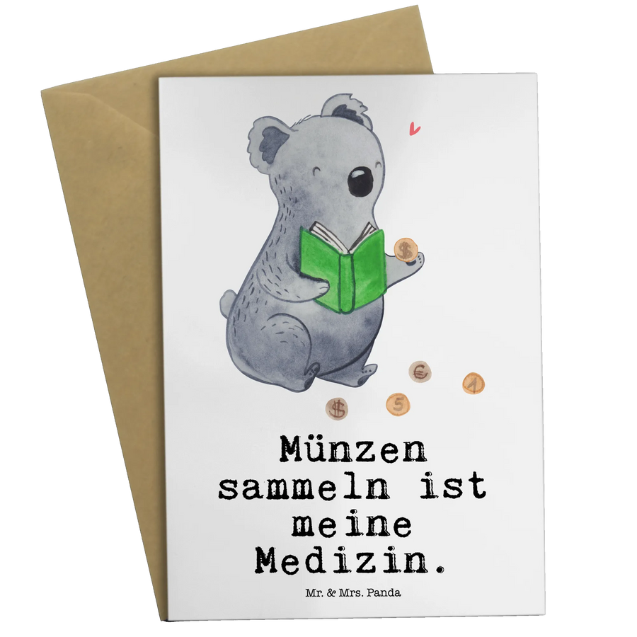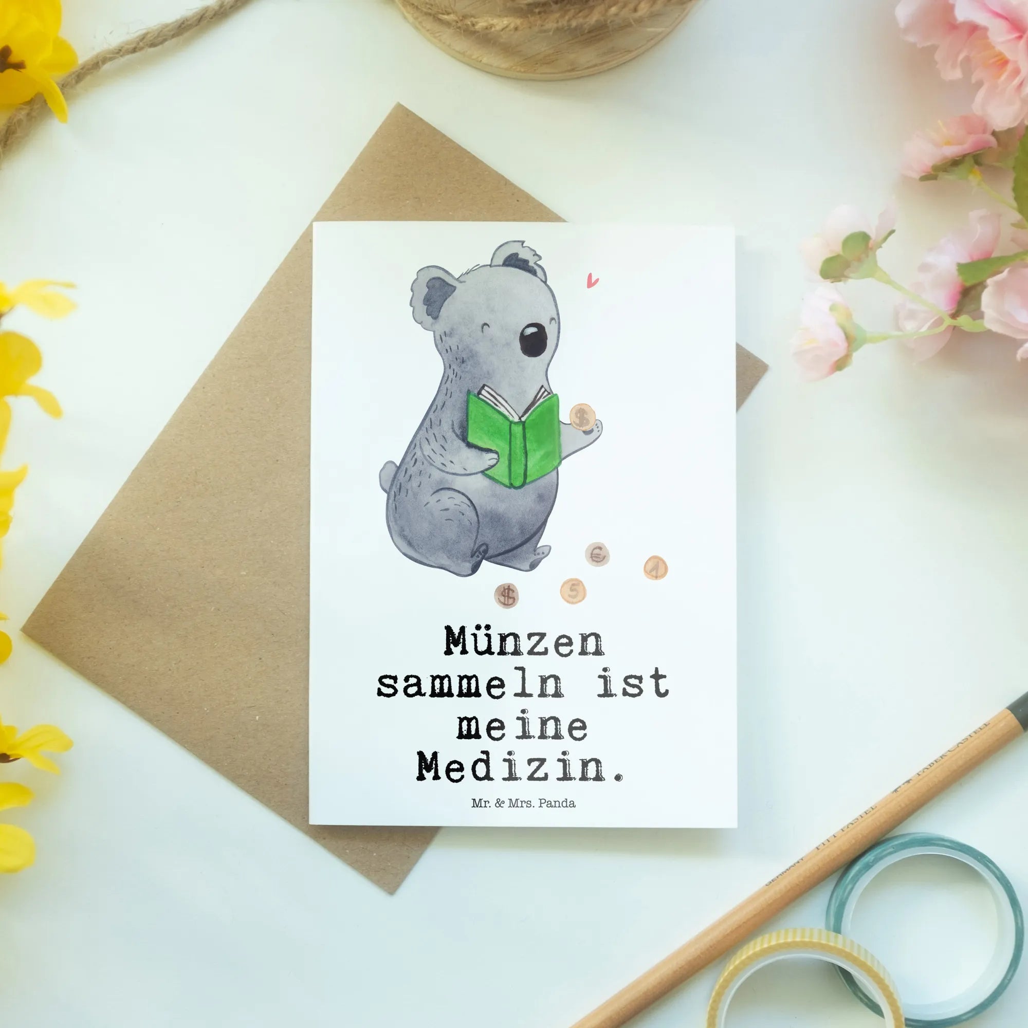 Entdecke die bezaubernde Grußkarte "Koala Münzen sammeln Medizin" von Mr. & Mrs. Panda – das perfekte Geschenk für alle Münzsammler und Hobby-Enthusiasten!