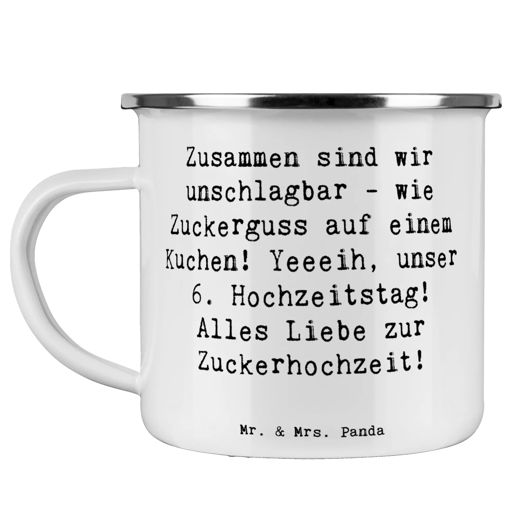 Du suchst nach dem perfekten Geschenk für den 6. Hochzeitstag? Die wunderschöne Camping Emaille Tasse von Mr. & Mrs. Panda mit dem Spruch "Zusammen sind wir unschlagbar - wie Zuckerguss auf einem Kuchen! Yeeeih, unser 6. Hochzeitstag! Alles Liebe zur Zuckerhochzeit!" ist die ideale Wahl!