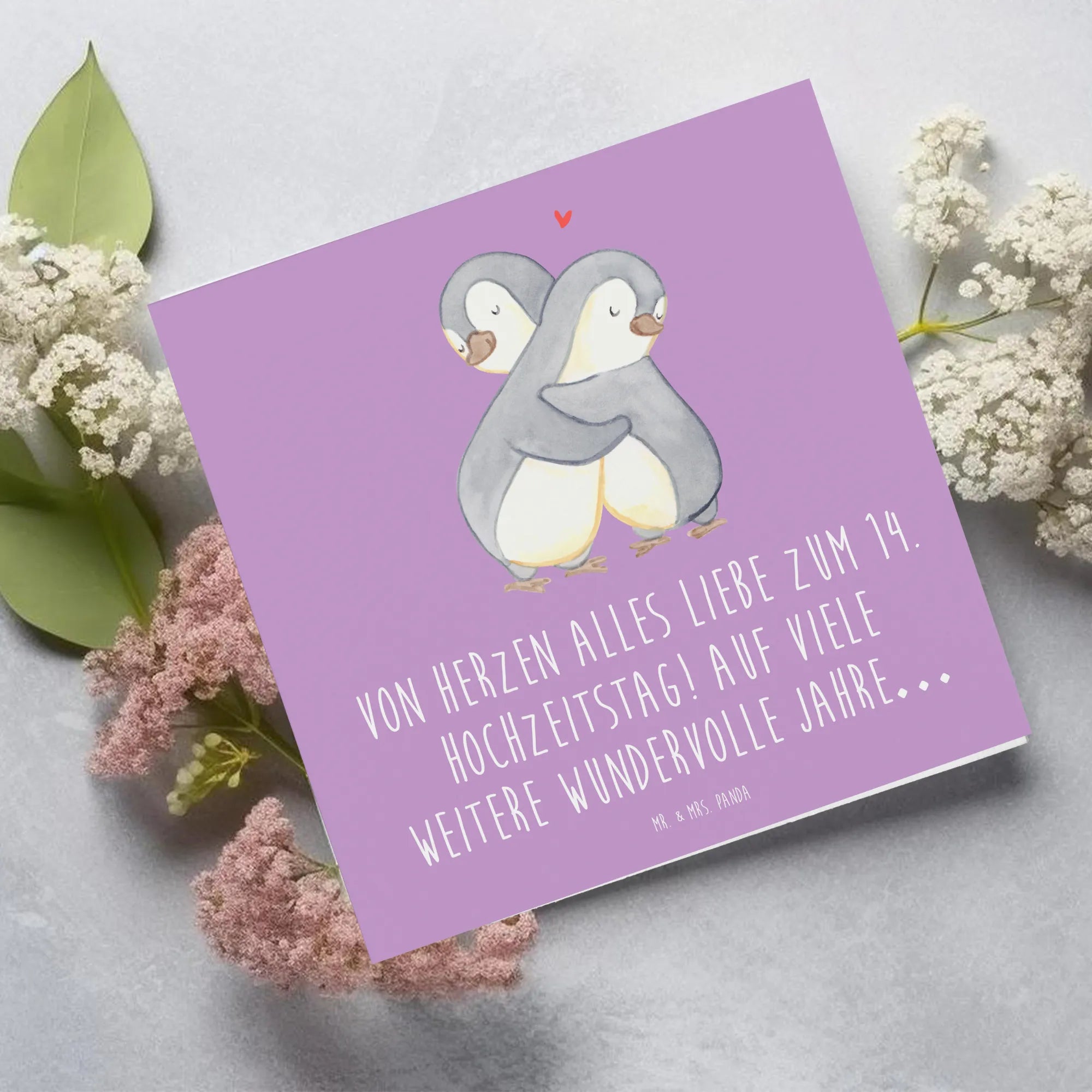 Die Deluxe Karte zum 14. Hochzeitstag, liebevoll gestaltet von Mr. & Mrs. Panda, ist das perfekte Geschenk für Paare, die ihre Elfenbeinhochzeit feiern und ihre Liebe zelebrieren möchten. Diese wunderschöne, quadratische Karte (140 mm x 140 mm) besticht durch ihre hochwertige Verarbeitung und edlen Umschlag - genau das Richtige für einen besonderen Anlass!