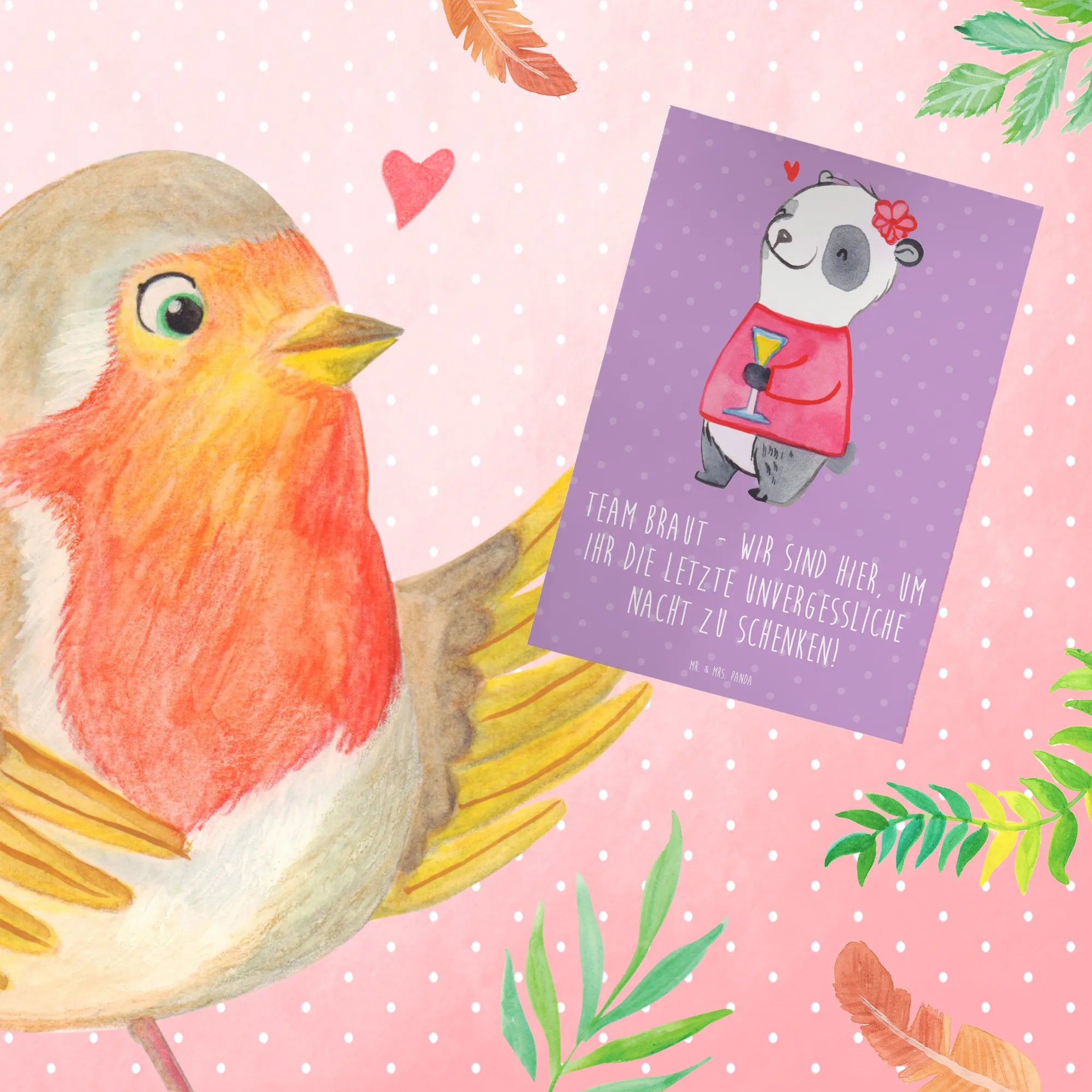 Diese wunderschöne Grußkarte zum Junggesellinnenabschied von Mr. & Mrs. Panda ist das perfekte Geschenk für deine Braut oder die beste Freundin, die bald den Bund fürs Leben schließen wird! Mit dem spritzigen Spruch "Team Braut - Wir sind hier, um ihr die letzte unvergessliche Nacht zu schenken!" bringt sie garantiert ein Lächeln auf ihr Gesicht.