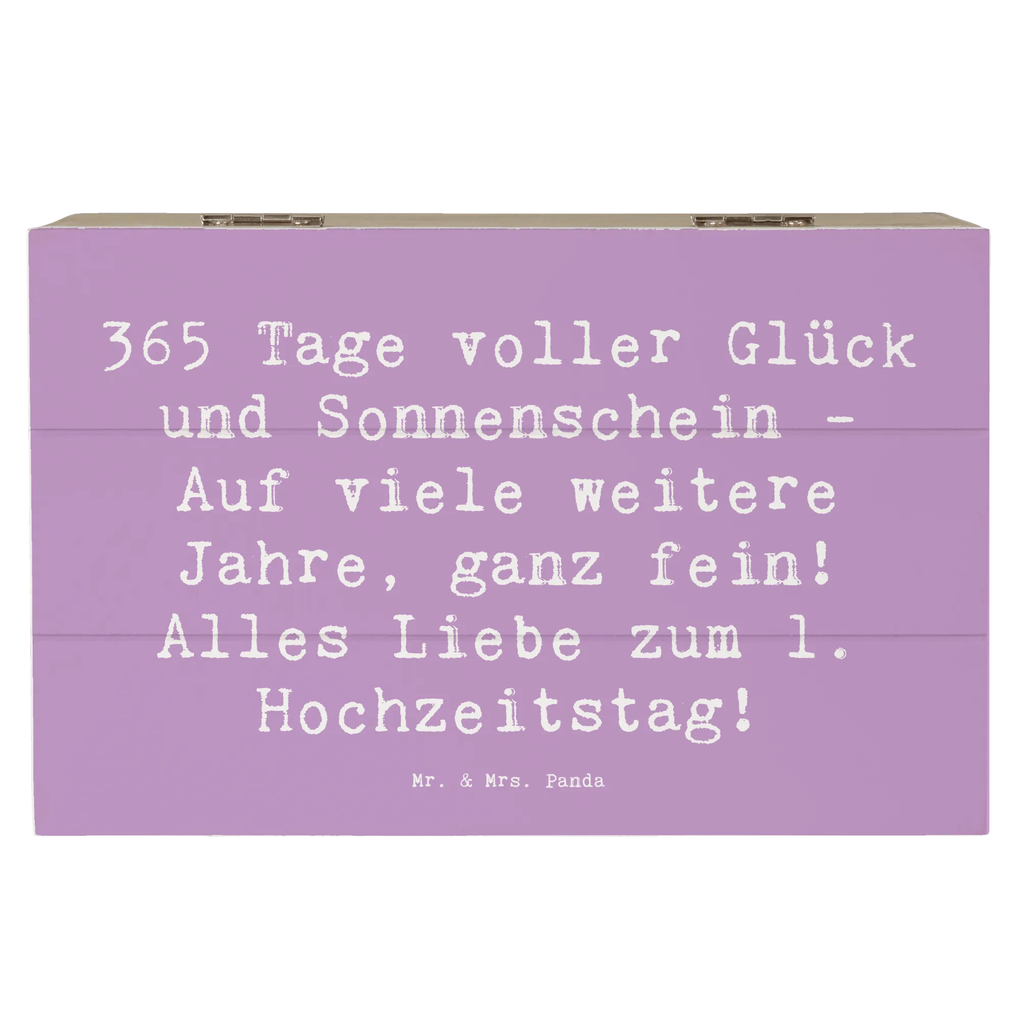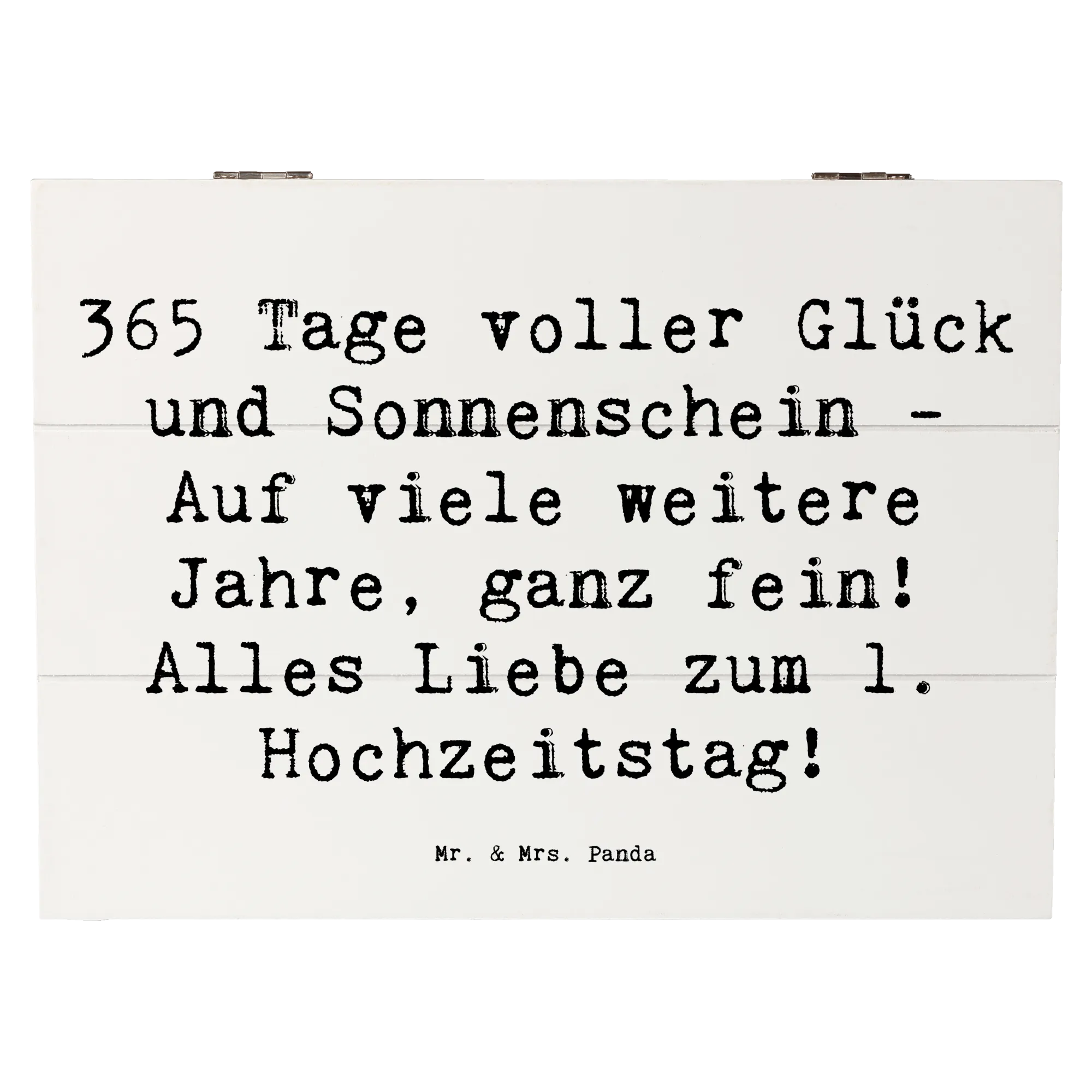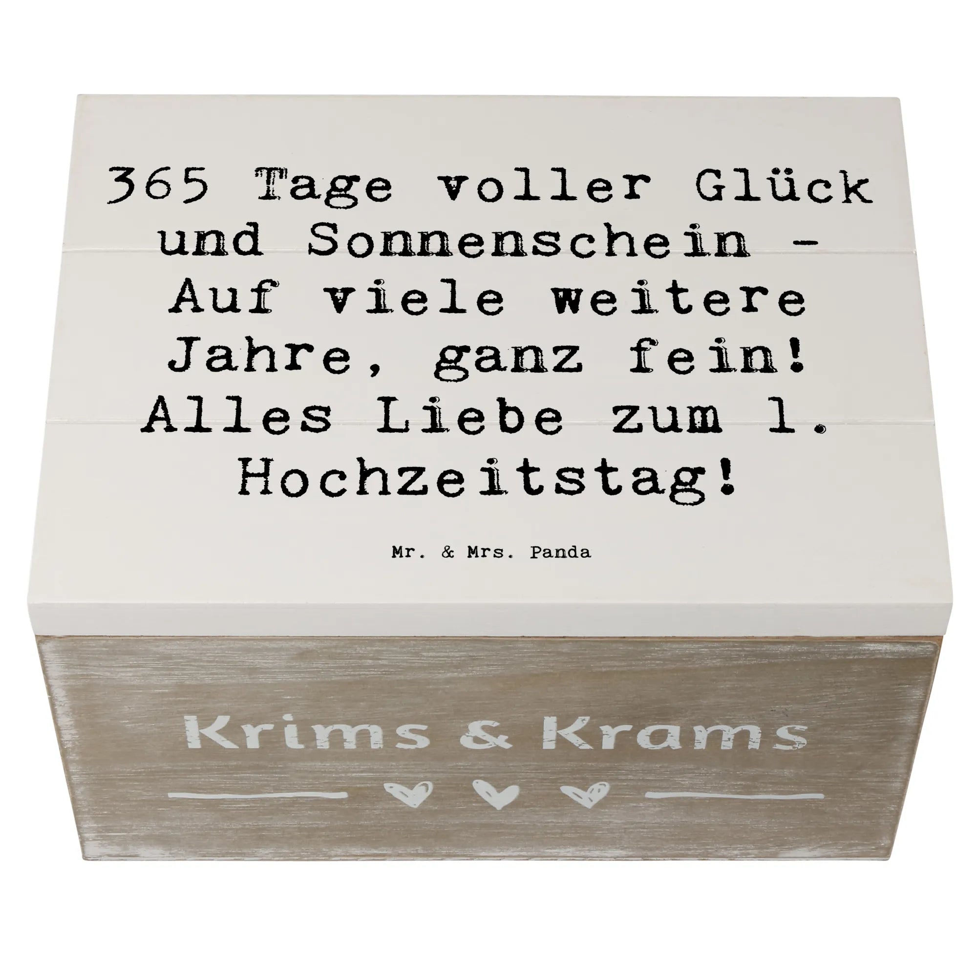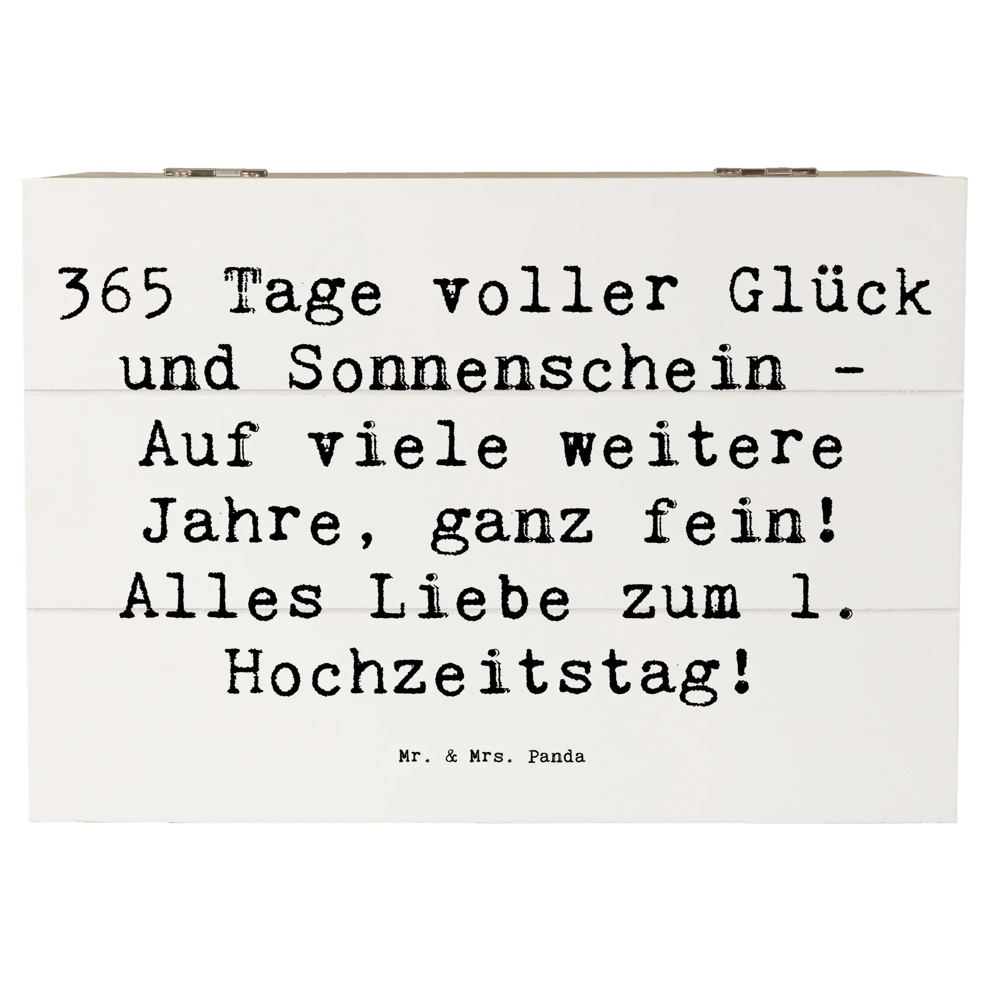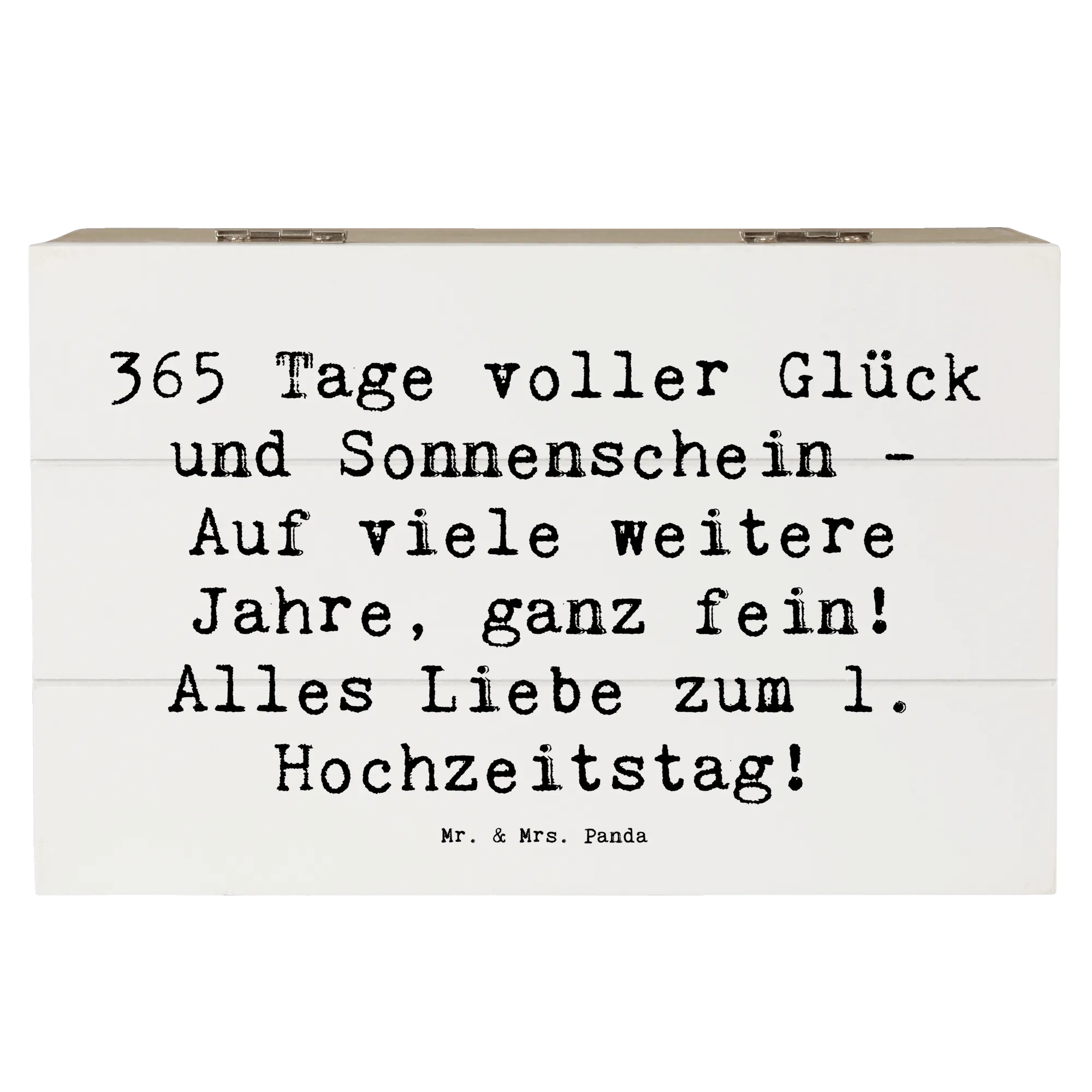 Du suchst nach dem perfekten Geschenk zum 1. Hochzeitstag? Diese wunderschöne Holzkiste von Mr. & Mrs. Panda ist die ideale Wahl! Bedruckt mit dem liebevollen Spruch '365 Tage voller Glück und Sonnenschein - Auf viele weitere Jahre, ganz fein! Alles Liebe zum 1. Hochzeitstag!', wird sie nicht nur zum stilvollen Aufbewahrungsort für all eure gemeinsamen Erinnerungen, sondern auch zum zauberhaften Dekorationsstück in eurer Wohnung.