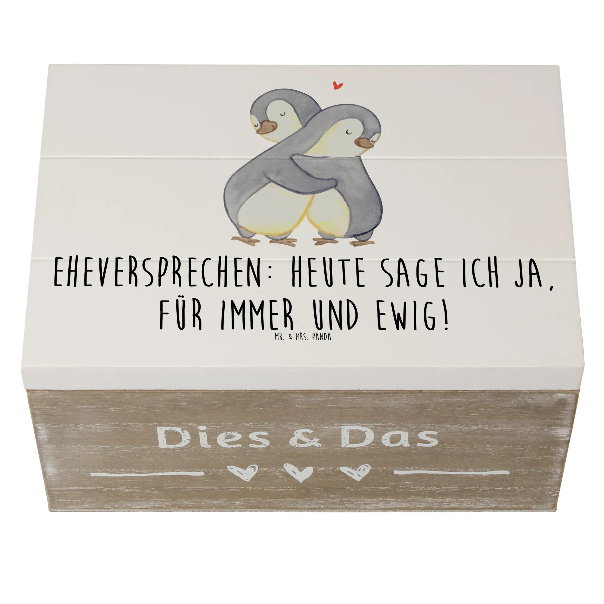 Die Holzkiste "Eheversprechen" von Mr. & Mrs. Panda ist das perfekte Geschenk für jeden, der seine Liebe in einer besonderen Art und Weise feiern möchte. Mit dem liebevollen Motiv und dem Slogan "Eheversprechen: Heute sage ich Ja, für immer und ewig!" ist diese märchenhafte Kiste nicht nur ein echter Hingucker, sondern auch eine zauberhafte Aufbewahrungslösung für alle Erinnerungen an den schönsten Tag im Leben.