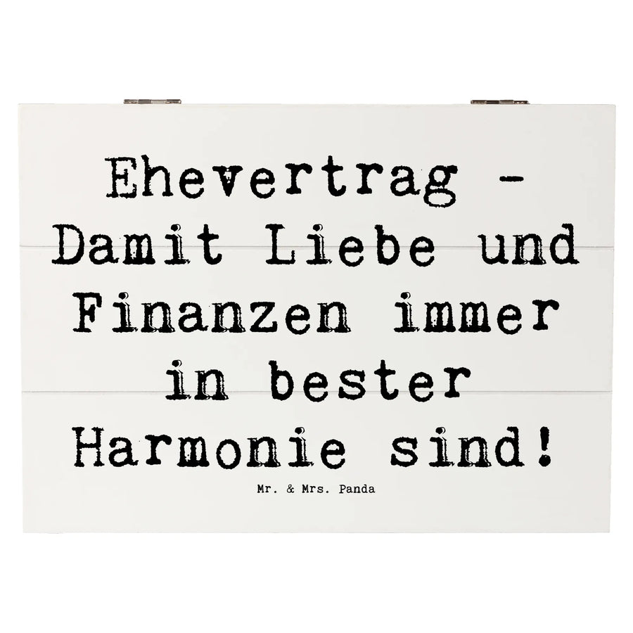 Du suchst nach dem perfekten Geschenk für die nächste Hochzeit? Die wunderschöne Holzkiste von Mr. & Mrs. Panda mit dem Motto 'Ehevertrag - Damit Liebe und Finanzen immer in bester Harmonie sind!' ist genau das Richtige für dich und das Brautpaar! Diese zauberhafte Erinnerungsbox ist nicht nur eine tolle Dekokiste, sondern auch ideal als Aufbewahrungsort für all die wertvollen Schätze, die im Laufe der Jahre gesammelt werden. Perfekt für Hochzeitsgeschenke, Verlobungsgeschenke oder Selbstgeschenke, um jede schöne Erinnerung festzuhalten!