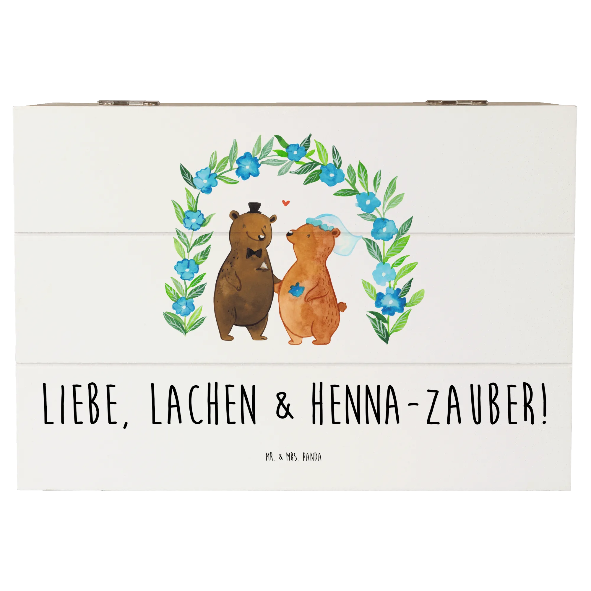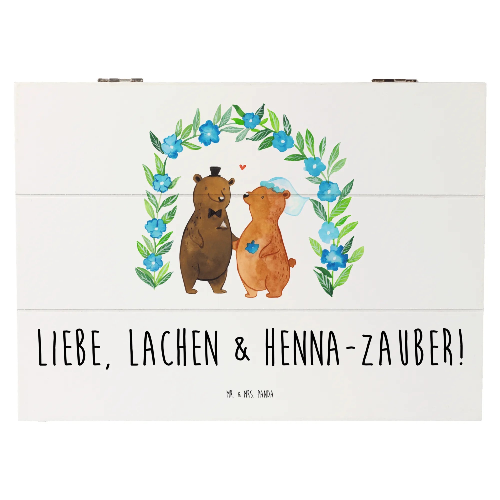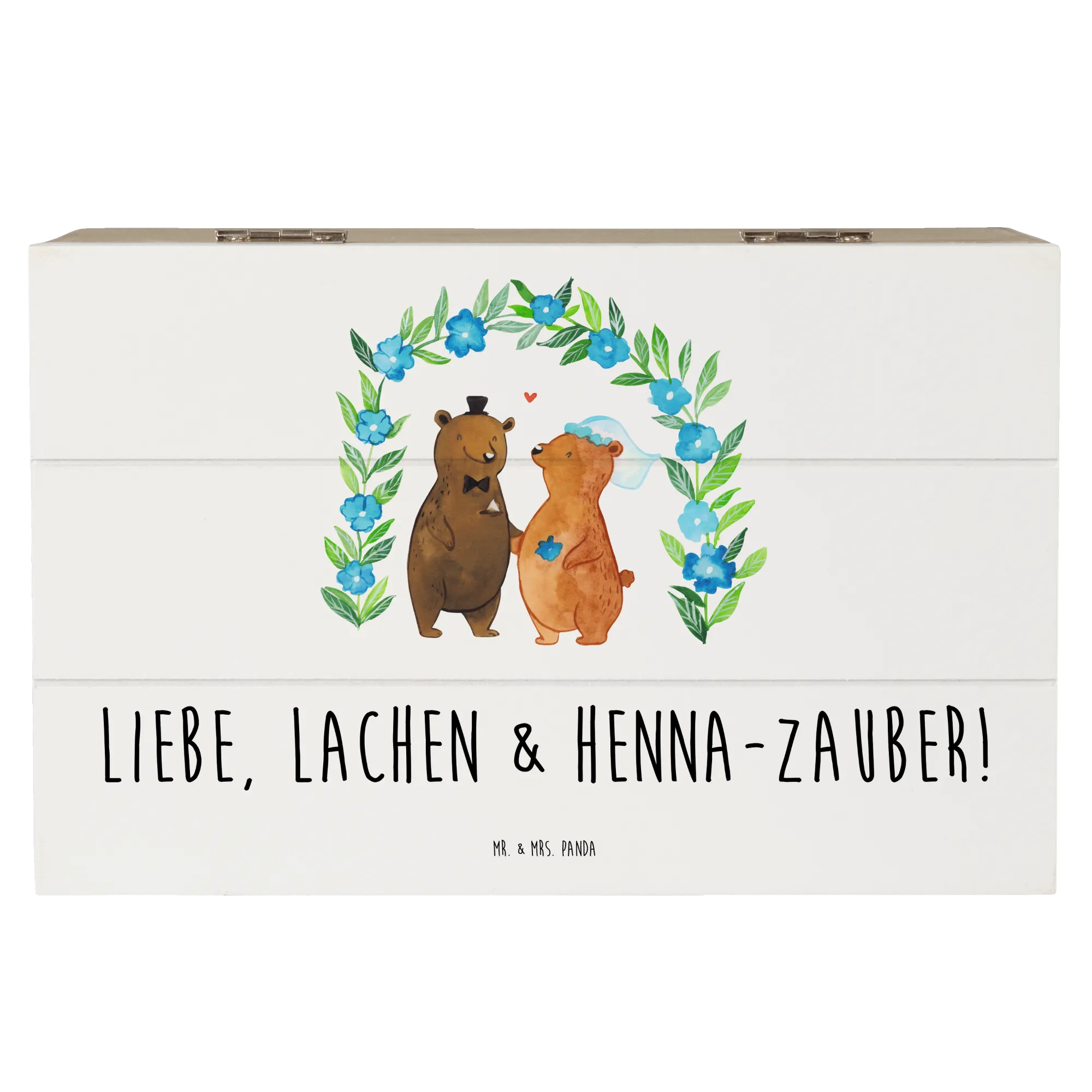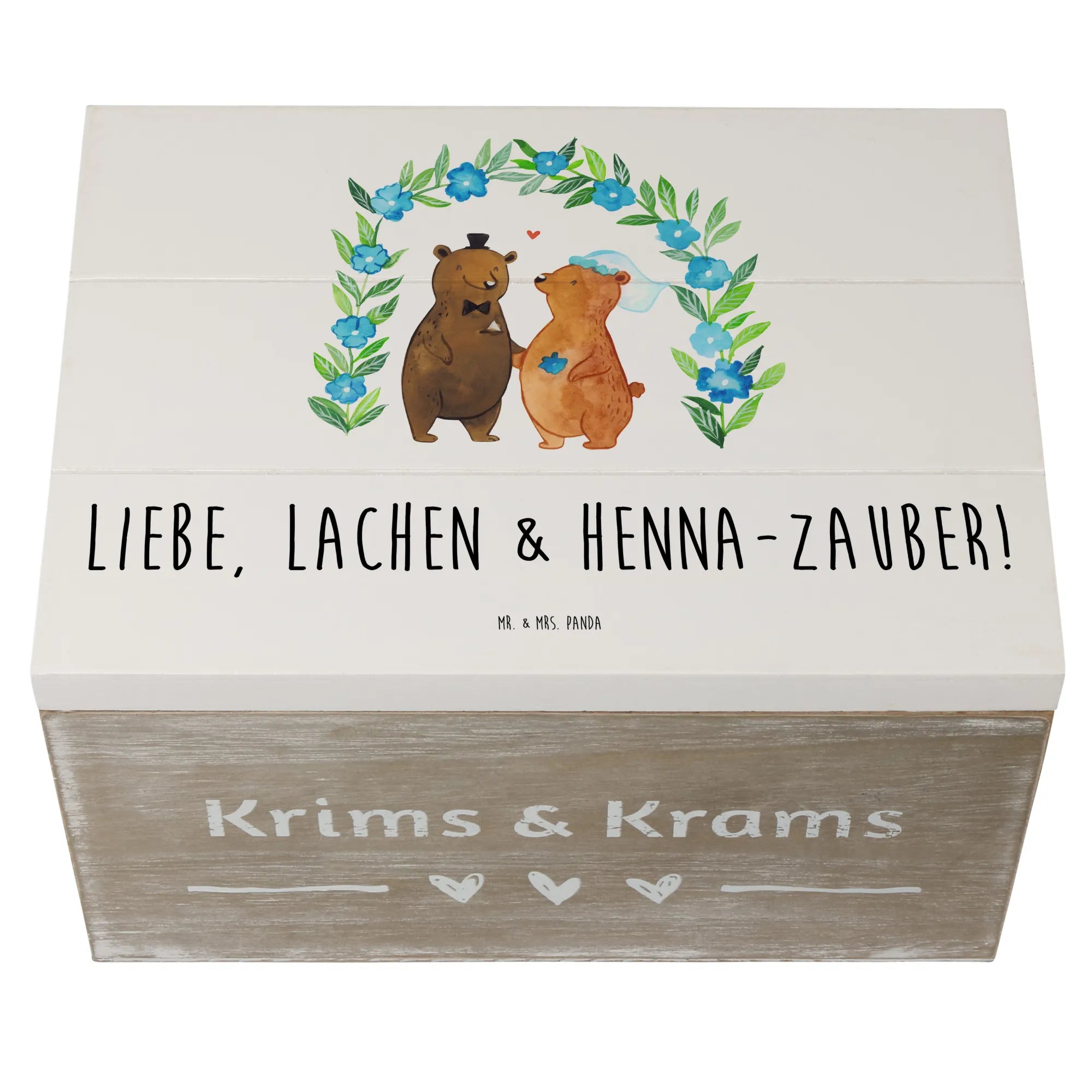 Die wunderschöne Holzkiste im Henna-Abend Design von Mr. & Mrs. Panda ist das perfekte Geschenk für alle, die eine besondere Hochzeit feiern möchten! Ob für das Brautpaar, als Erinnerungsgeschenk oder als kreative Geschenkbox für die Hochzeitsgäste, diese herrliche Kiste wird mit Sicherheit Herzen höher schlagen lassen. Im zeitlosen Design und bedruckt mit dem liebevollen Spruch "Liebe, Lachen & Henna-Zauber!" bringt sie eine Prise Romantik in jeden Raum.