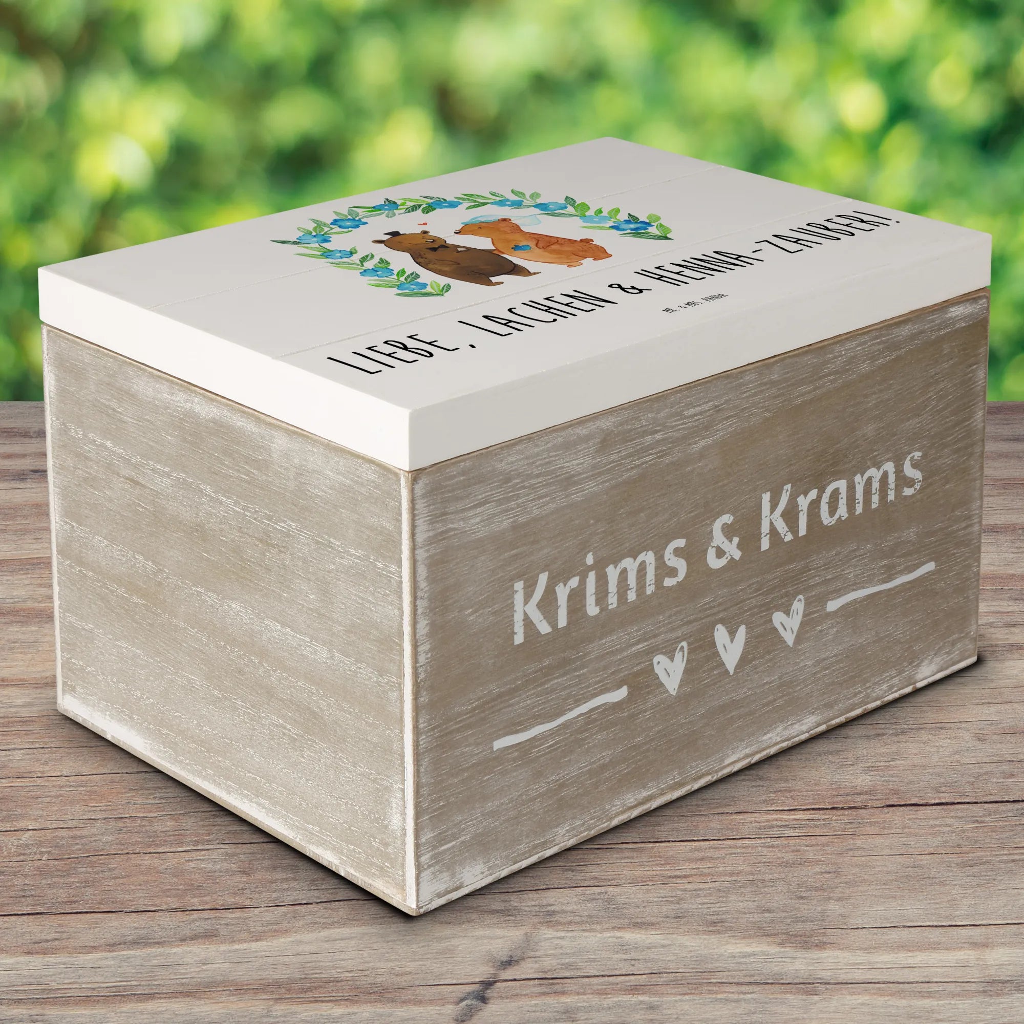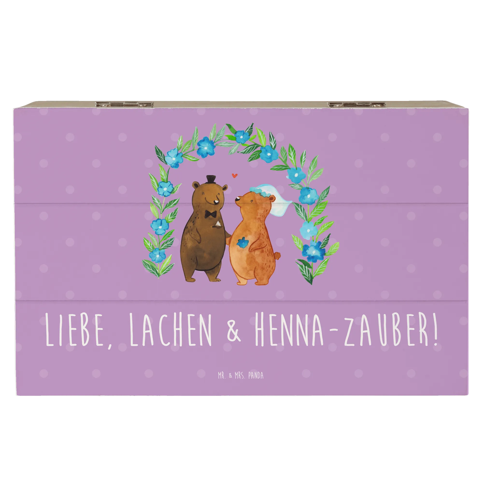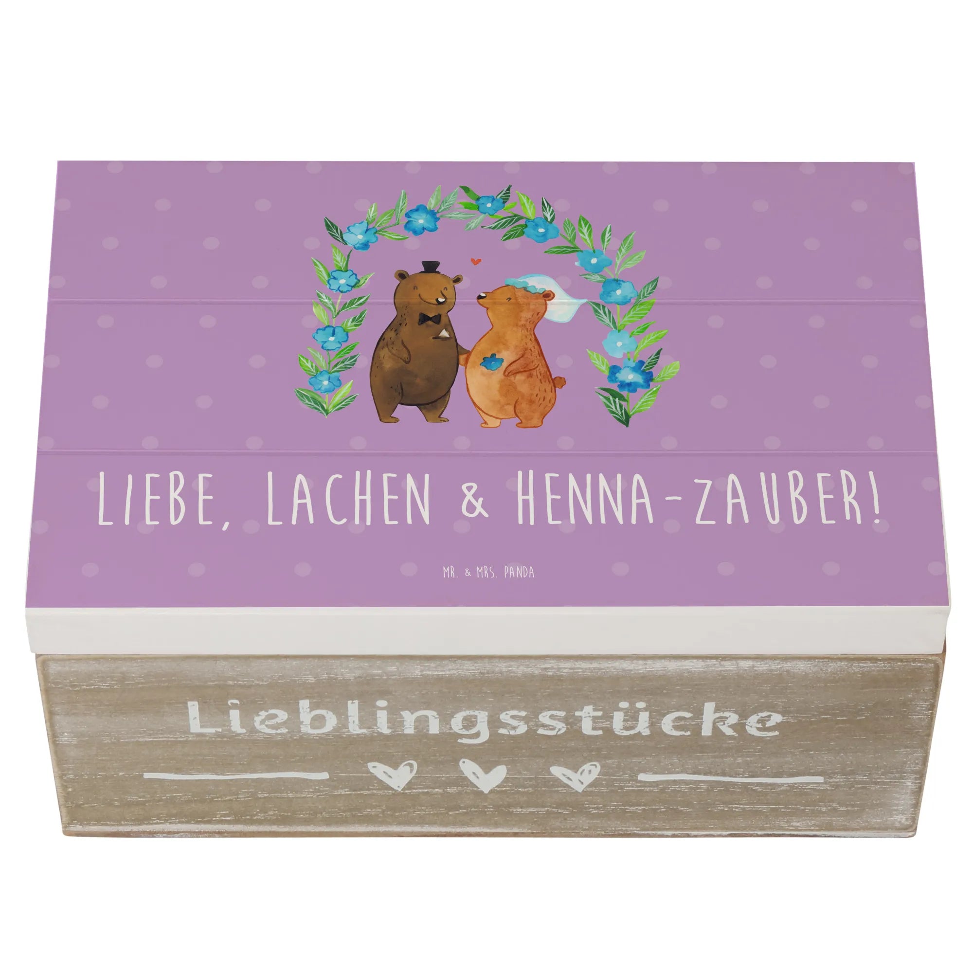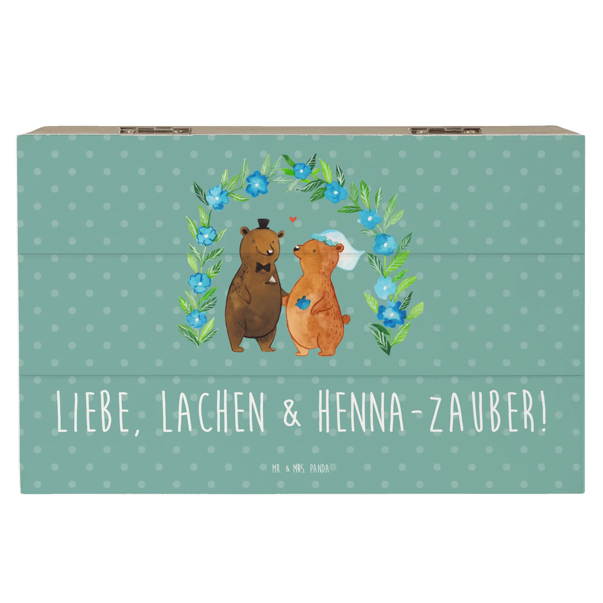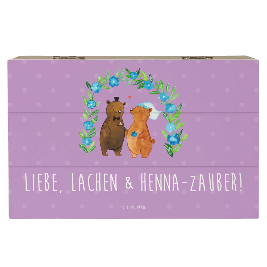 Die wunderschöne Holzkiste im Henna-Abend Design von Mr. & Mrs. Panda ist das perfekte Geschenk für alle, die eine besondere Hochzeit feiern möchten! Ob für das Brautpaar, als Erinnerungsgeschenk oder als kreative Geschenkbox für die Hochzeitsgäste, diese herrliche Kiste wird mit Sicherheit Herzen höher schlagen lassen. Im zeitlosen Design und bedruckt mit dem liebevollen Spruch "Liebe, Lachen & Henna-Zauber!" bringt sie eine Prise Romantik in jeden Raum.