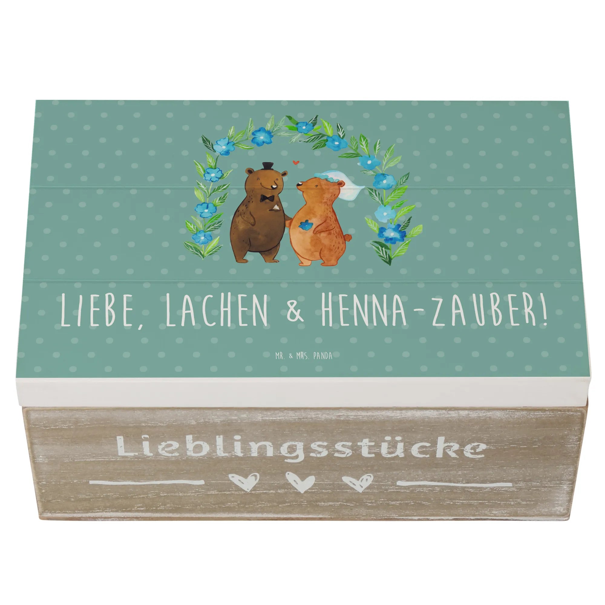 Mit dieser Holzkiste "Henna-Abend" aus der Hochzeit Kollektion von Mr. & Mrs. Panda holst du dir ein Stück Magie in dein Zuhause. Lass uns gemeinsam Erinnerungen schaffen und das Leben feiern! Diese Kiste ist nicht nur ein praktisches Accessoire, sondern auch eine liebevolle Erinnerung an die schönsten Momente in deinem Leben!