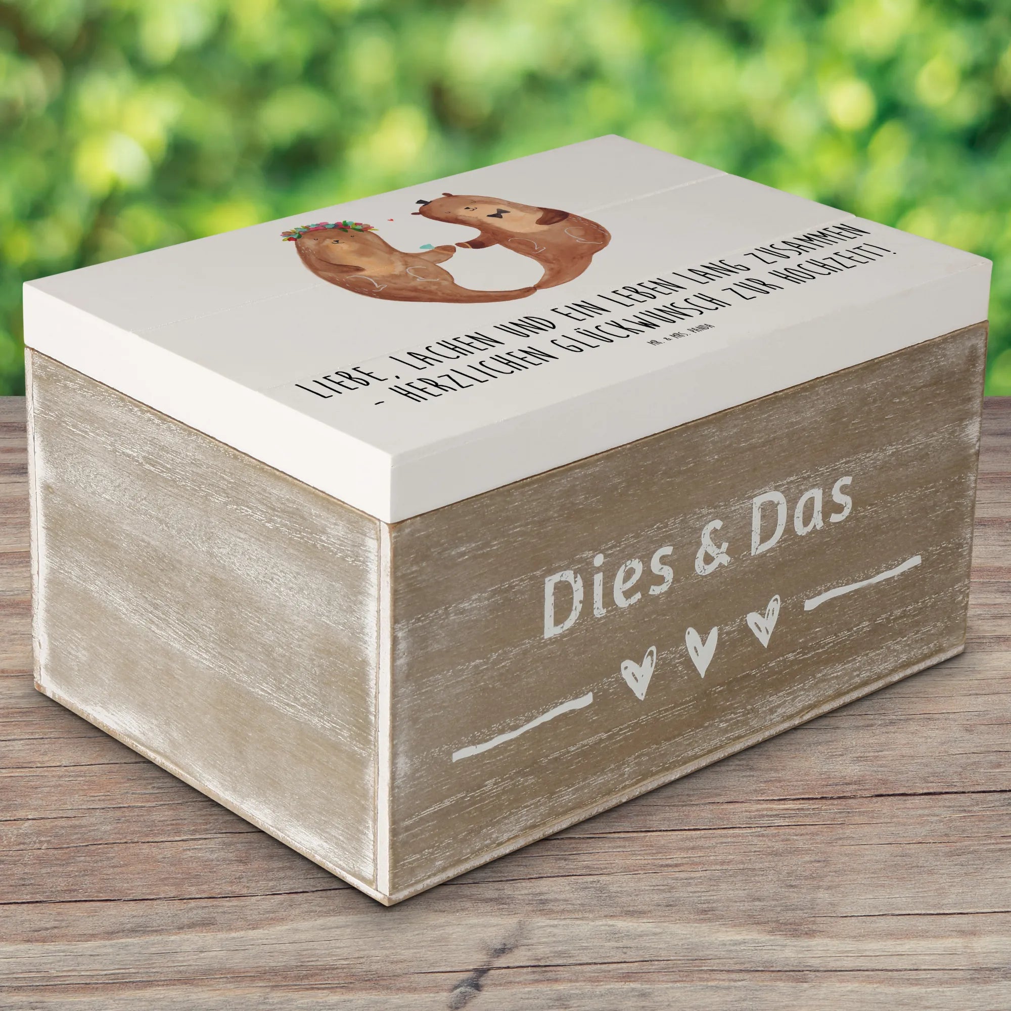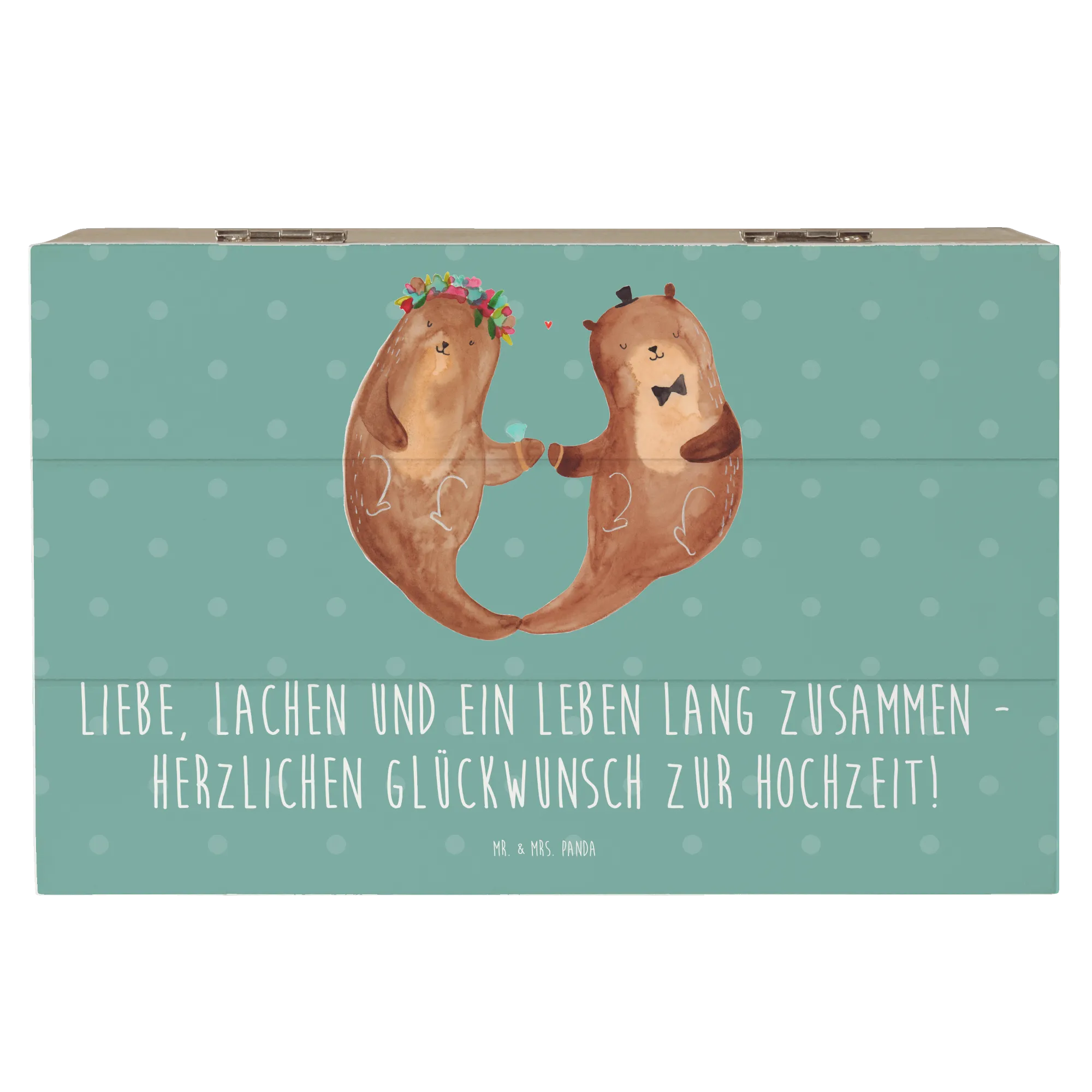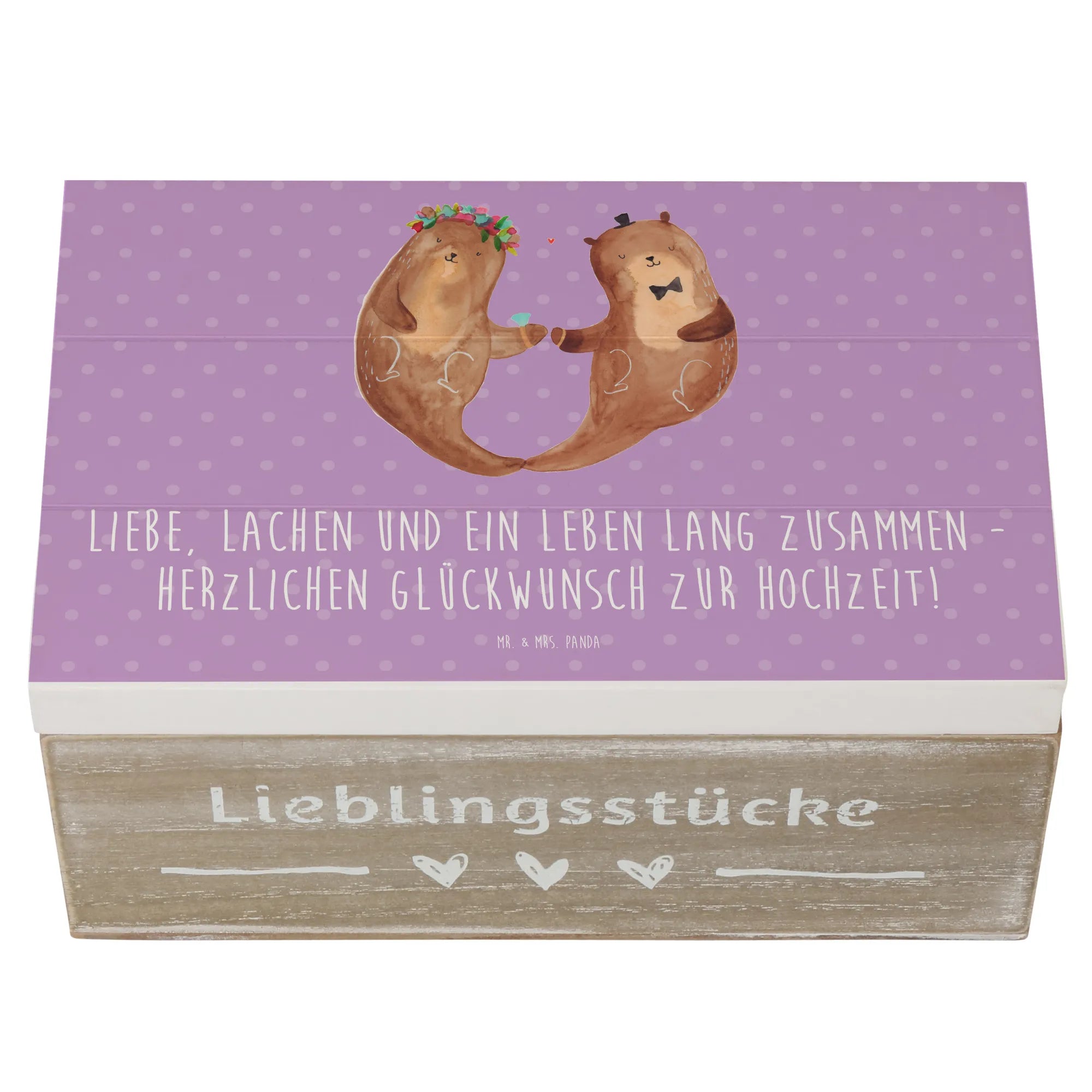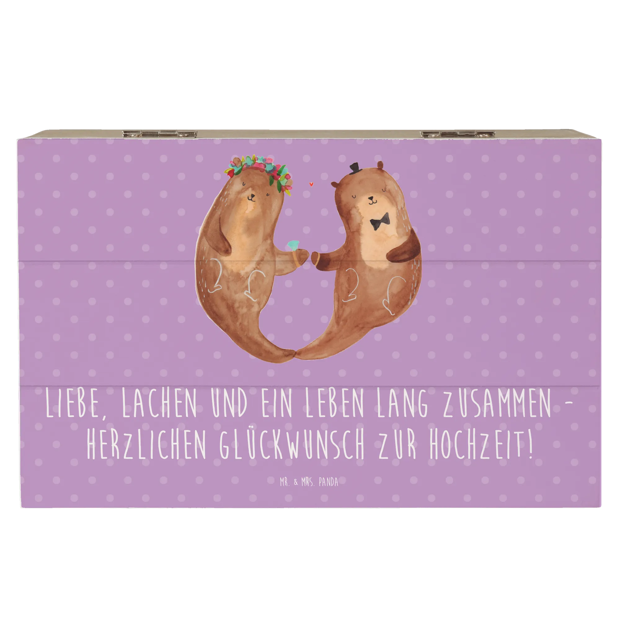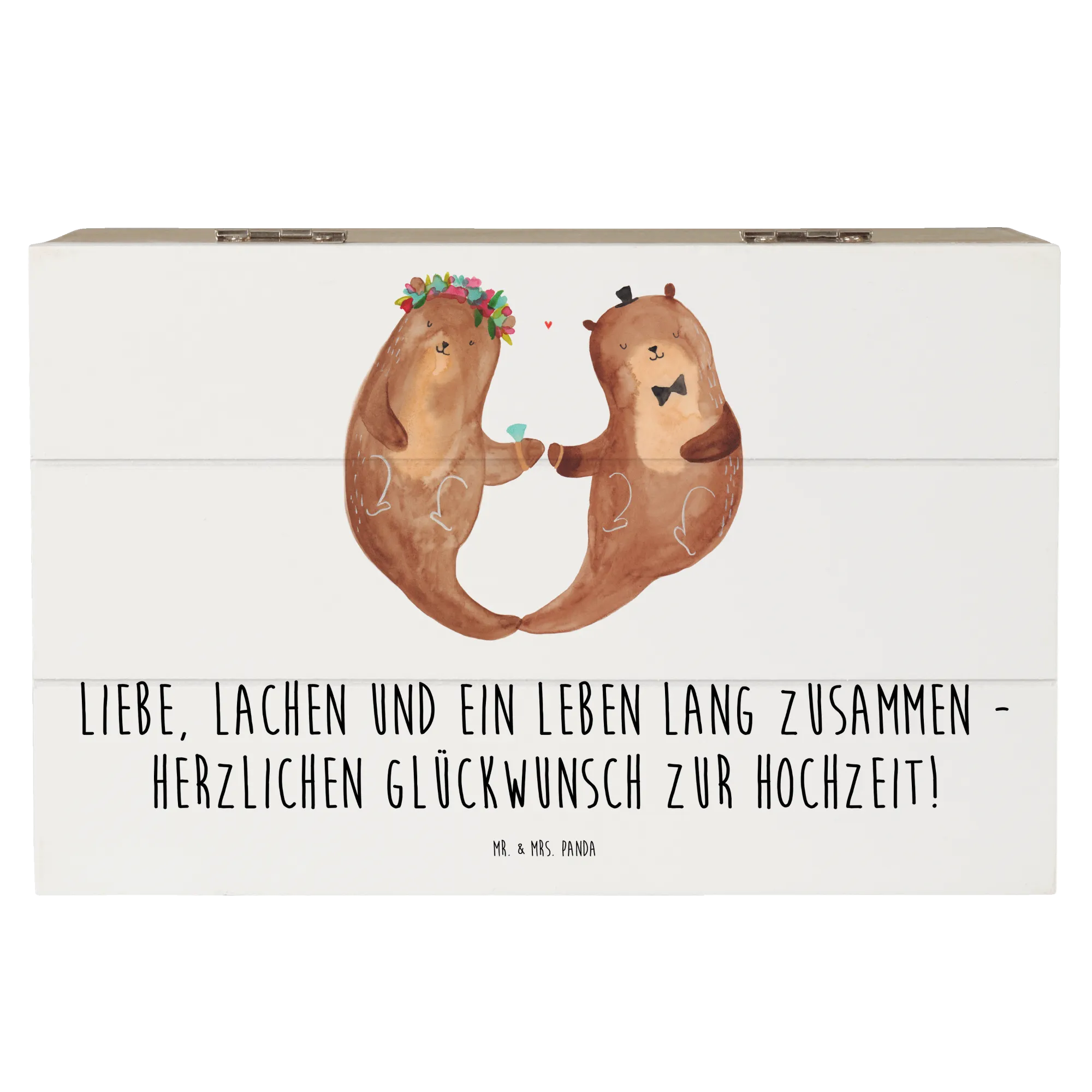 Details, die Freude machen: Die Kiste ist mit einem liebevollen Motiv und dem Hochzeits-Spruch bedruckt. Sie ist nicht personalisierbar, dafür hochwertig gestaltet und pflegeleicht mit einem feuchten Tuch zu reinigen. Entdecke die komplette Hochzeitskollektion von Mr. & Mrs. Panda für noch mehr romantische Ideen.