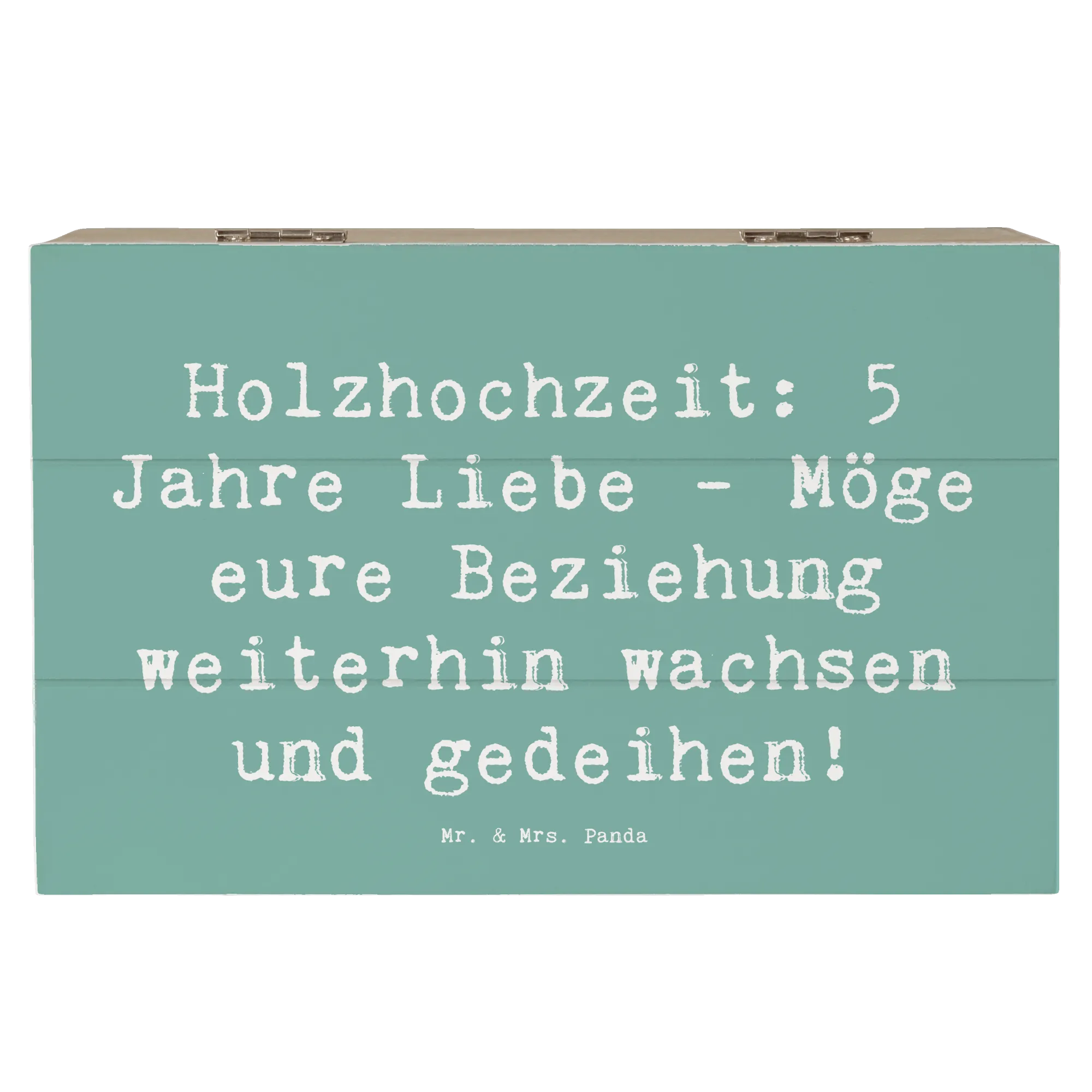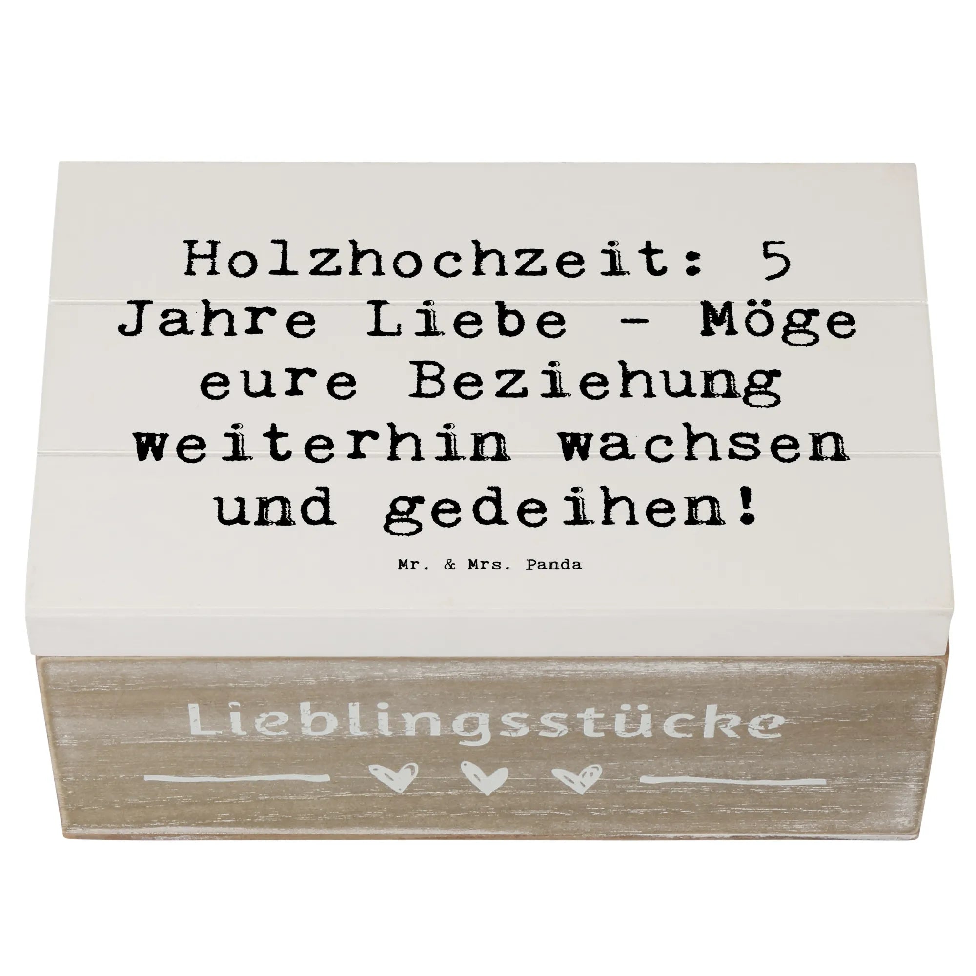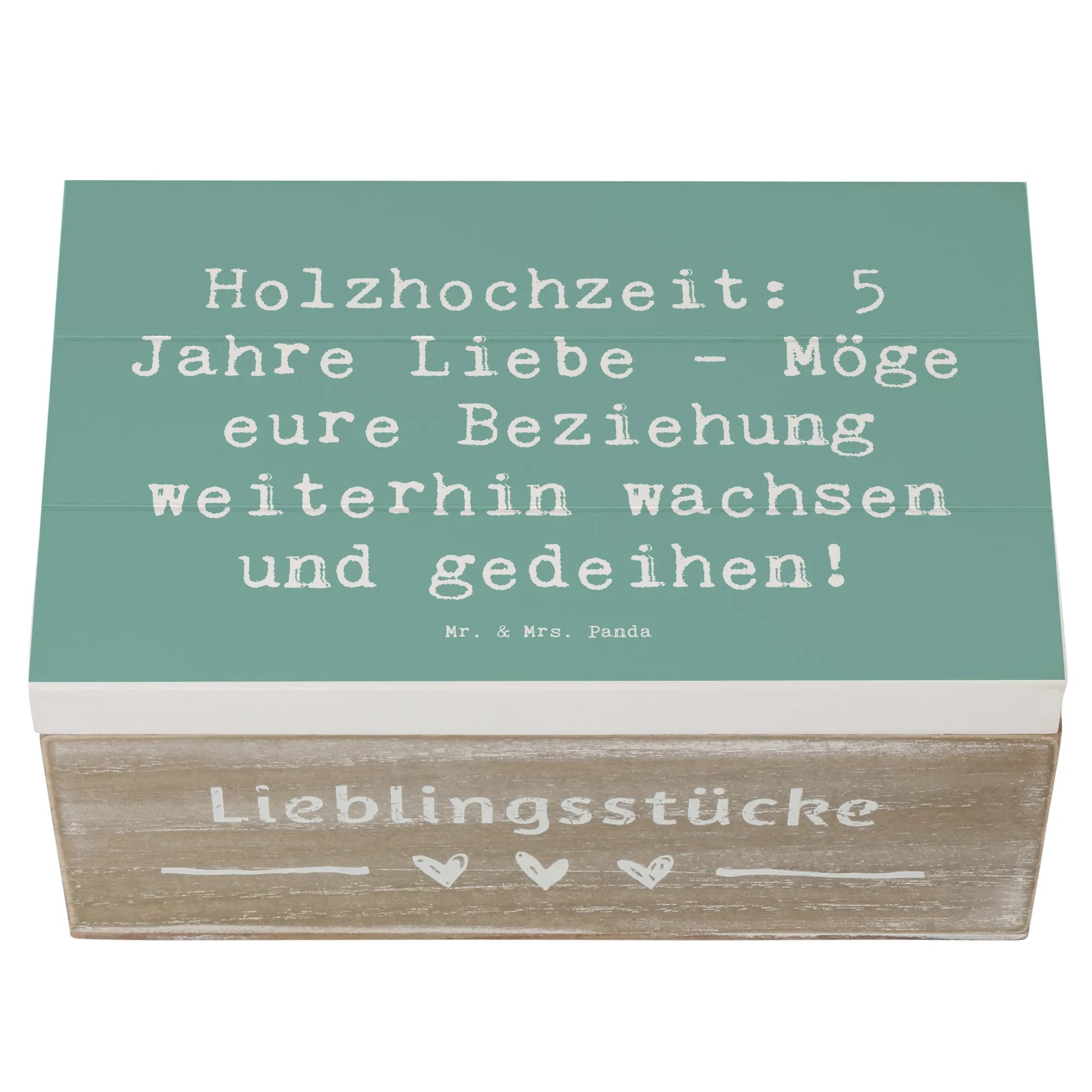 Die zauberhafte Holzkiste von Mr. & Mrs. Panda ist das perfekte Geschenk für den 5. Hochzeitstag, auch Holzhochzeit genannt! Mit dem liebevollen Spruch "Holzhochzeit: 5 Jahre Liebe - Möge eure Beziehung weiterhin wachsen und gedeihen!" bringt sie eine ganz besondere Note in eure Feier.