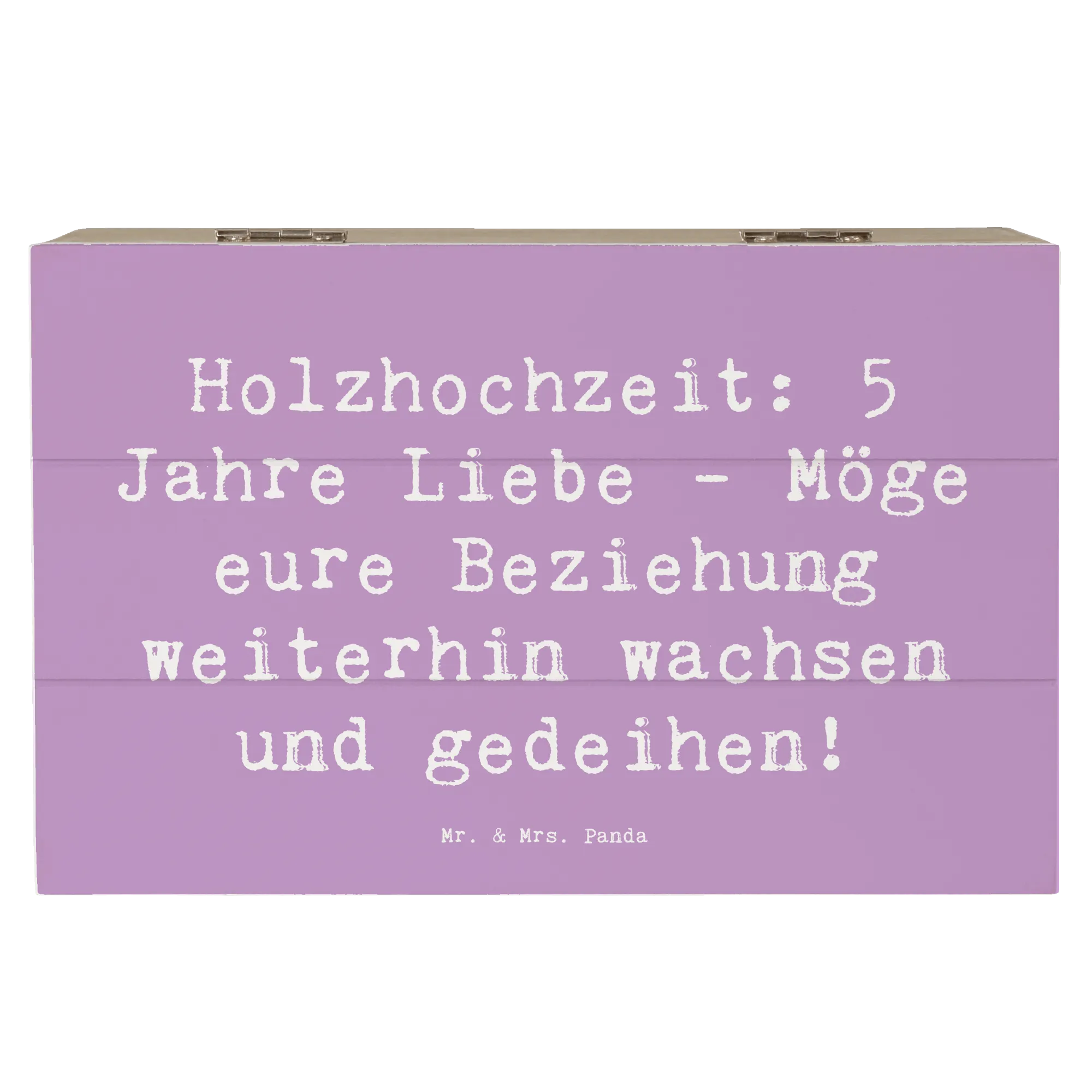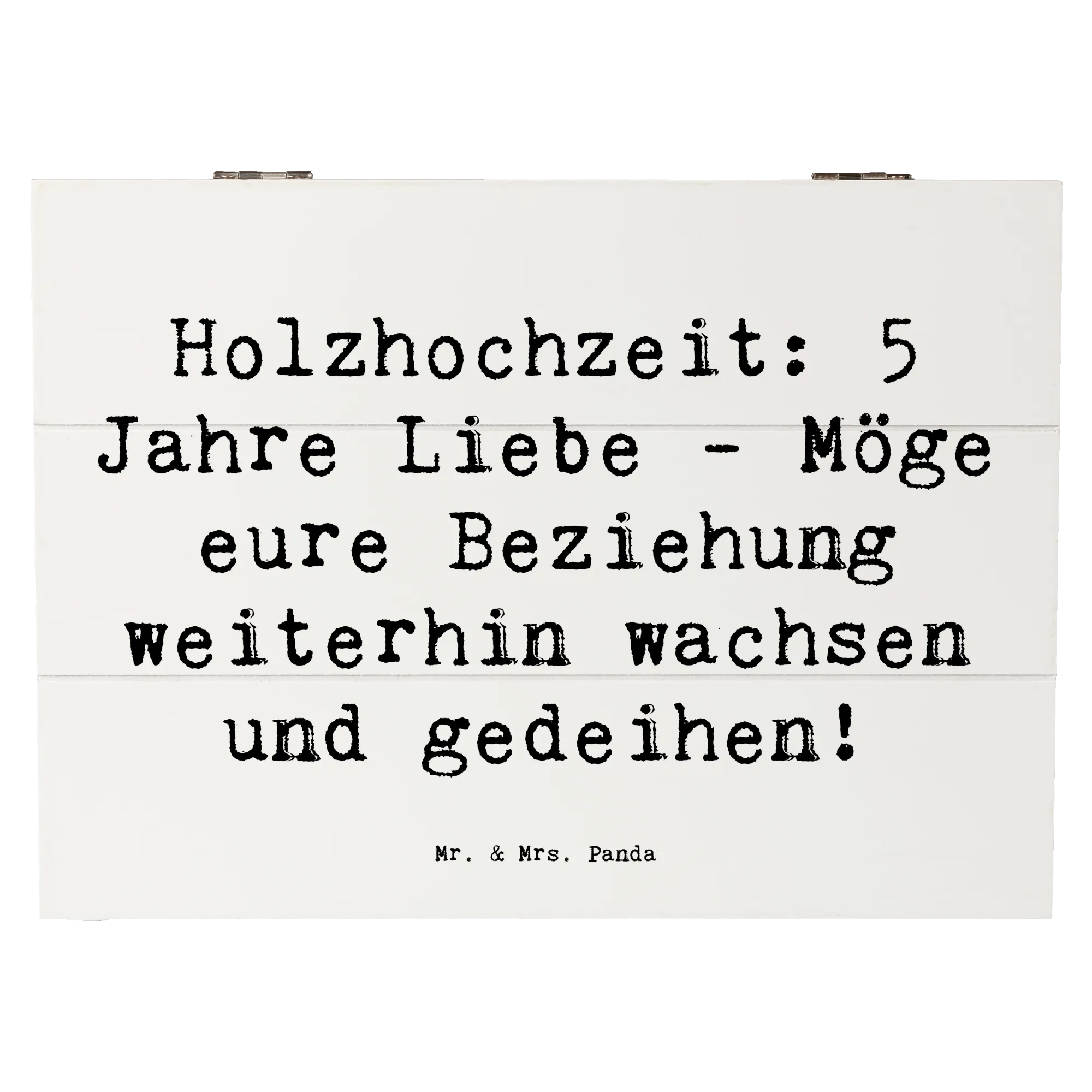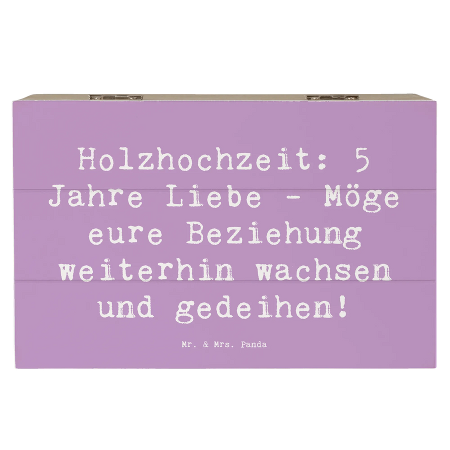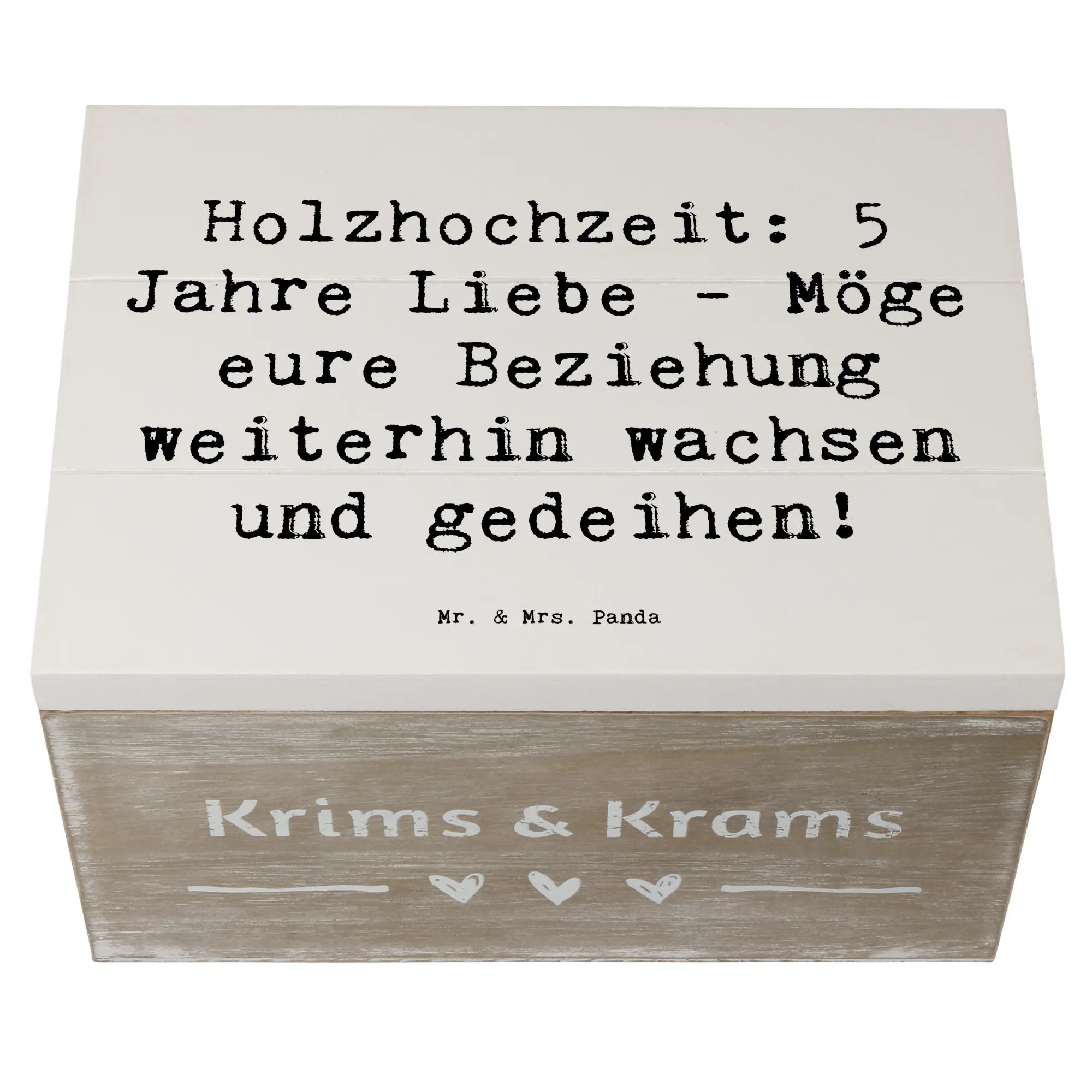 Die zauberhafte Holzkiste von Mr. & Mrs. Panda ist das perfekte Geschenk für den 5. Hochzeitstag, auch Holzhochzeit genannt! Mit dem liebevollen Spruch "Holzhochzeit: 5 Jahre Liebe - Möge eure Beziehung weiterhin wachsen und gedeihen!" bringt sie eine ganz besondere Note in eure Feier.