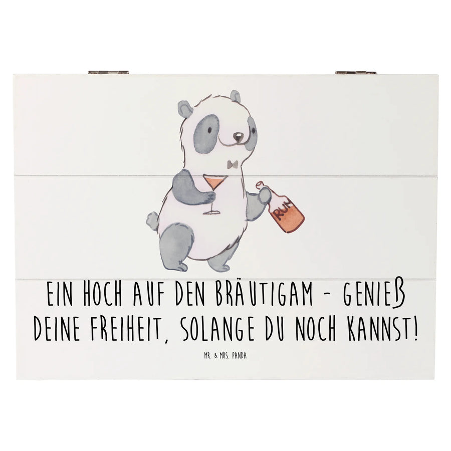 Eine wunderschöne Holzkiste von Mr. & Mrs. Panda, ideal für deinen Junggesellenabschied! Mit dem charmanten Motiv und dem Spruch "Ein Hoch auf den Bräutigam - genieß deine Freiheit, solange du noch kannst!" ist diese Kiste das perfekte Geschenk für den baldigen Bräutigam. Ob als Aufbewahrungsort für Erinnerungsstücke, wie Fotos, kleine Geschenke oder Memes von diesem besonderen Tag - diese Erinnerungskiste ist sowohl stilvoll als auch funktional.