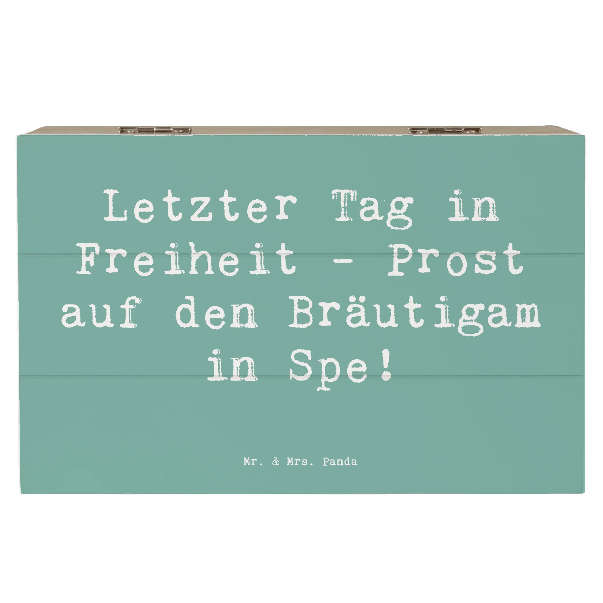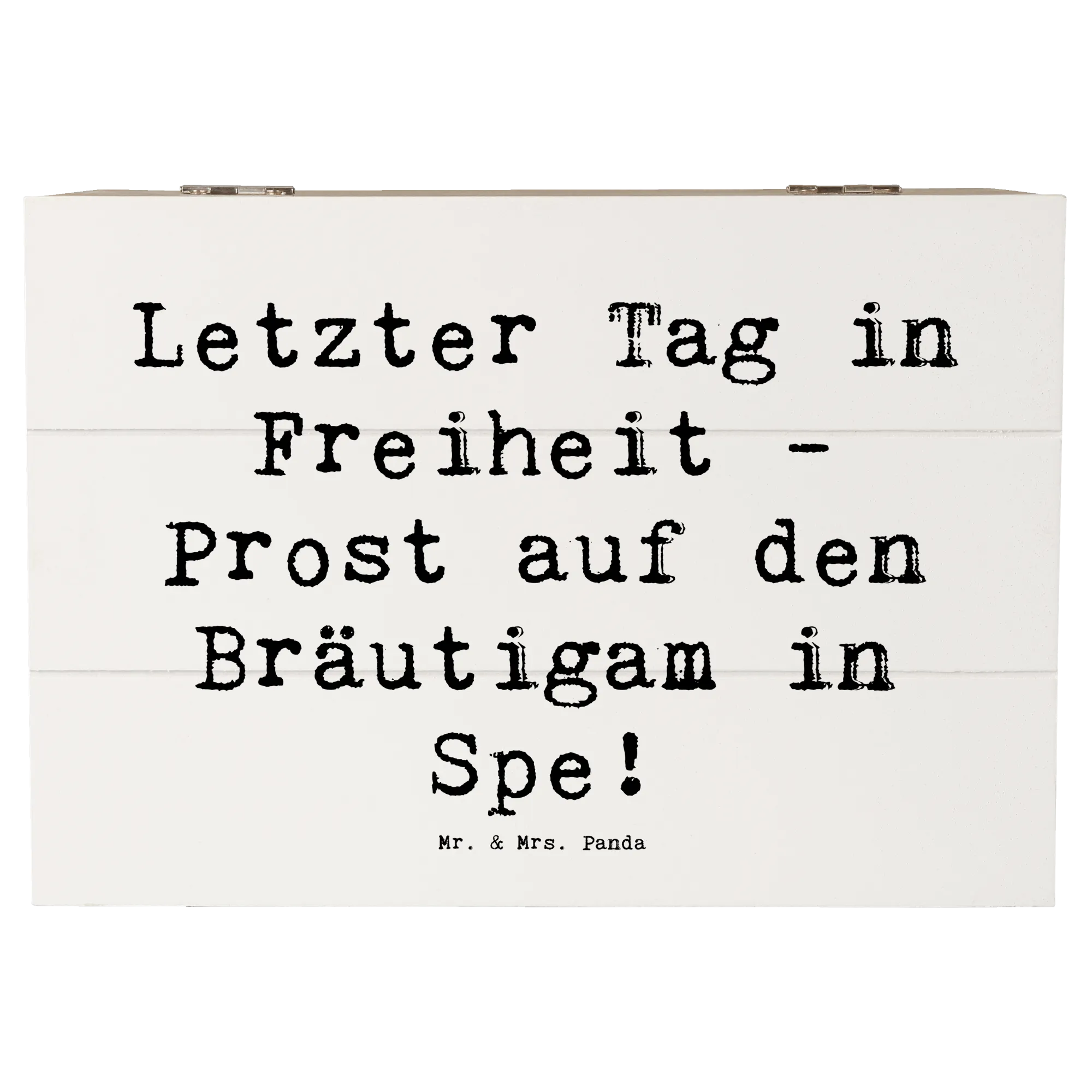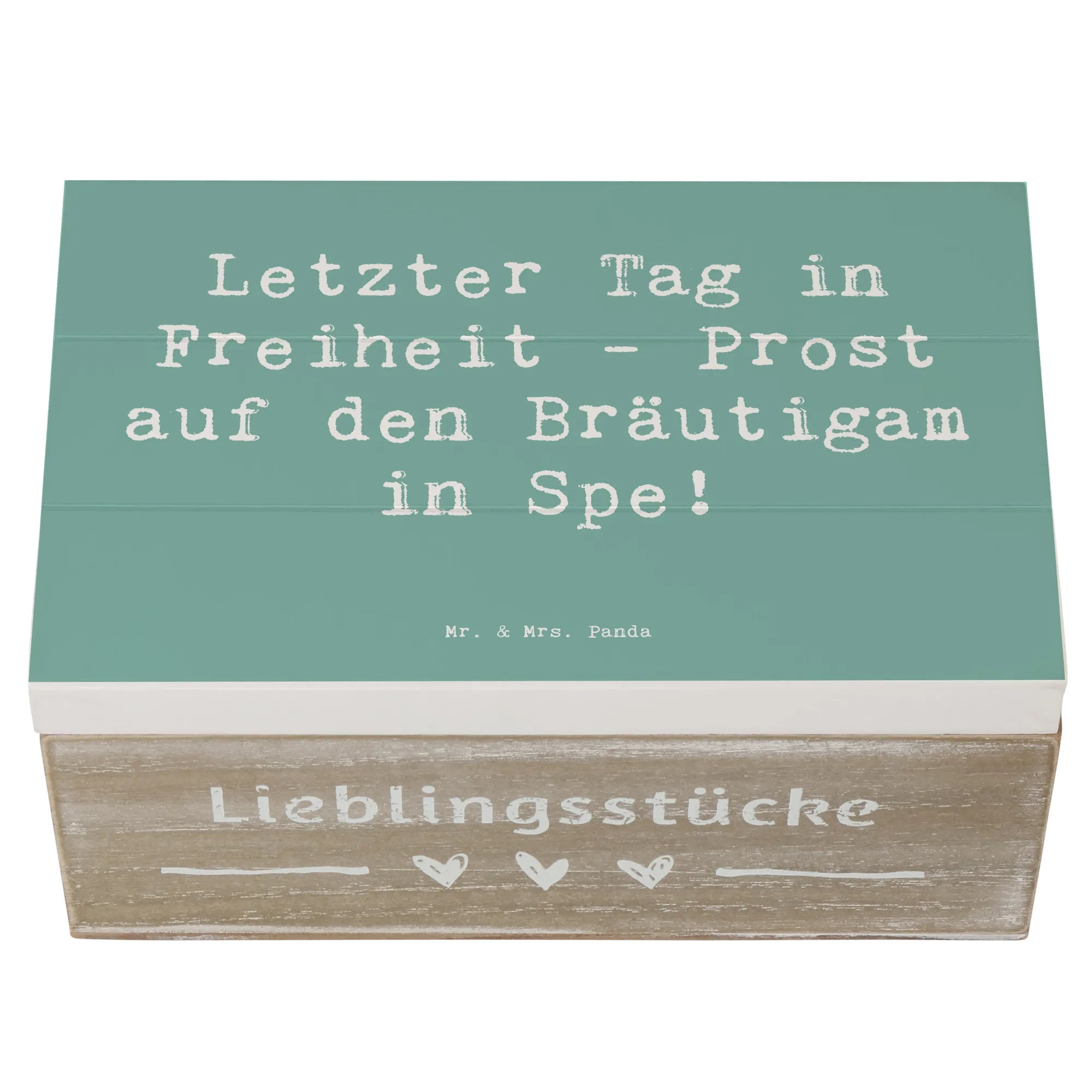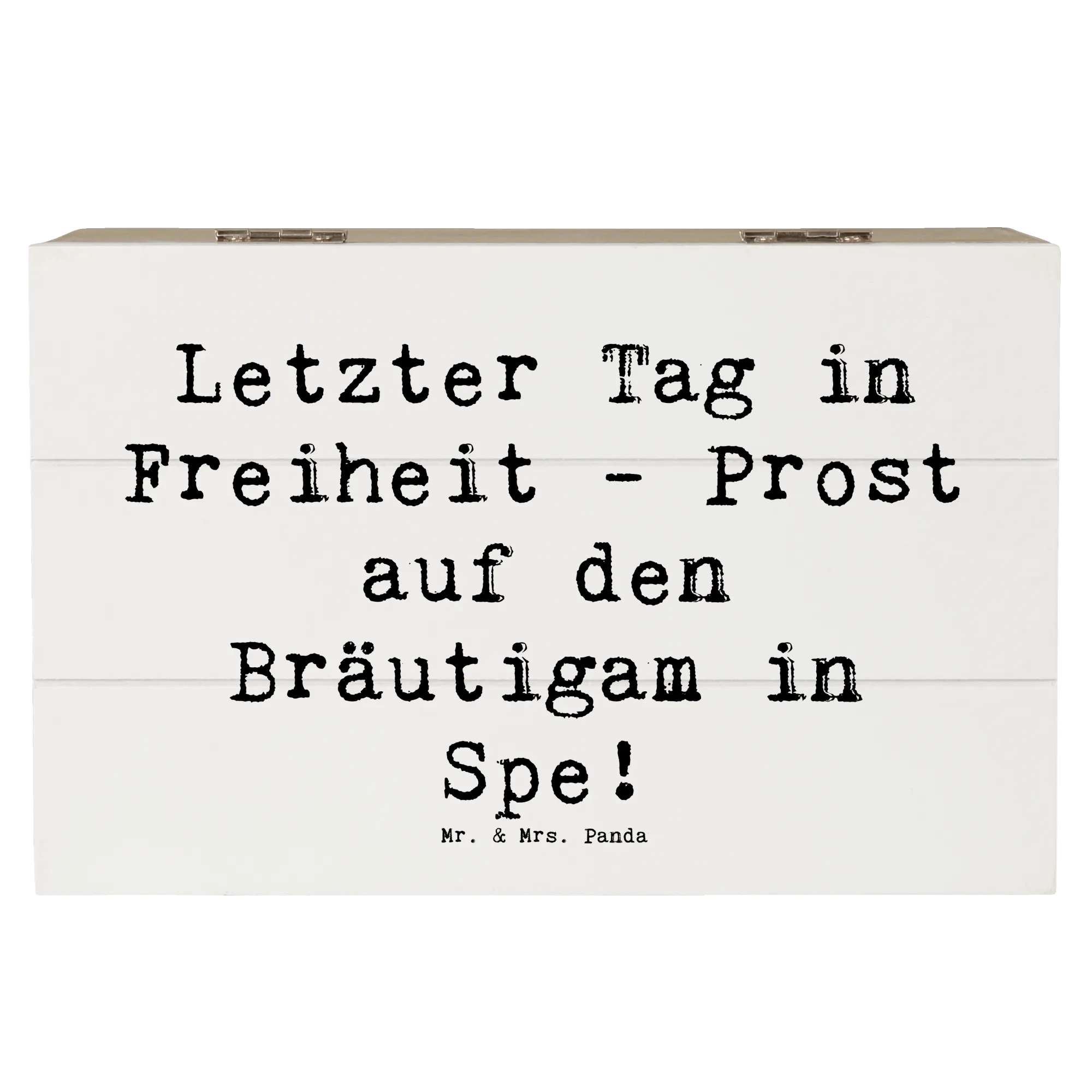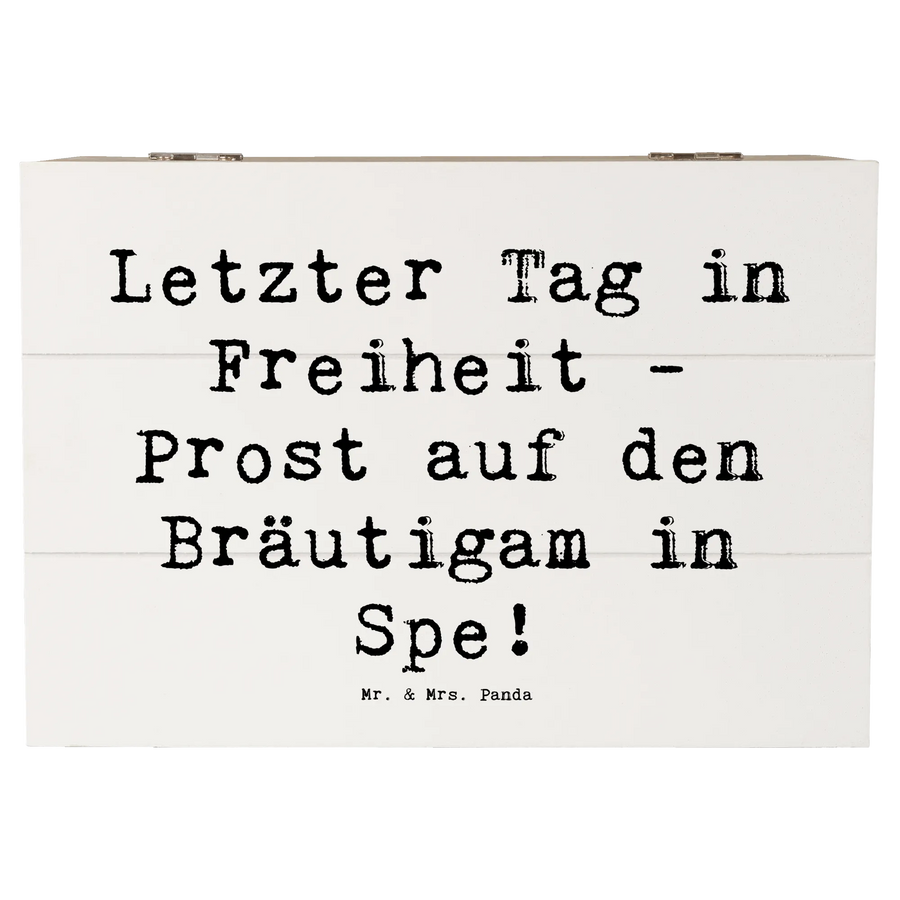 Mr. & Mrs. Panda Holzkiste Junggesellenabschied – die perfekte Mischung aus Witz und Erinnerung. Mit dem Spruch "Letzter Tag in Freiheit - Prost auf den Bräutigam in Spe!" ist diese Aufbewahrungsbox Holz ein wunderbares Geschenk für alle, die den Junggesellenabschied feiern oder nach einer besonderen Hochzeit Geschenkbox suchen.