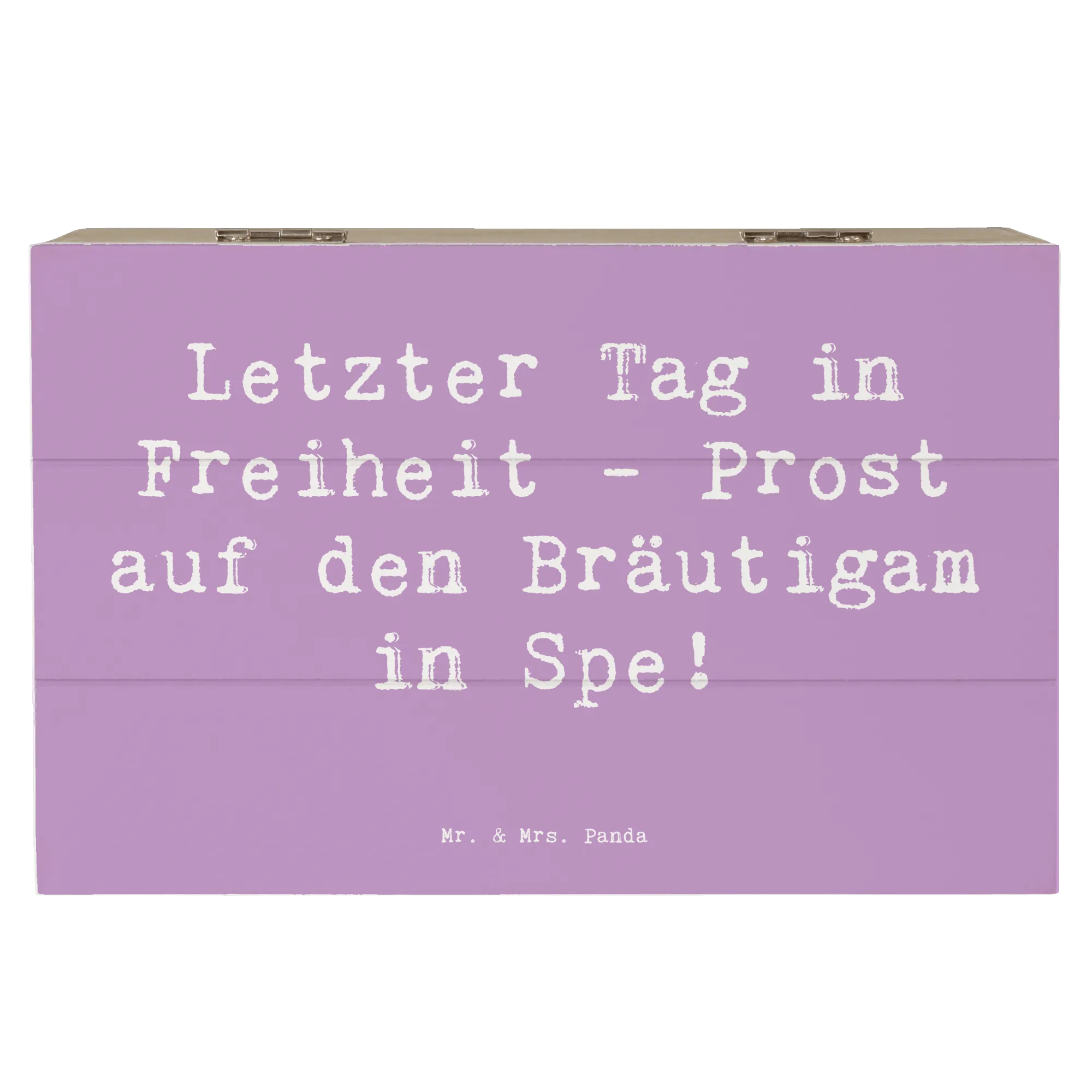 Bist du auf der Suche nach dem perfekten Geschenk für einen Junggesellenabschied? Dann ist die wunderschöne Holzkiste von Mr. & Mrs. Panda genau das Richtige! Diese einzigartig gestaltete Erinnerungsbox ist nicht nur ein idealer Aufbewahrungsort für ganz besondere Schätze, sondern auch ein herzlicher Begleiter für einen der wichtigsten Tage im Leben eines Bräutigams. Die Holzkiste kommt in einer robusten Premium Hartfaser und ist bedruckt mit dem liebevollen Spruch „Letzter Tag in Freiheit - Prost auf den Bräutigam in Spe!“. Sie bietet Platz für Erinnerungen, Fotos und kleine Überraschungen, die an diesen besonderen Tag erinnern.