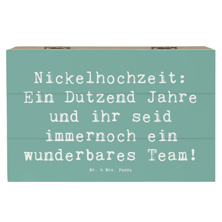 Wenn Du auf der Suche nach dem perfekten Geschenk zum 12. Hochzeitstag bist, dann ist unsere zauberhafte Holzkiste mit dem Motiv "Nickelhochzeit: Ein Dutzend Jahre und ihr seid immernoch ein wunderbares Team!" von Mr. & Mrs. Panda genau das Richtige für Dich!