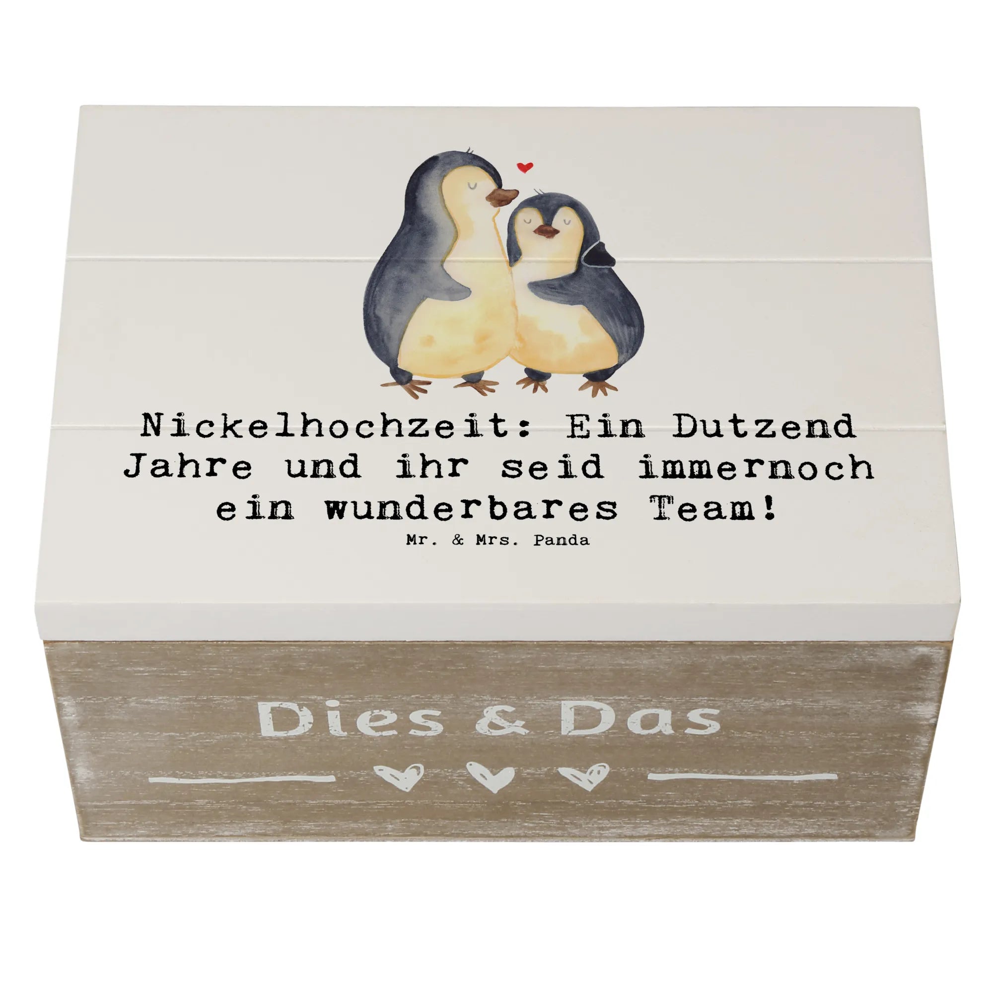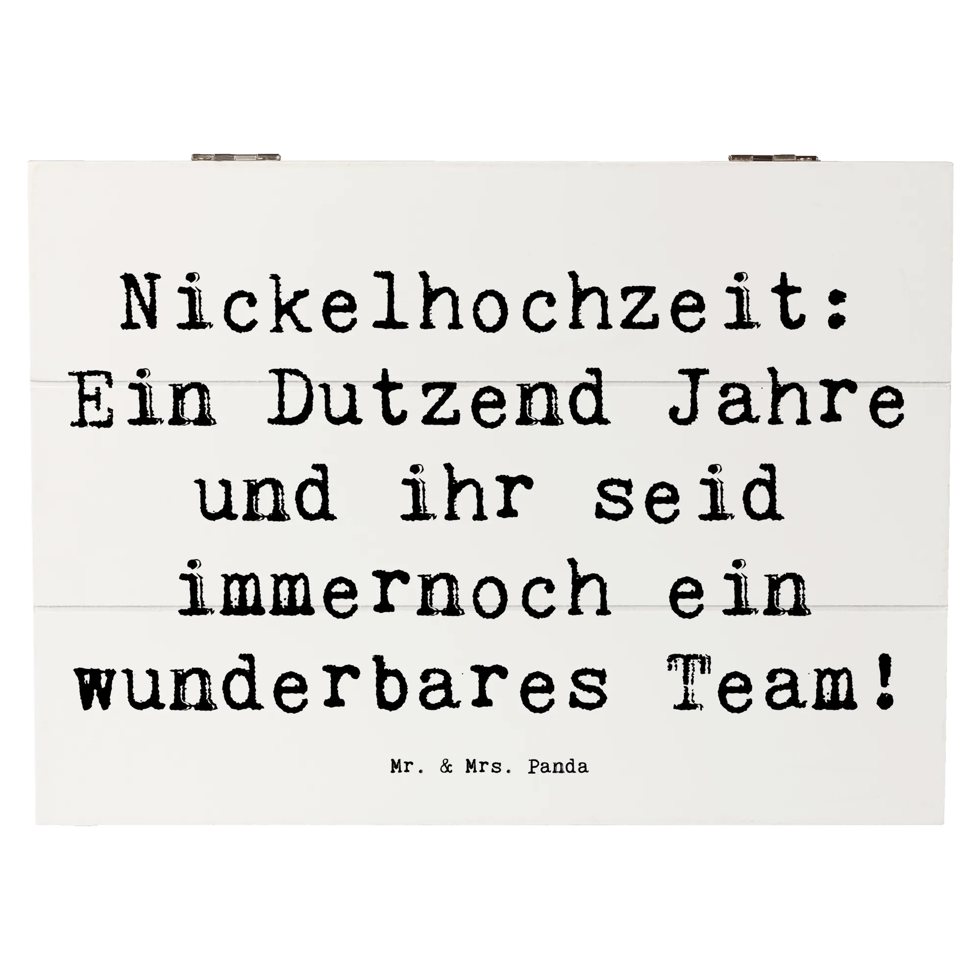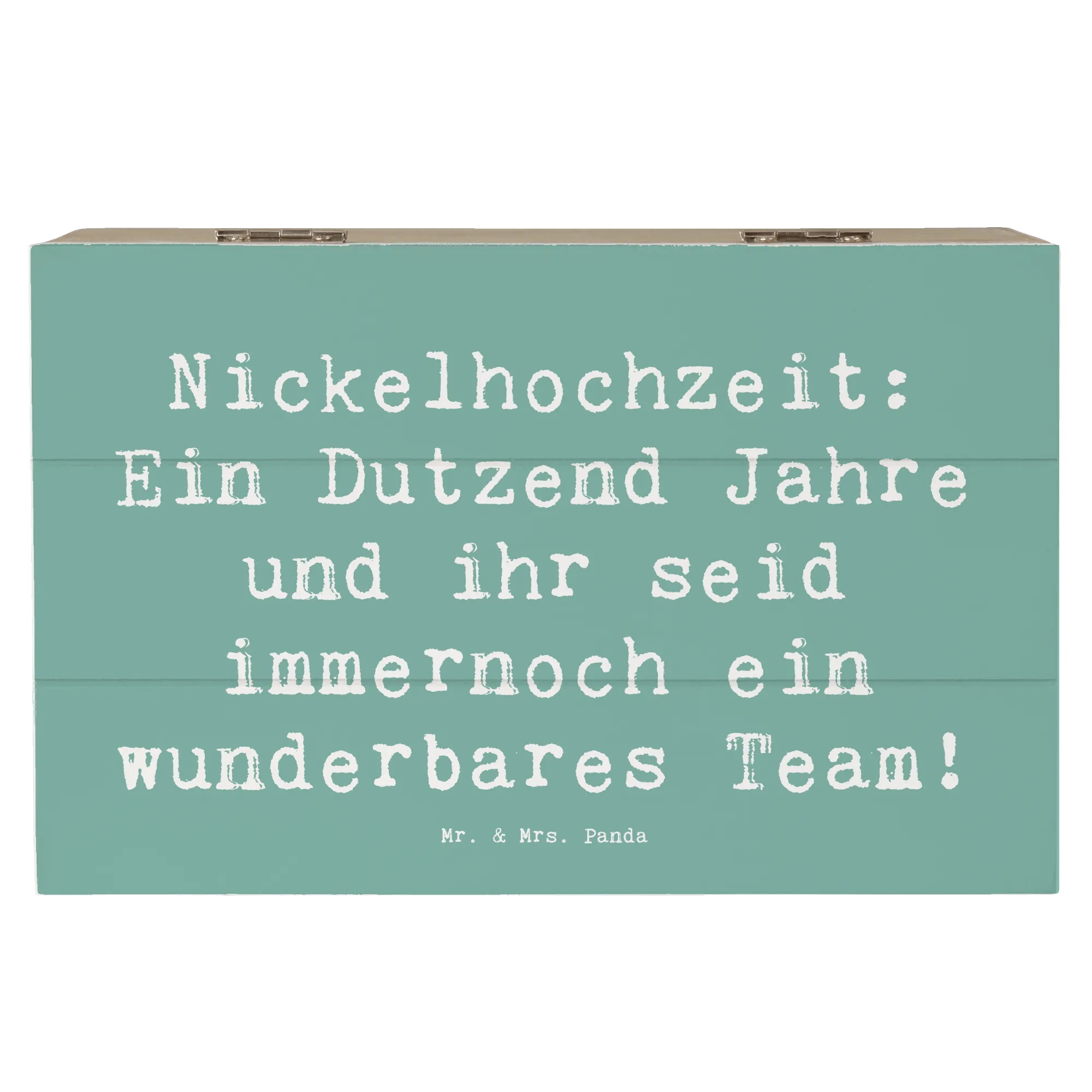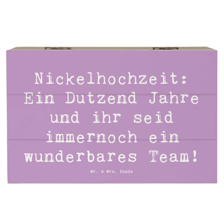 Wenn Du auf der Suche nach dem perfekten Geschenk zum 12. Hochzeitstag bist, dann ist unsere zauberhafte Holzkiste mit dem Motiv "Nickelhochzeit: Ein Dutzend Jahre und ihr seid immernoch ein wunderbares Team!" von Mr. & Mrs. Panda genau das Richtige für Dich!