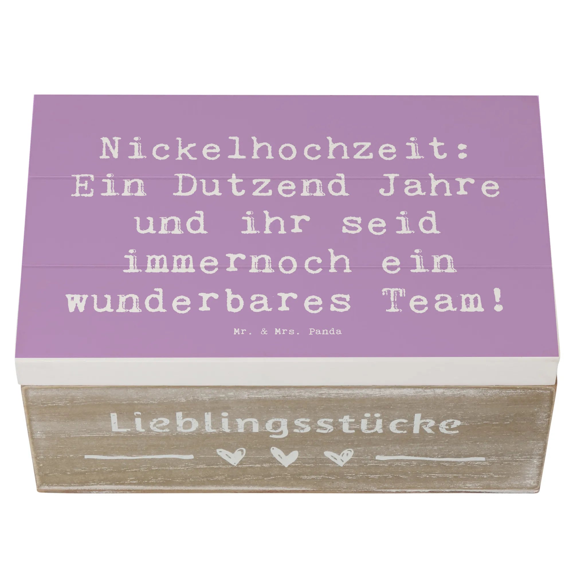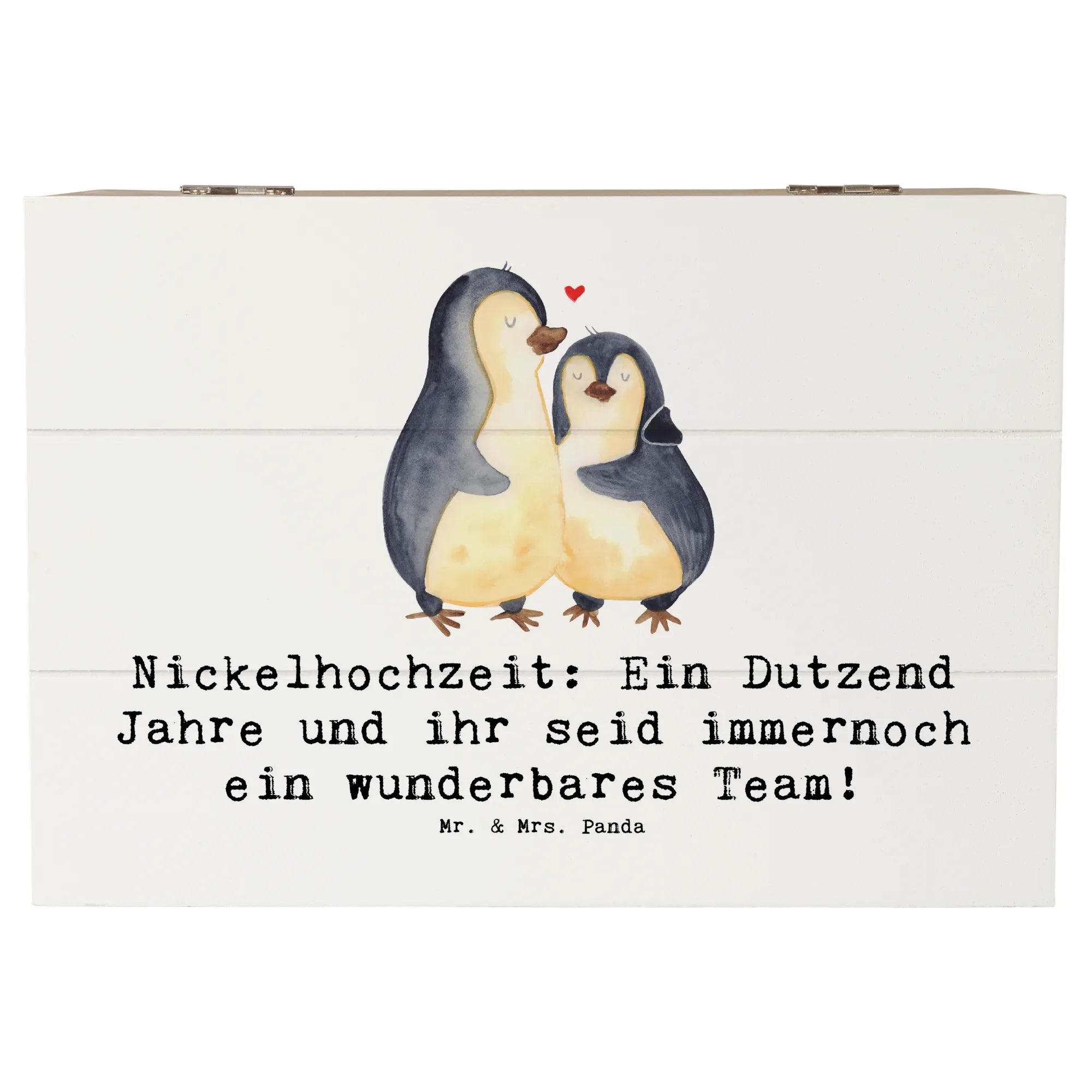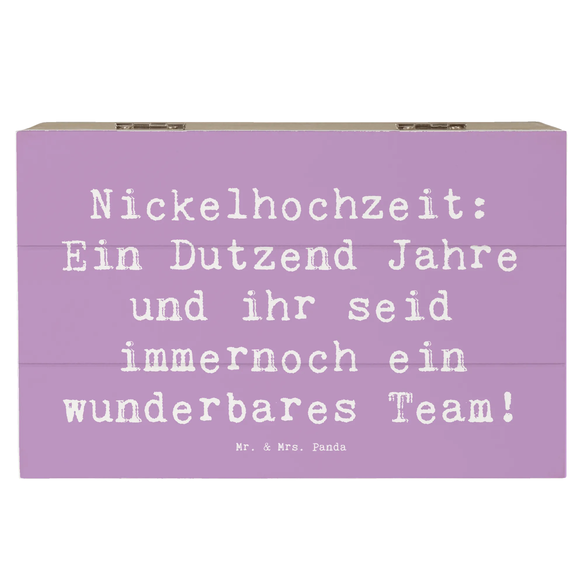 Wenn Du auf der Suche nach dem perfekten Geschenk zum 12. Hochzeitstag bist, dann ist unsere zauberhafte Holzkiste mit dem Motiv "Nickelhochzeit: Ein Dutzend Jahre und ihr seid immernoch ein wunderbares Team!" von Mr. & Mrs. Panda genau das Richtige für Dich!