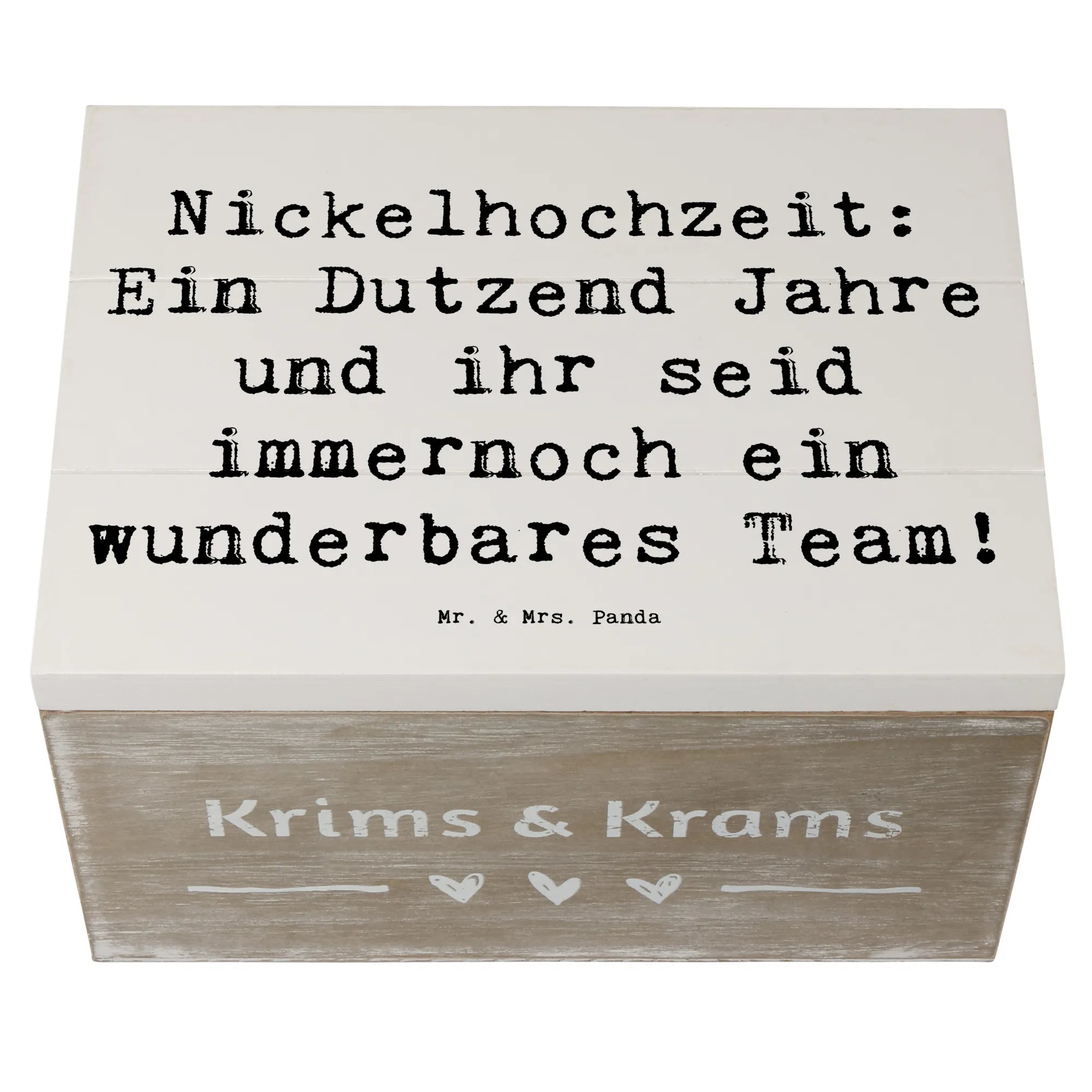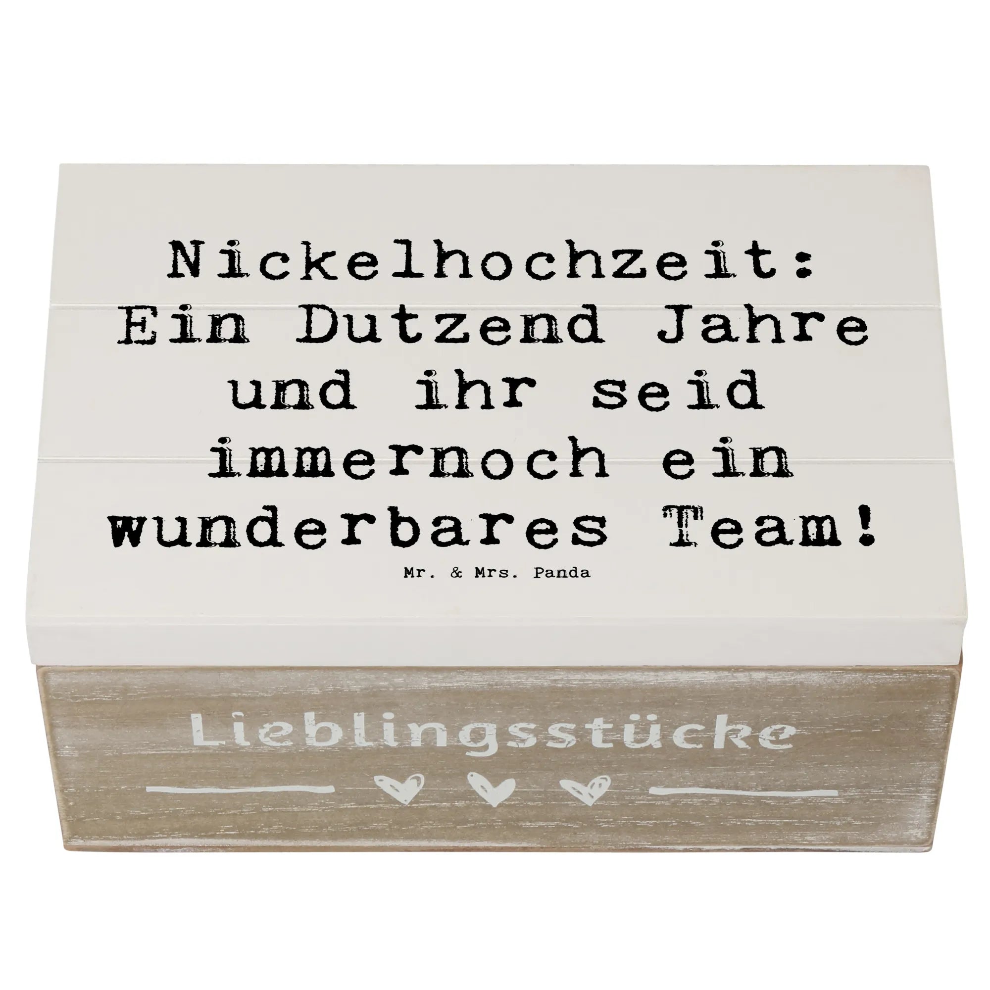 Die wunderschöne Holzkiste von Mr. & Mrs. Panda ist das perfekte Geschenk zur Nickelhochzeit - dem 12. Hochzeitstag. Diese bezaubernde Erinnerungskiste ist nicht nur ein praktischer Aufbewahrungsort für schätze Erinnerungen, sondern auch ein stilvoller Hingucker in jedem Zuhause. Mit dem liebevoll gestalteten Slogan „Nickelhochzeit: Ein Dutzend Jahre und ihr seid immernoch ein wunderbares Team!“ wird nach 12 Jahren Zweisamkeit heiter an die gemeinsamen Erlebnisse erinnert.