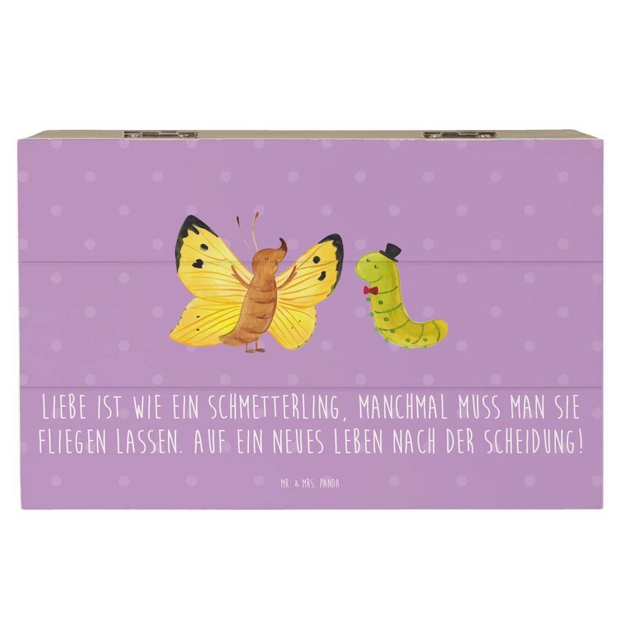 Die wunderschöne Holzkiste von Mr. & Mrs. Panda ist die perfekte Aufbewahrungsbox für all die besonderen Momente in deinem Leben. Diese Erinnerungskiste, bedruckt mit dem Slogan 'Liebe ist wie ein Schmetterling, manchmal muss man sie fliegen lassen. Auf ein neues Leben nach der Scheidung!', eignet sich hervorragend als Geschenk zur Scheidung oder als tolles Andenken an eine Hochzeit. Ob für Fotos, liebevolle Erinnerungen oder andere Schätze - diese Dekokiste bietet dir nicht nur die Möglichkeit, deine Erinnerungen sicher aufzubewahren, sondern sieht dabei auch wunderschön aus!