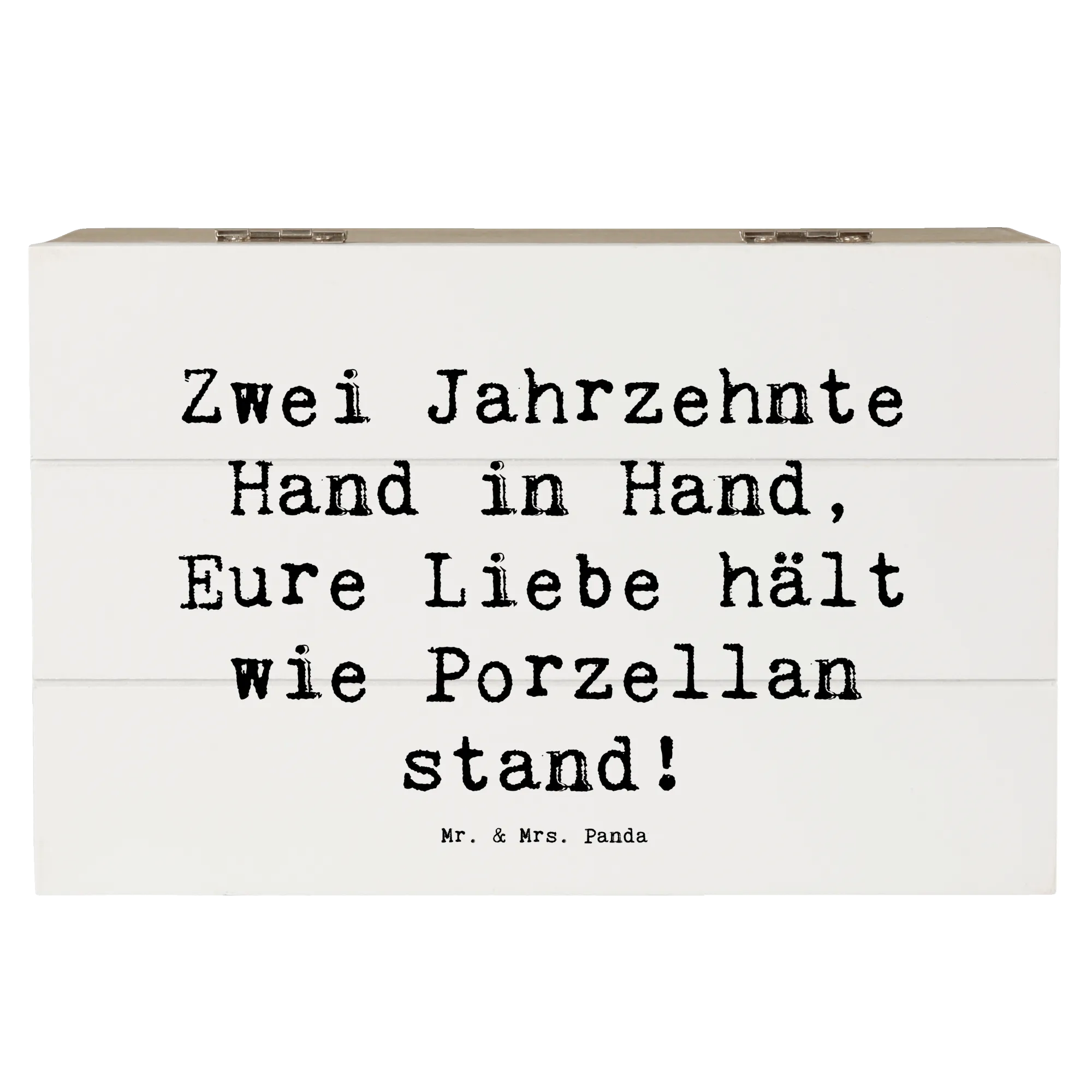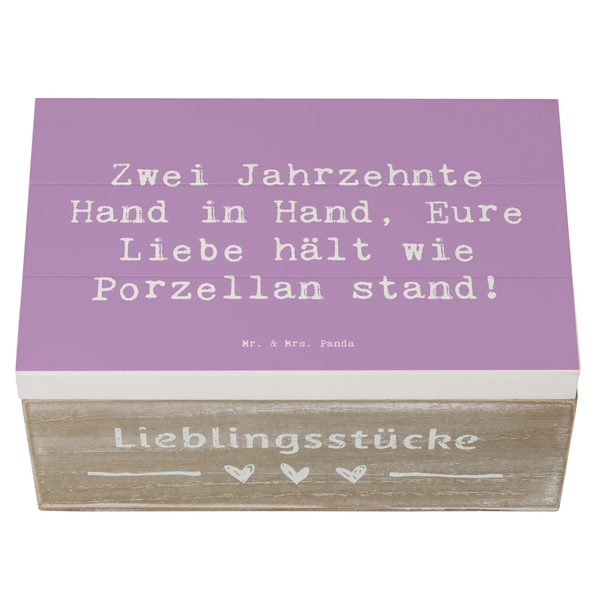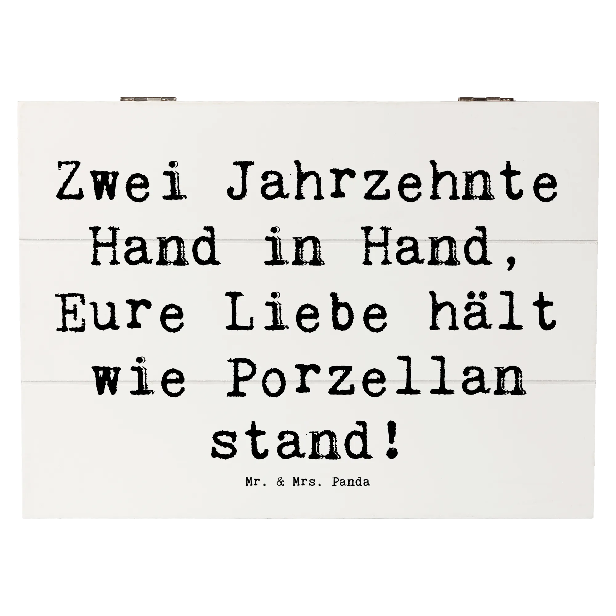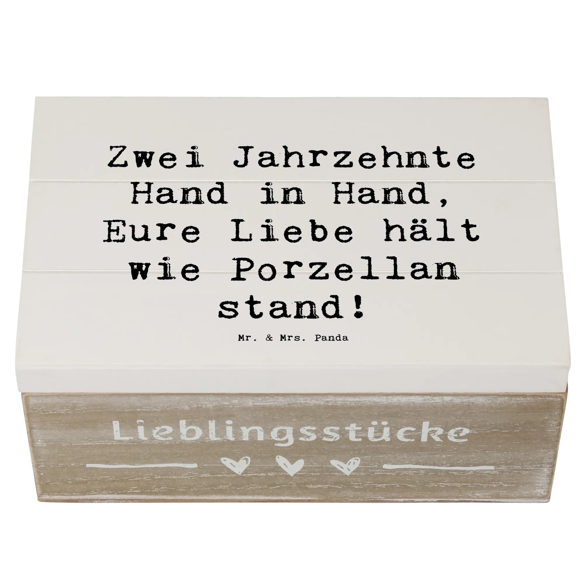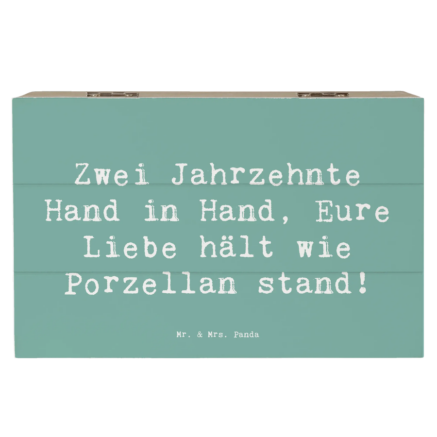 Entdecke die perfekte Geschenkidee zum 20. Hochzeitstag mit unserer zauberhaften Holzkiste von Mr. & Mrs. Panda! Diese wunderschöne Kiste, größenmäßig ideal für besondere Schätze, ist liebevoll bedruckt mit dem Spruch: 'Zwei Jahrzehnte Hand in Hand, Eure Liebe hält wie Porzellan stand!'.
