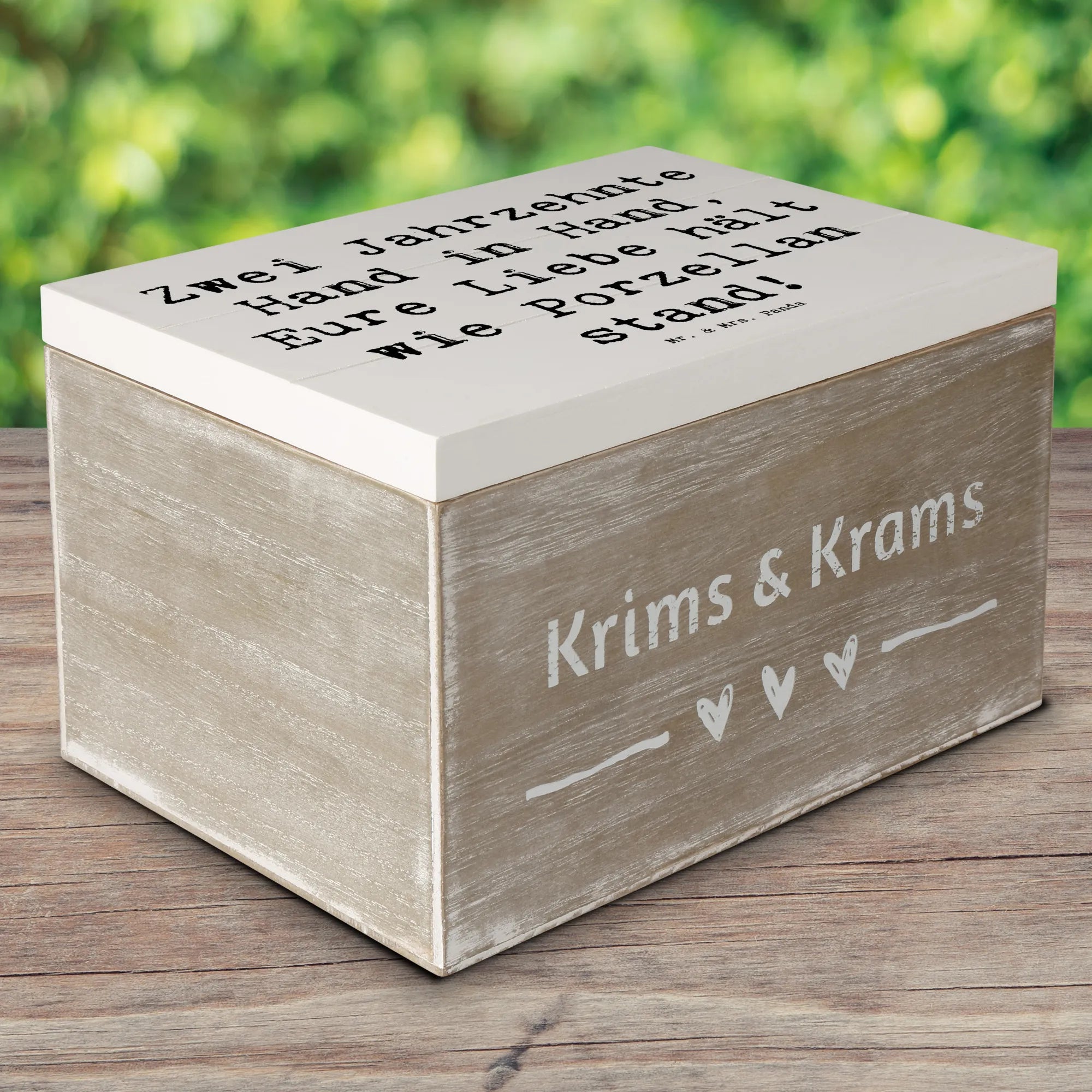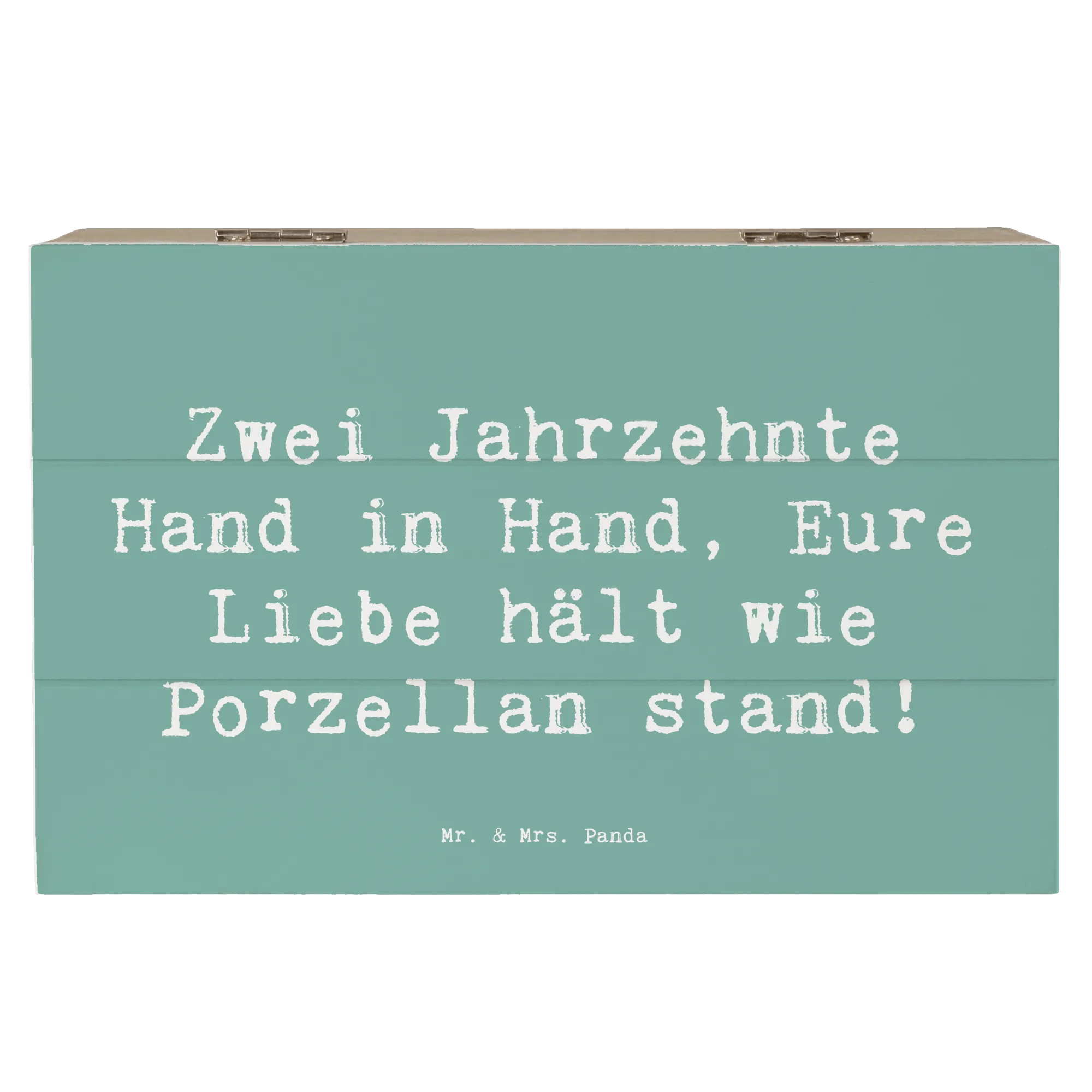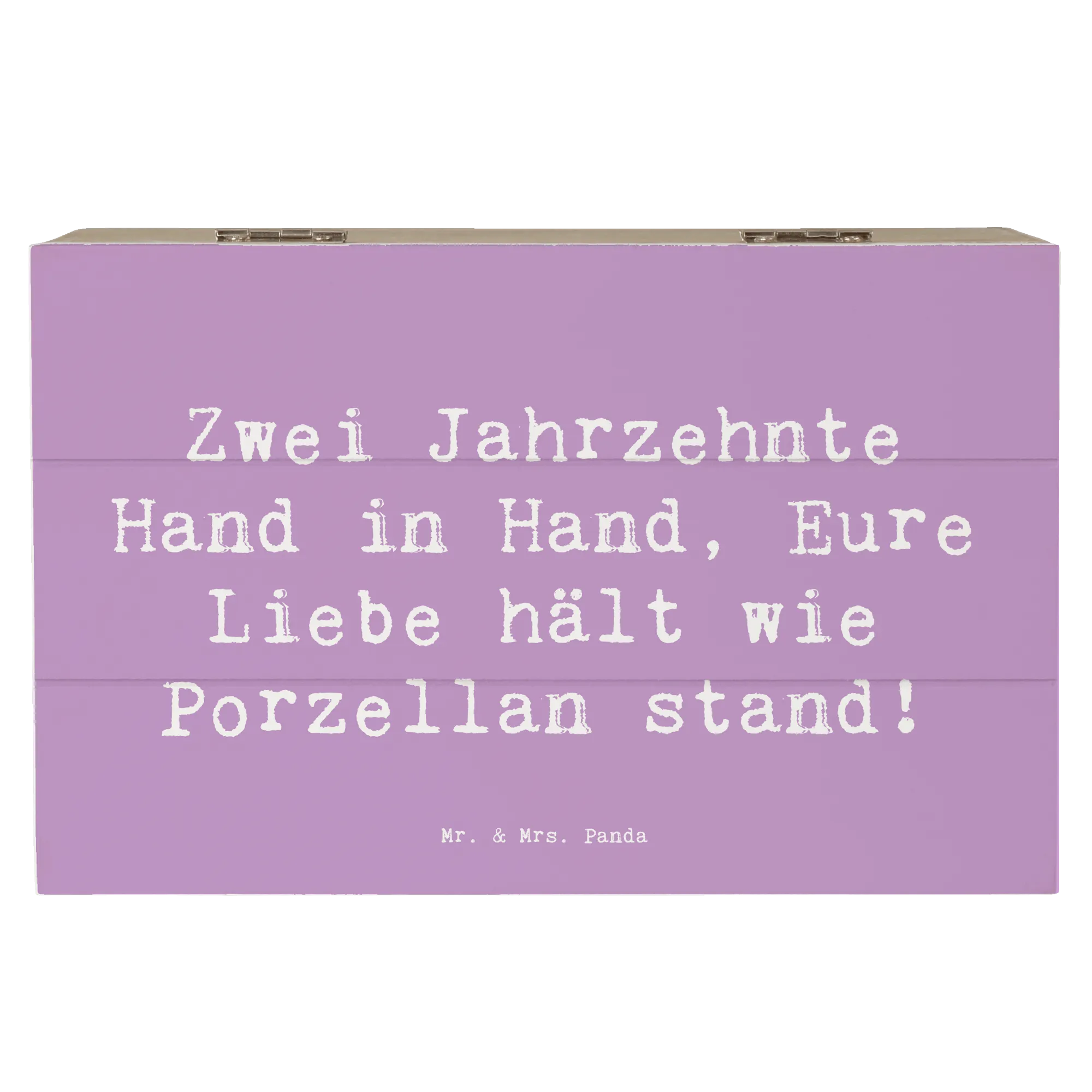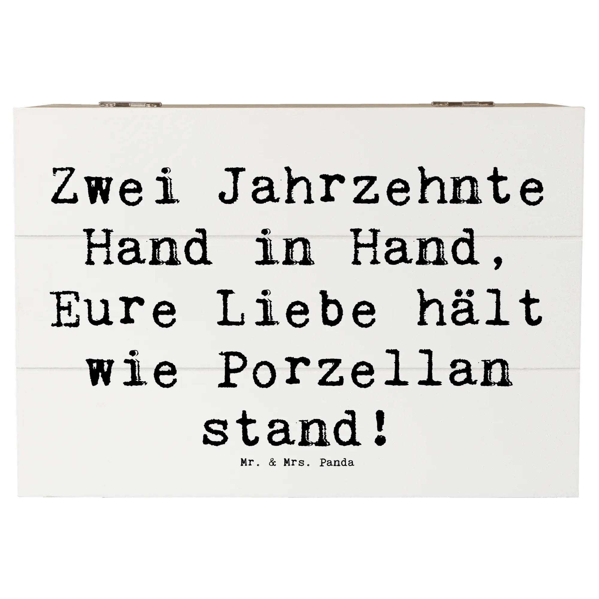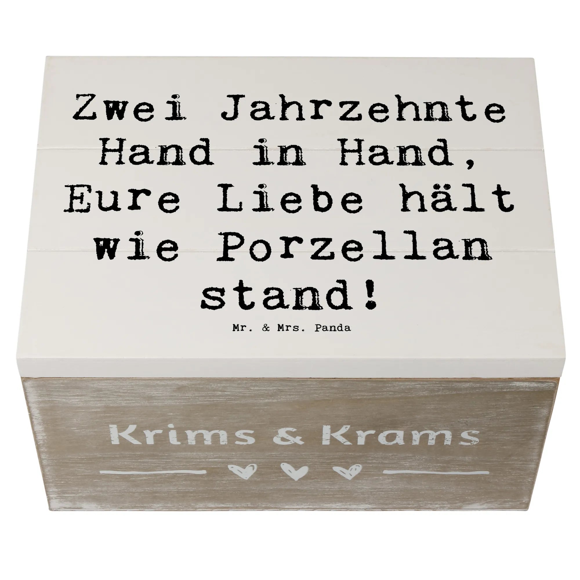 Entdecke die perfekte Geschenkidee zum 20. Hochzeitstag mit unserer zauberhaften Holzkiste von Mr. & Mrs. Panda! Diese wunderschöne Kiste, größenmäßig ideal für besondere Schätze, ist liebevoll bedruckt mit dem Spruch: 'Zwei Jahrzehnte Hand in Hand, Eure Liebe hält wie Porzellan stand!'.