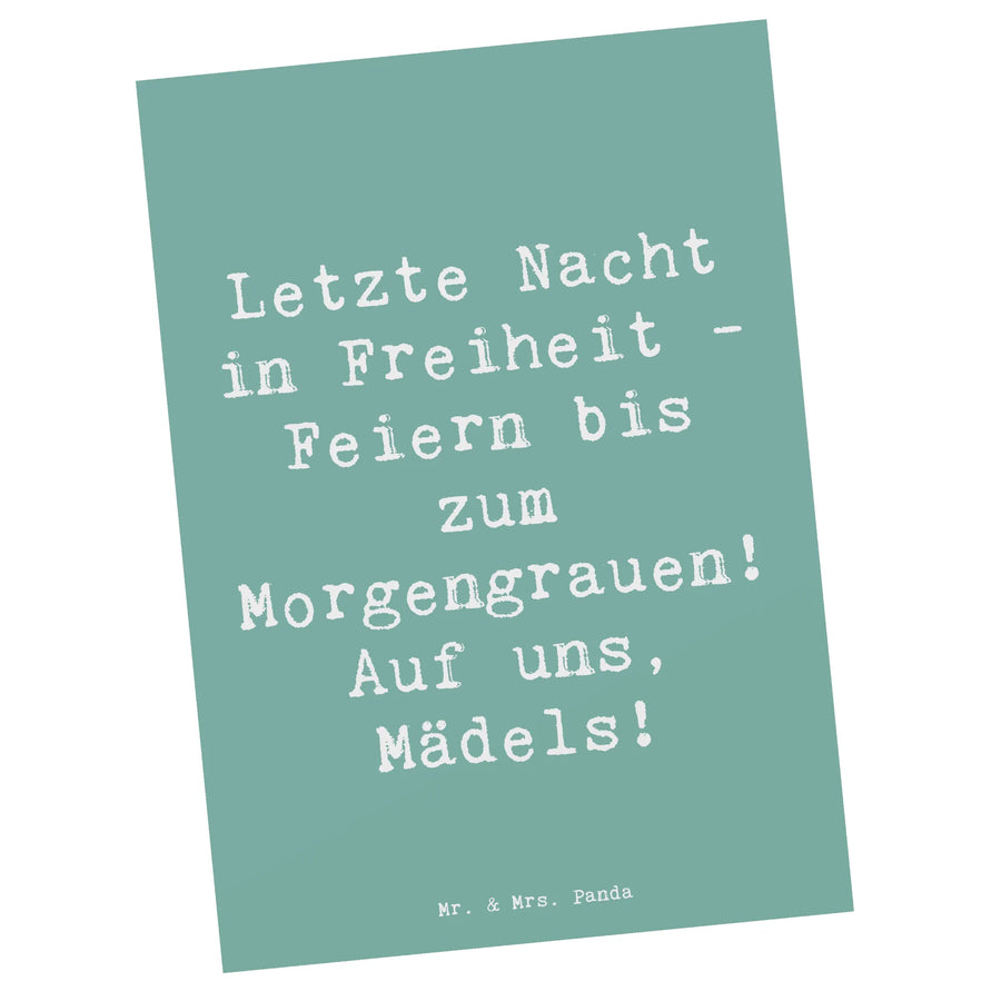 Die perfekte Postkarte zum Junggesellinnenabschied ist endlich da! Diese wundervolle Postkarte von Mr. & Mrs. Panda bringt nicht nur Freude, sondern auch unvergessliche Erinnerungen an einen der aufregendsten Tage im Leben deiner besten Freundin. Mit dem witzigen Spruch „Letzte Nacht in Freiheit - Feiern bis zum Morgengrauen! Auf uns, Mädels!” fängt sie die Stimmung eines unvergesslichen Junggesellinnenabschieds perfekt ein.