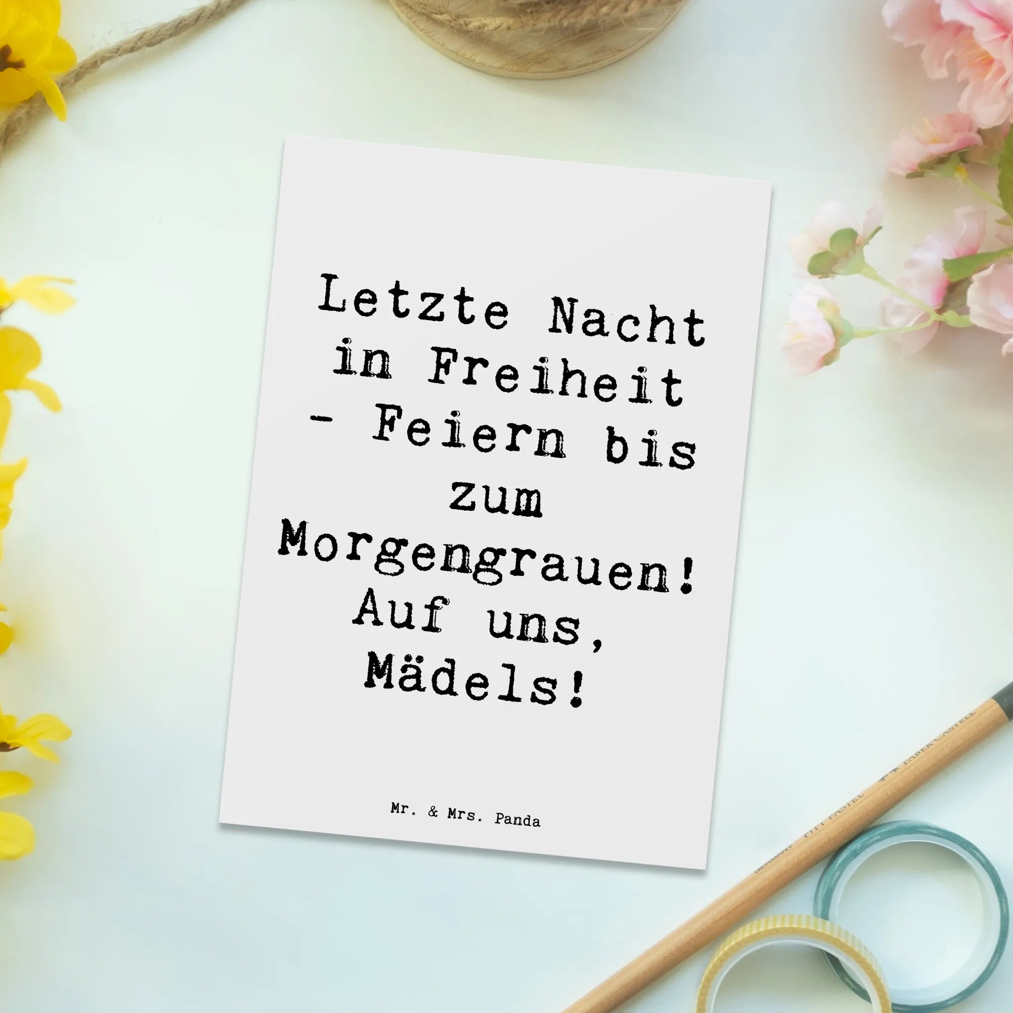 Die perfekte Postkarte zum Junggesellinnenabschied ist endlich da! Diese wundervolle Postkarte von Mr. & Mrs. Panda bringt nicht nur Freude, sondern auch unvergessliche Erinnerungen an einen der aufregendsten Tage im Leben deiner besten Freundin. Mit dem witzigen Spruch „Letzte Nacht in Freiheit - Feiern bis zum Morgengrauen! Auf uns, Mädels!” fängt sie die Stimmung eines unvergesslichen Junggesellinnenabschieds perfekt ein.