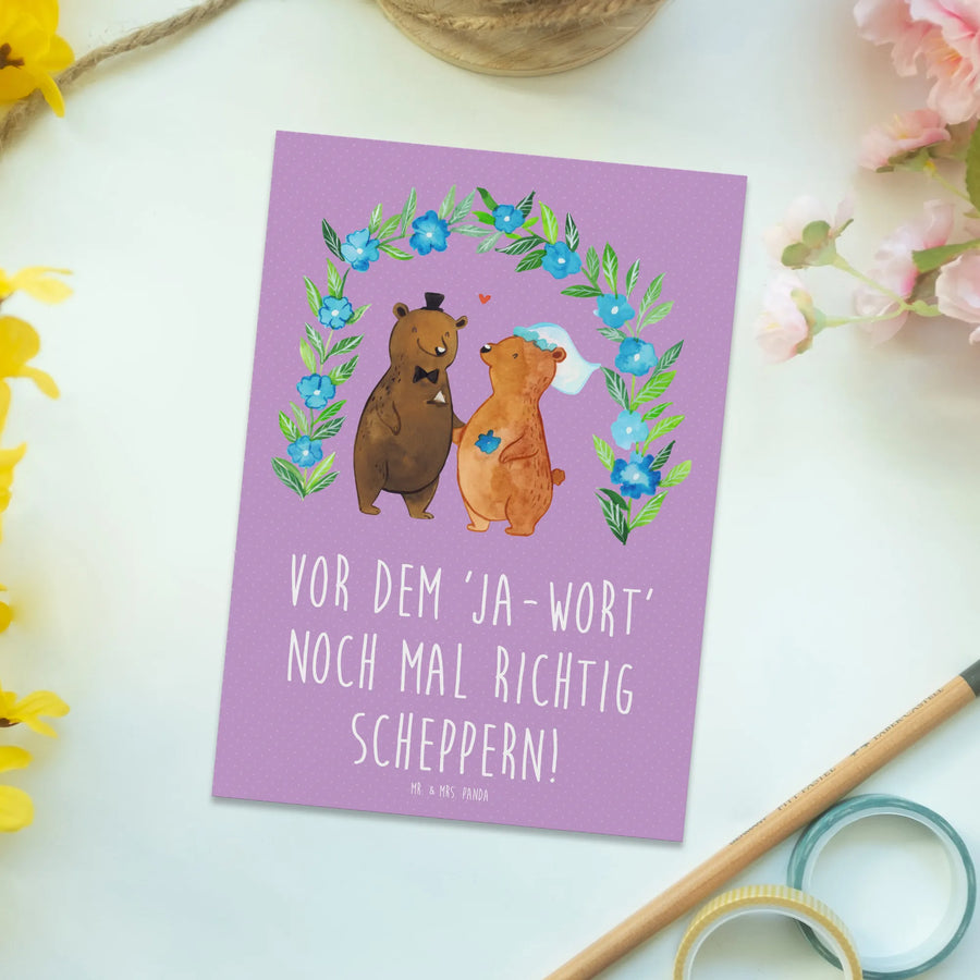 Die perfekte Postkarte für den unvergesslichen Polterabend – eine einzigartige Postkarte von Mr. & Mrs. Panda! Mit dem witzigen Spruch "Vor dem 'Ja-Wort' noch mal richtig scheppern!" sorgt diese Karte nicht nur für Schmunzler, sondern ist auch das ideale Accessoire, um die Vorfreude auf die Hochzeit gebührend zu feiern.