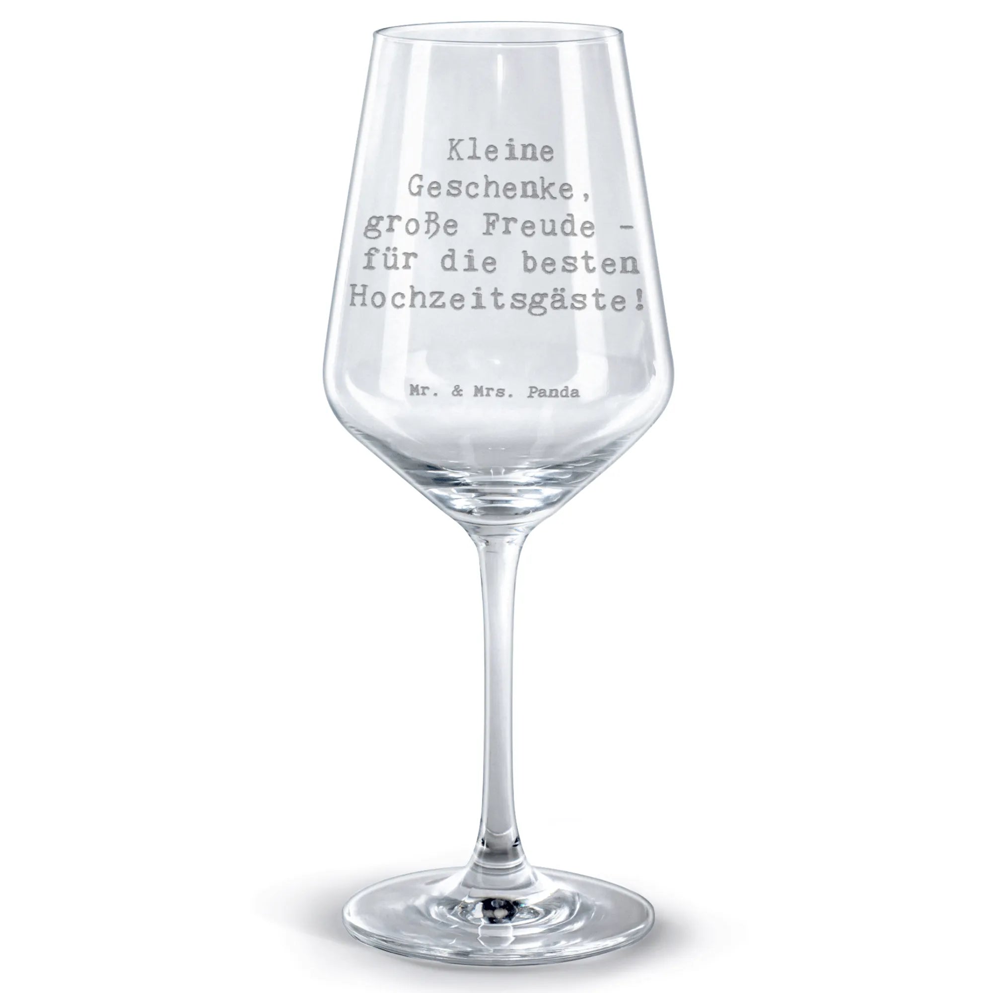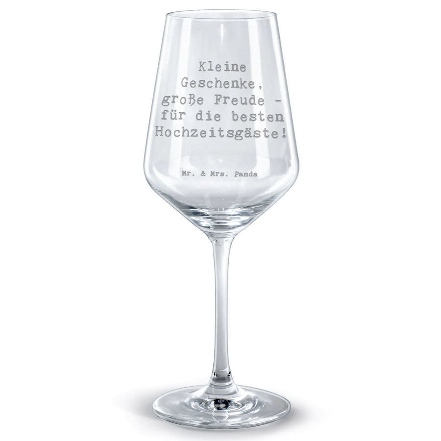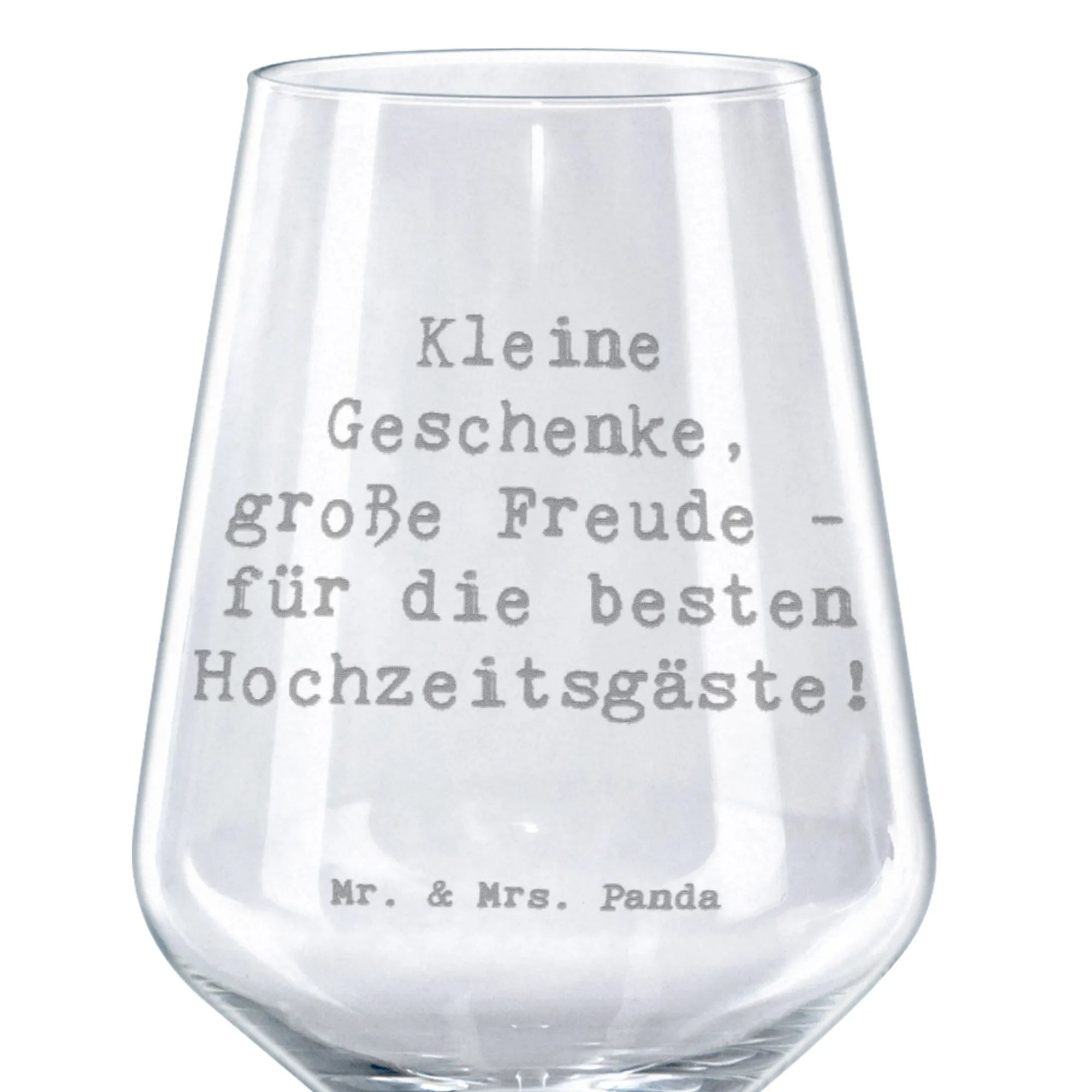 Die Gravur trägt den liebevollen Spruch „Kleine Geschenke, große Freude - für die besten Hochzeitsgäste!”, der die perfekte Botschaft für den besonderen Tag vermittelt! Darum wird dieses Weinglas sofort zum Lieblingsstück in jeder Sammlung hochwertiger Weinaccessoires. Es ist außerdem spülmaschinengeeignet, sodass die Pflege kinderleicht ist.