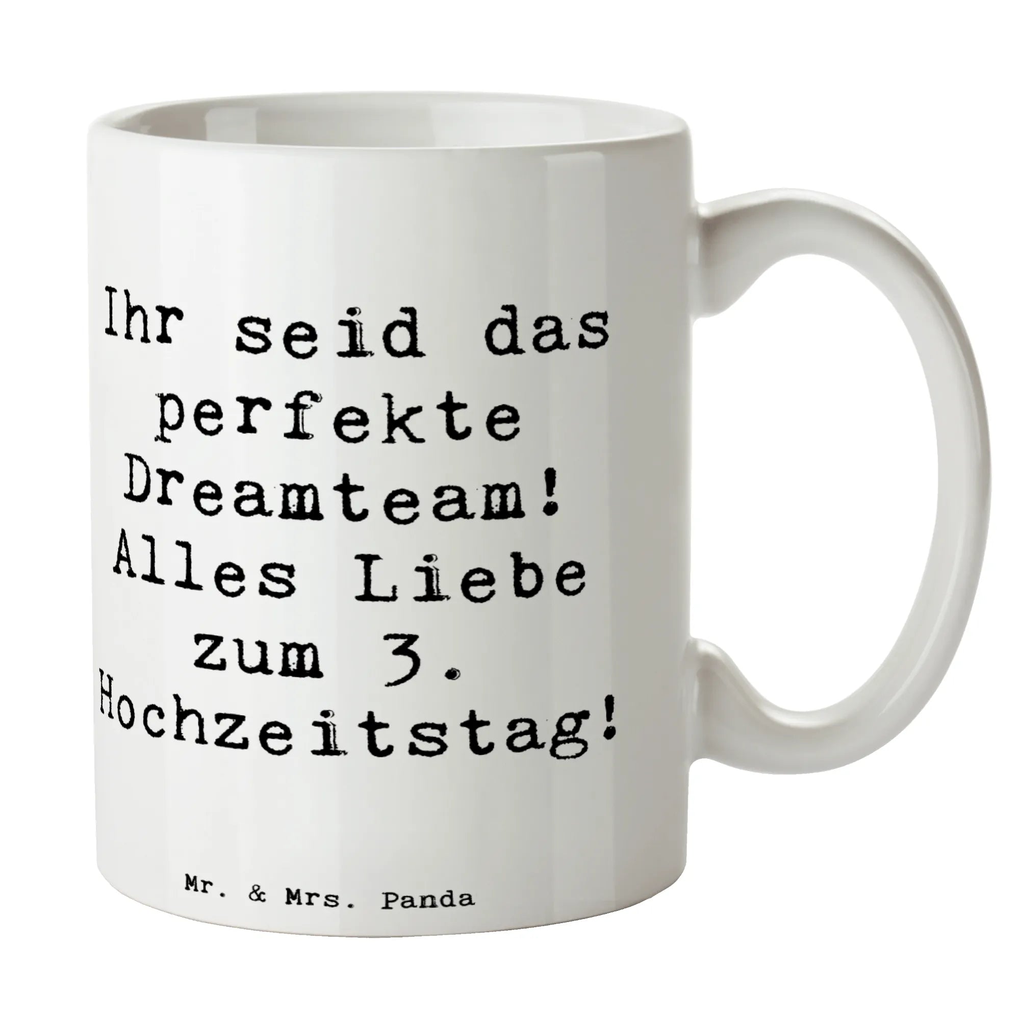 Entdecke die bezaubernde Tasse zum 3. Hochzeitstag Lederhochzeit aus der Hochzeitskollektion von Mr. & Mrs. Panda - das perfekte Geschenk für das glückliche Paar! Diese exquisite spülmaschinenfeste Keramiktasse strahlt mit ihrem liebevollen Spruch: 'Ihr seid das perfekte Dreamteam! Alles Liebe zum 3. Hochzeitstag!' in einem frischen und modernen Design.