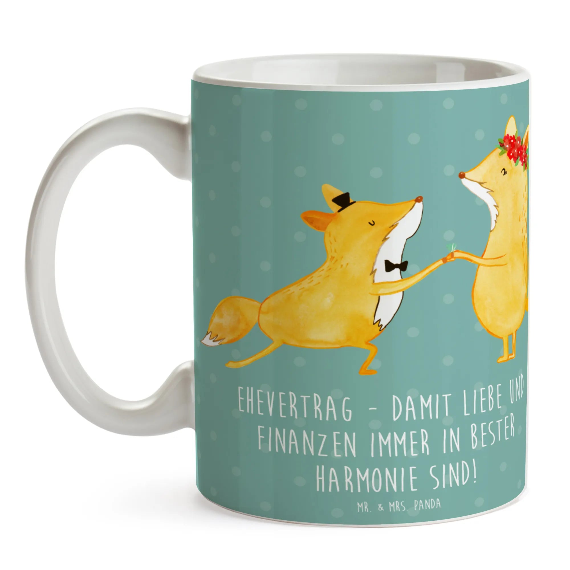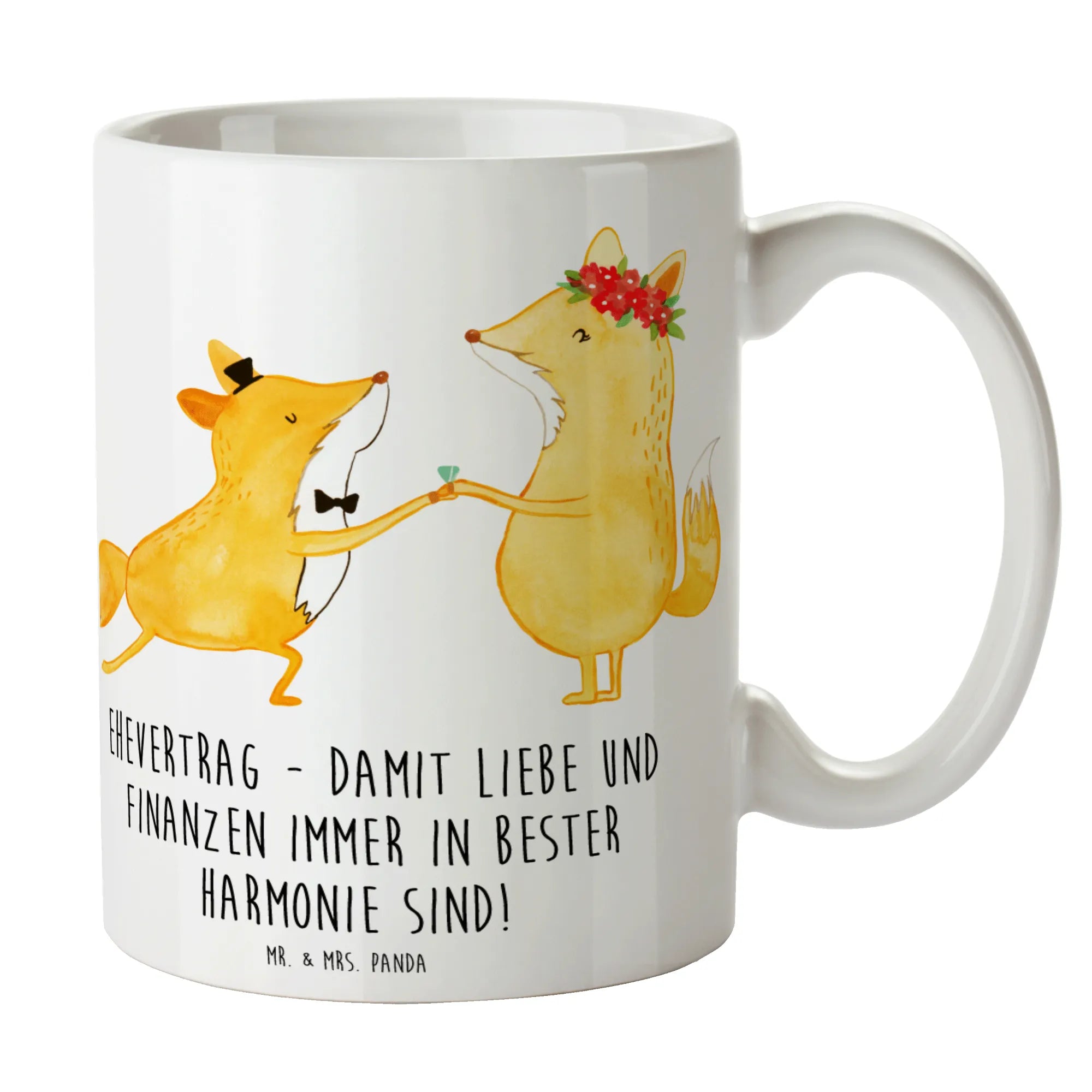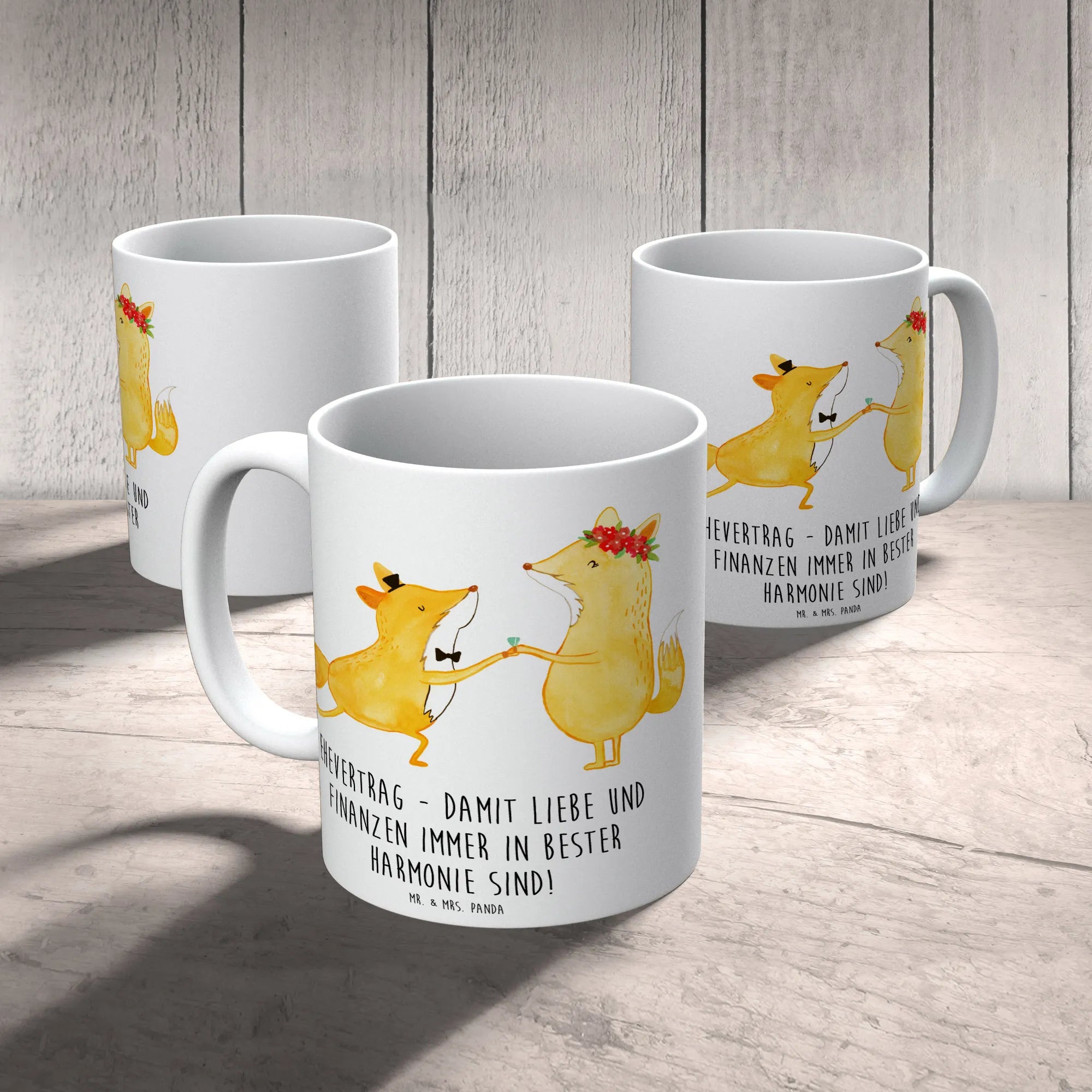 Du suchst das perfekte Geschenk für frisch Verheiratete oder angehende Brautpaare? Unsere wunderschöne Kaffeetasse aus der Hochzeitskollektion von Mr. & Mrs. Panda mit dem Motiv "Ehevertrag - Damit Liebe und Finanzen immer in bester Harmonie sind!" ist genau das Richtige! Diese Keramiktasse ist nicht nur ein stilvolles Accessoire für die jüngsten Eheleute, sondern auch ein praktisches Geschenk, das ihre Strahlendheit jeden Morgen beim Kaffee oder Tee hervorrufen wird. Mit einem Fassungsvermögen von 325 ml eignet sie sich wunderbar für jede Art von Heißgetränk, sei es eine belebende Tasse Kaffee oder ein wohltuender Tee.